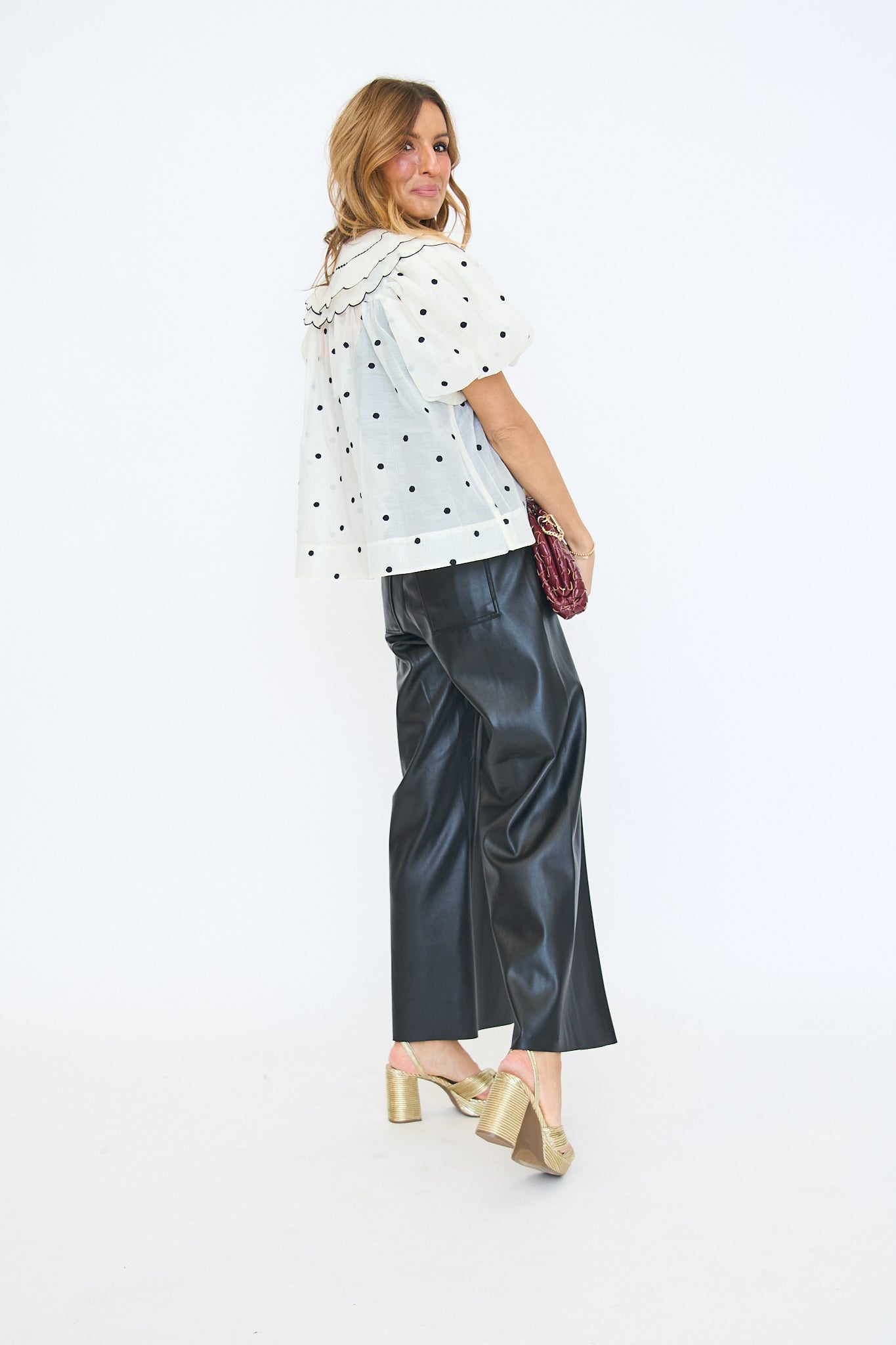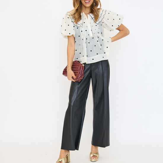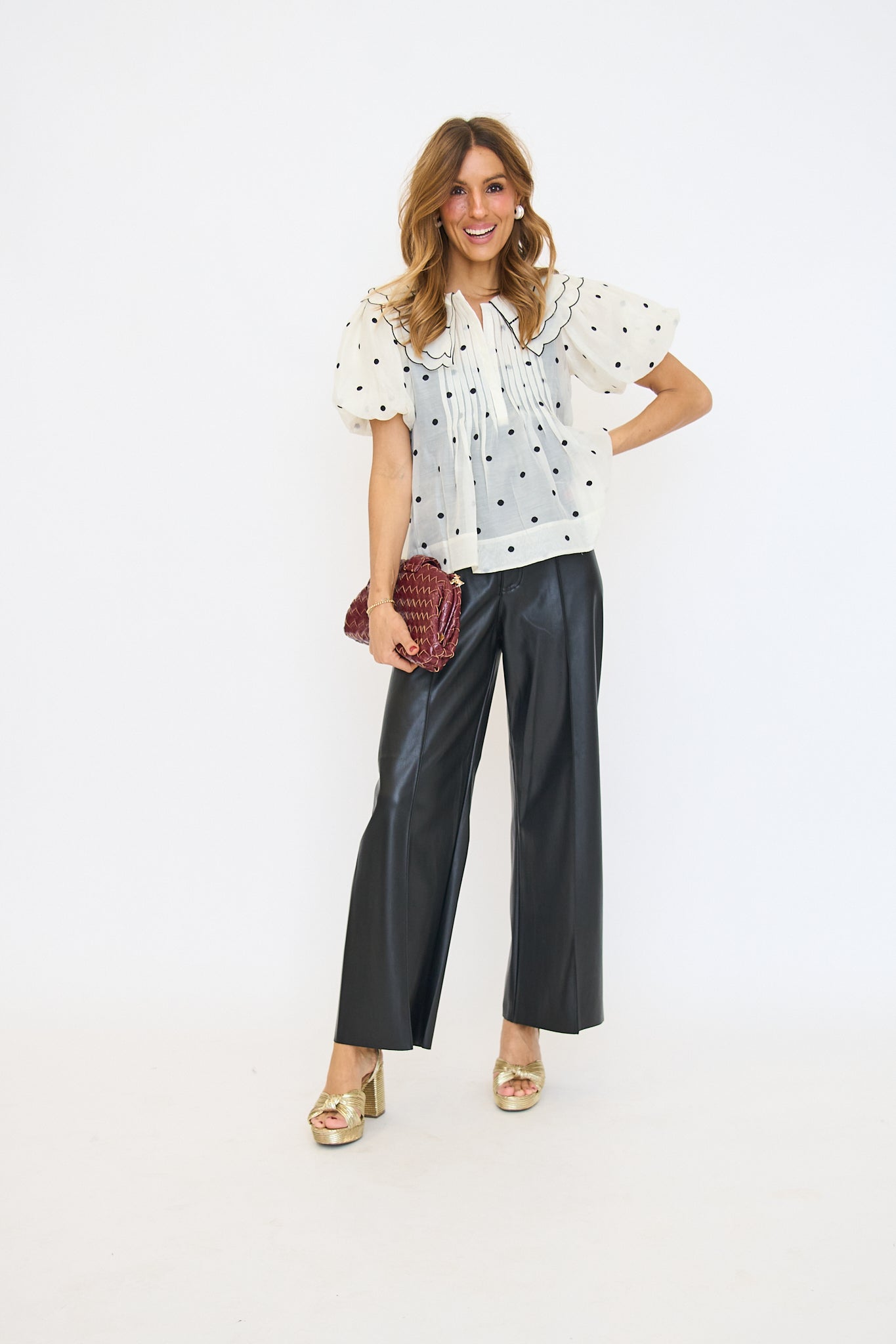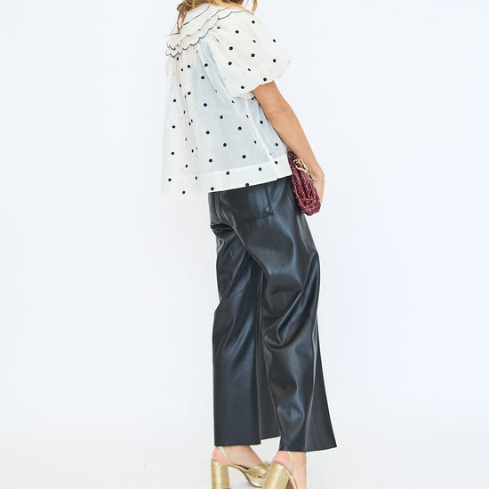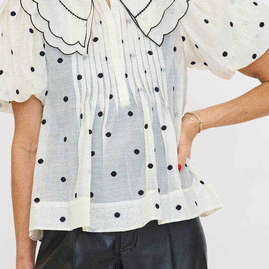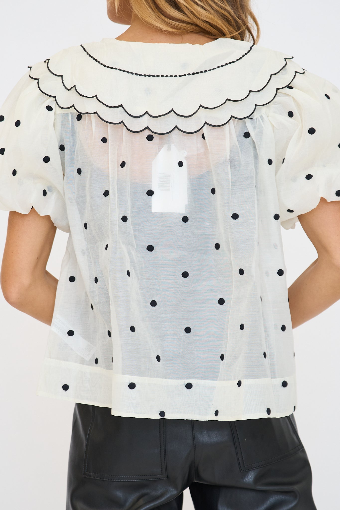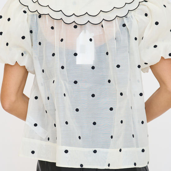Bring playful elegance to your wardrobe with our Scalloped Collar Sheer Polka Dot Blouse. Designed with a statement scalloped collar, airy sheer fabric, and timeless polka dots, this top is both feminine and chic. The puff sleeves add volume and charm, while the lightweight fit makes it perfect for layering. Pair it with jeans for an effortless daytime look or dress it up with a skirt for refined style. A versatile blouse that transitions easily from casual to polished.