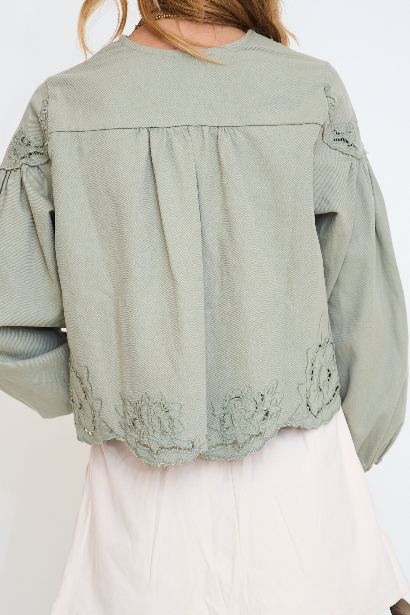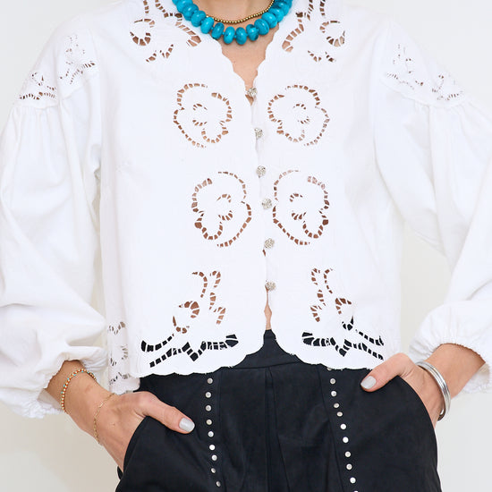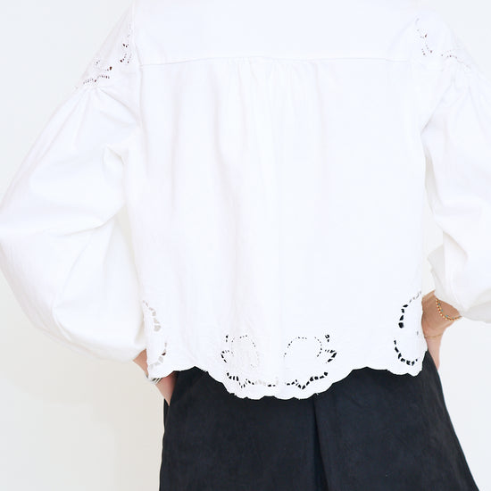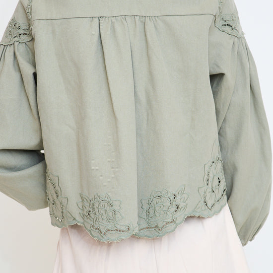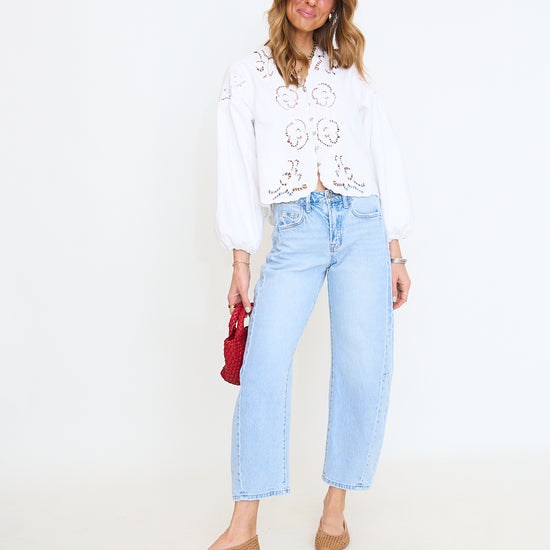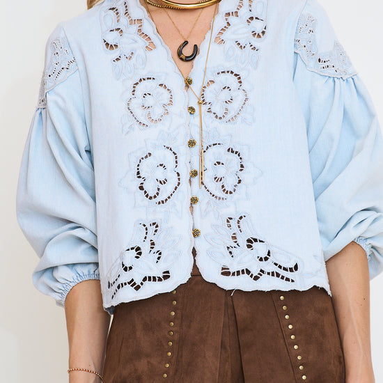 This light-wash denim blouse features intricate floral embroidery and delicate cutouts, adding a feminine touch to its relaxed silhouette. The V-neckline and button-down front create a classic look, while the balloon sleeves with elastic cuffs provide a trendy and comfortable fit.