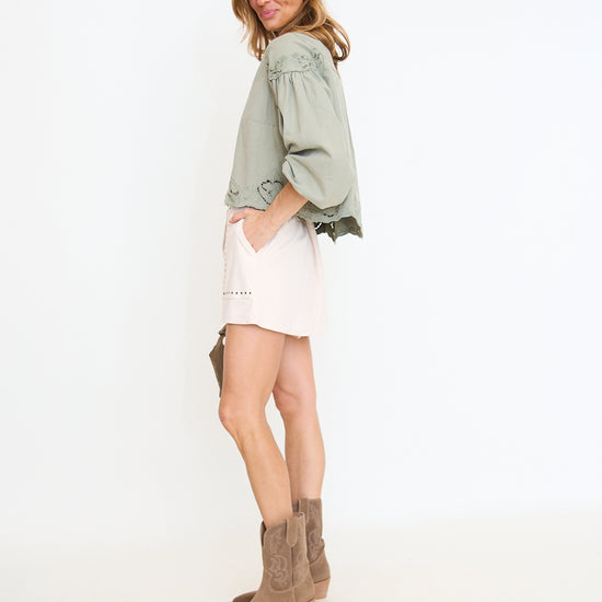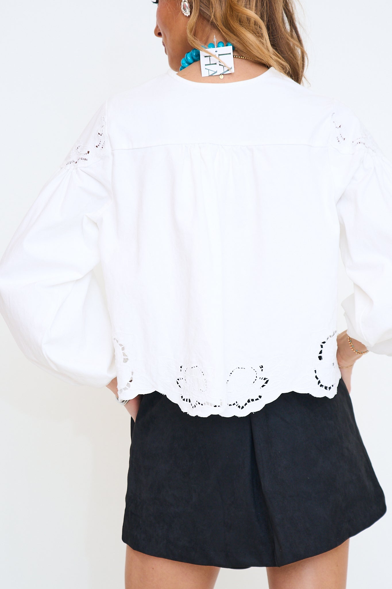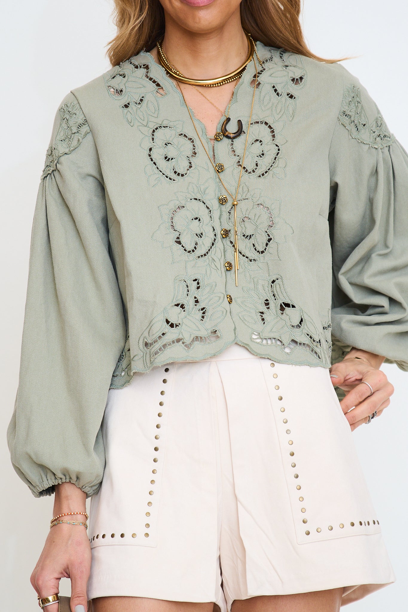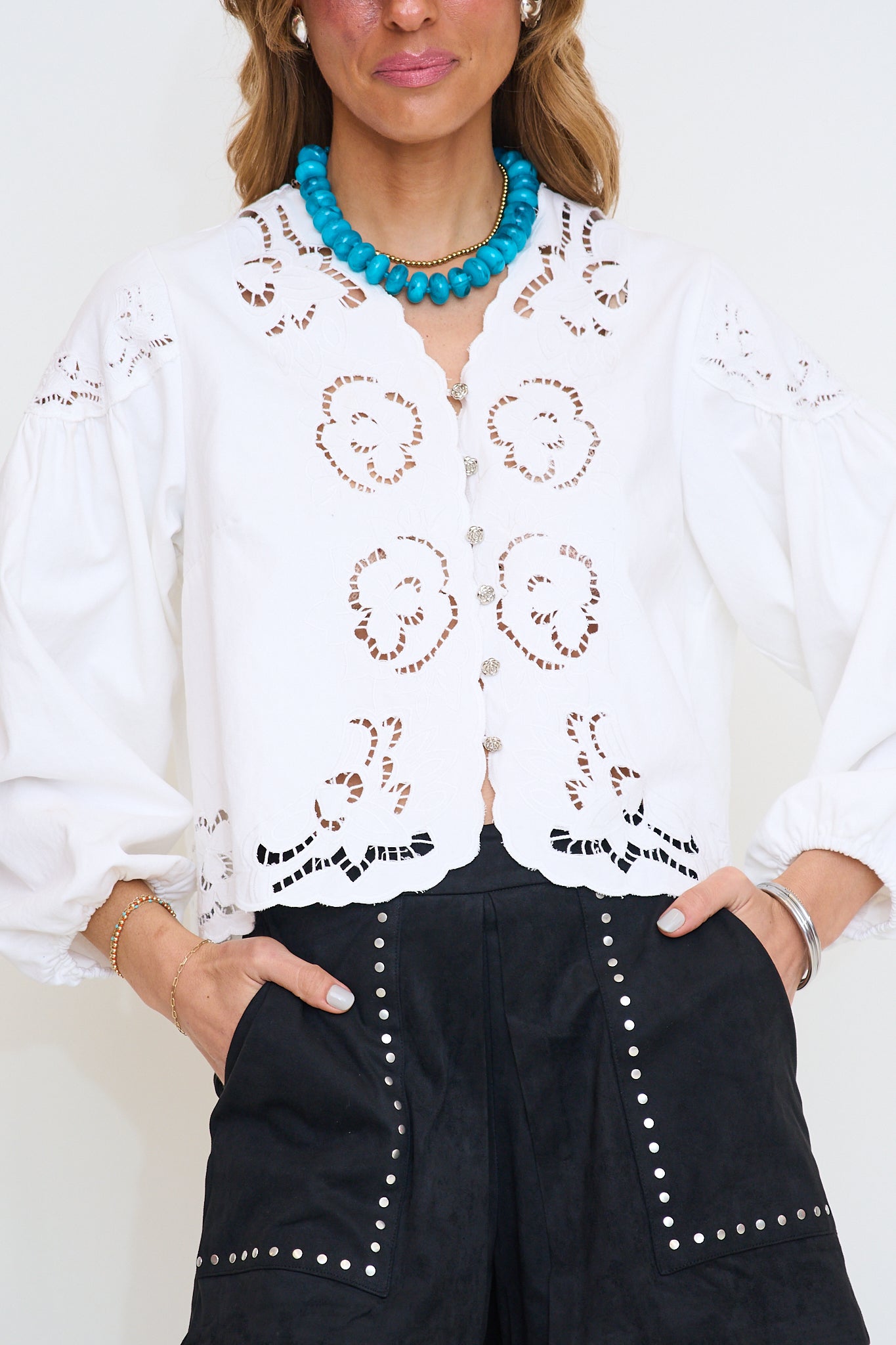This light-wash denim blouse features intricate floral embroidery and delicate cutouts, adding a feminine touch to its relaxed silhouette. The V-neckline and button-down front create a classic look, while the balloon sleeves with elastic cuffs provide a trendy and comfortable fit.