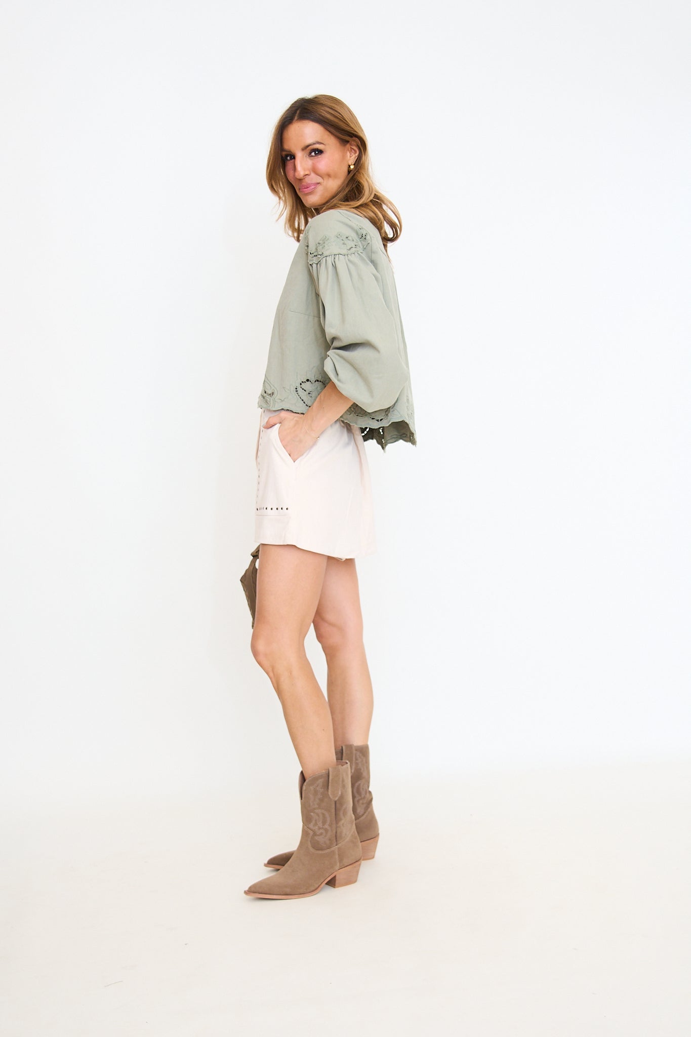 Fit is true to size. Rachel is 5'8 and wearing a size small. Size down if in between!