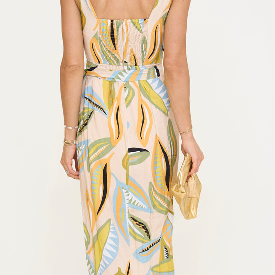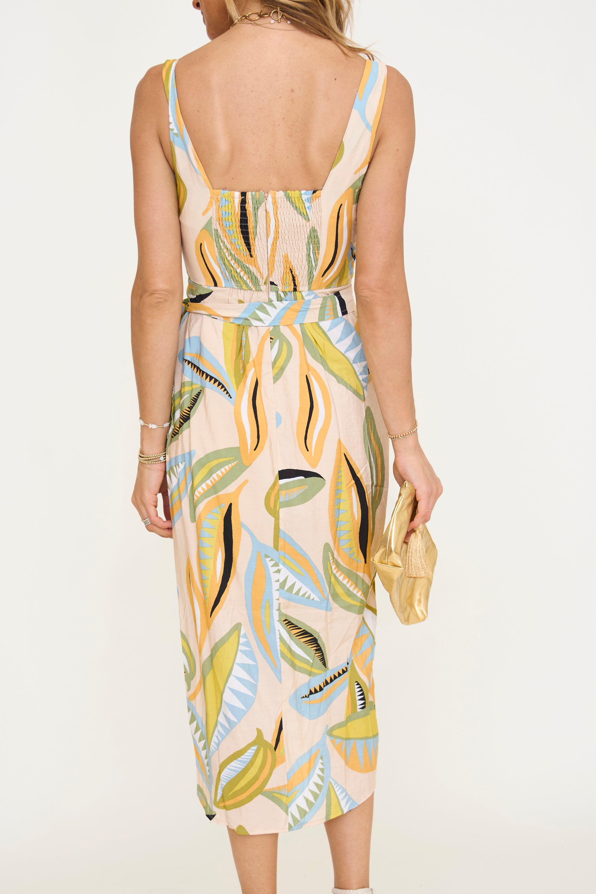 Fun and tropical, this dress features a square neckline, smocked back, and faux wrap detail with self tie.