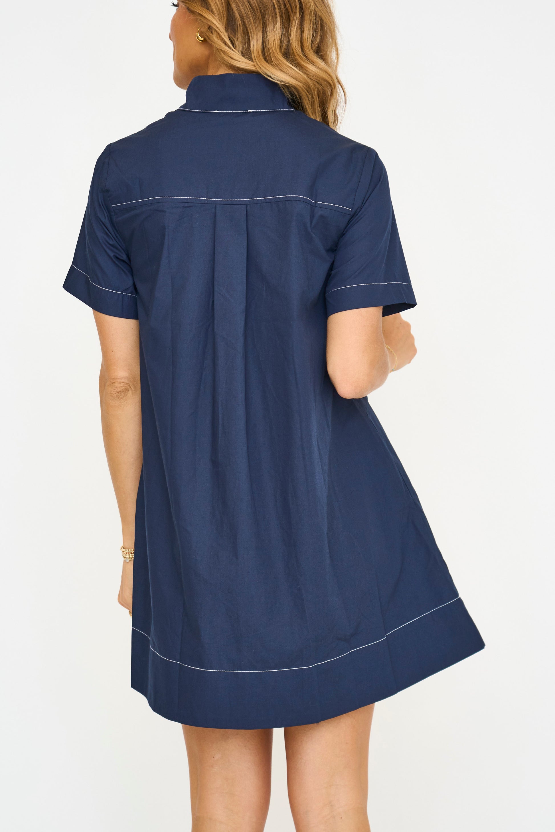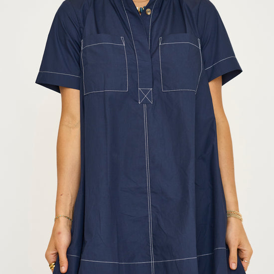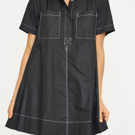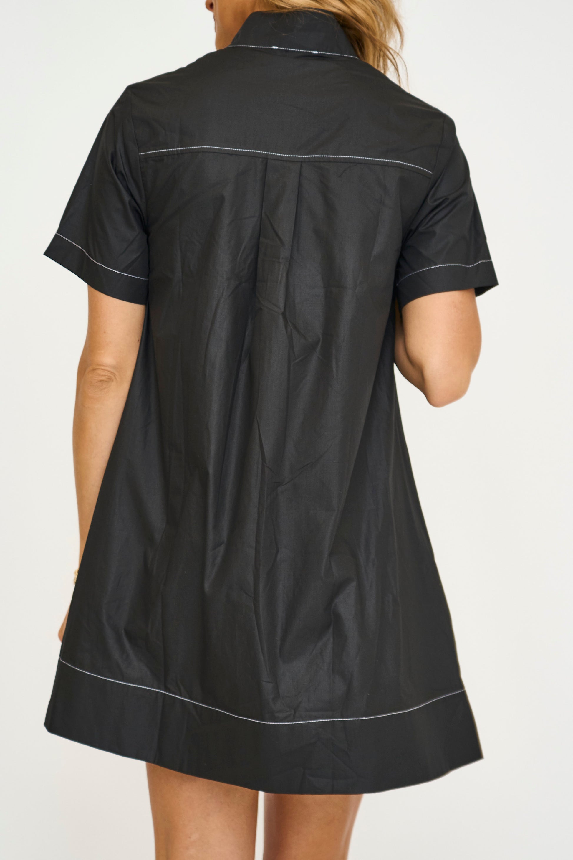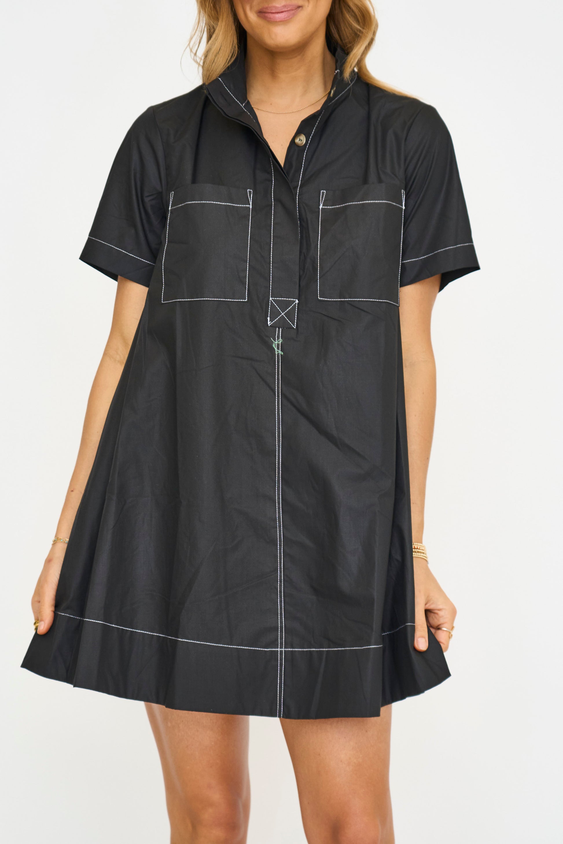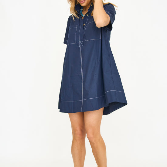 Solid high neck short sleeve front half placket button swing mini dress. Pockets at chest and side. Lined. Woven. Non-sheer. Lightweight.