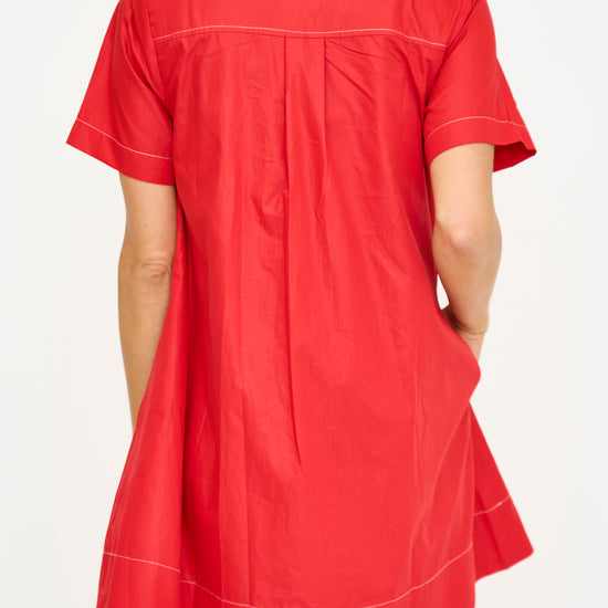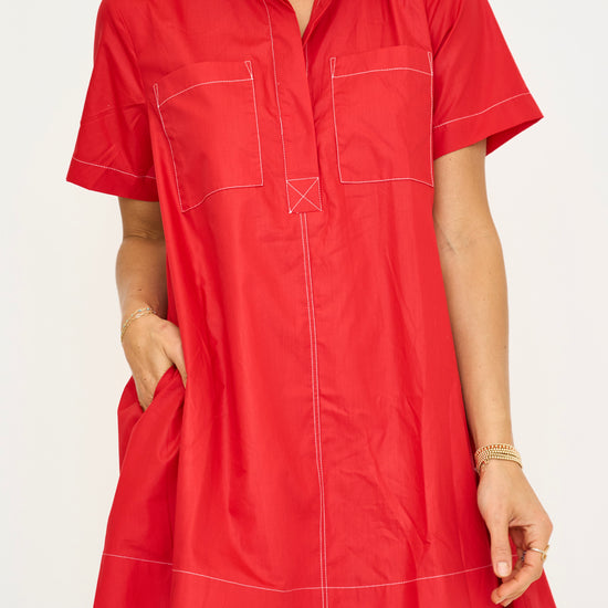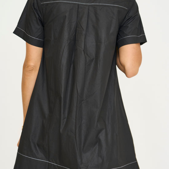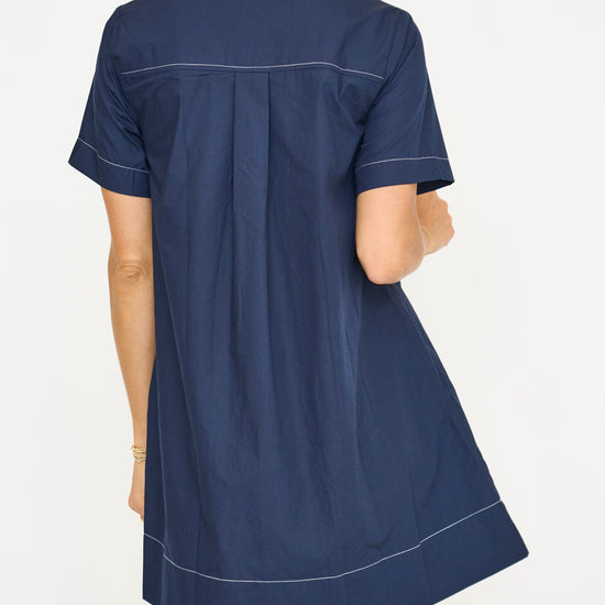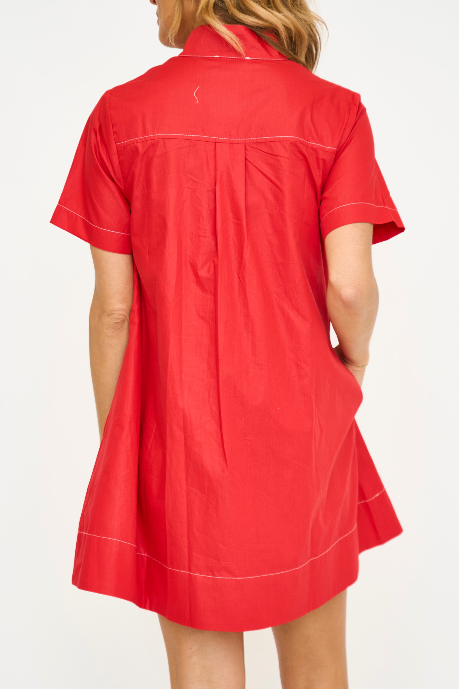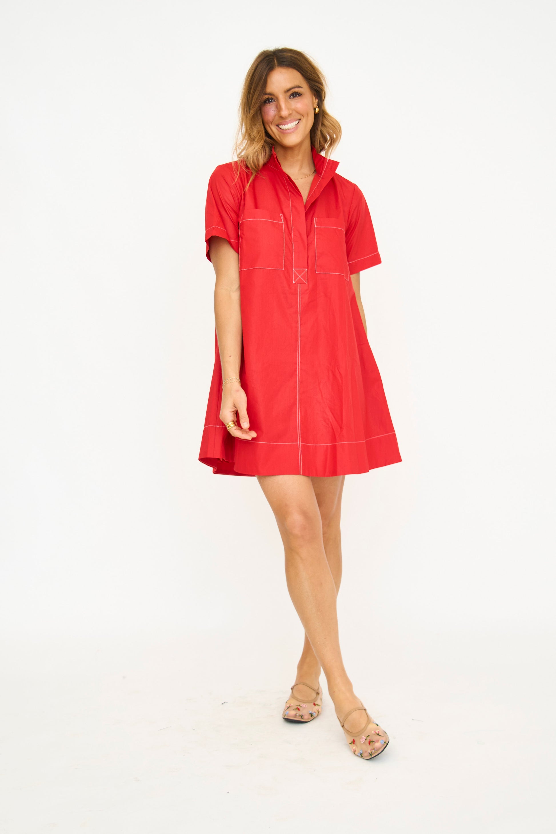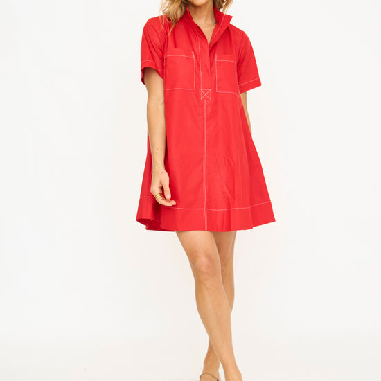Solid high neck short sleeve front half placket button swing mini dress. Pockets at chest and side. Lined. Woven. Non-sheer. Lightweight.
