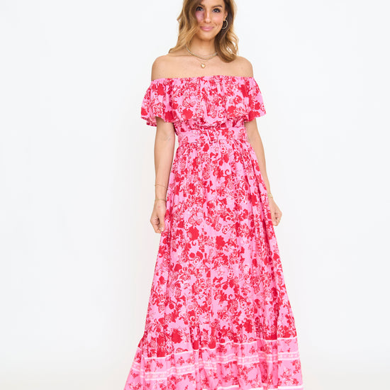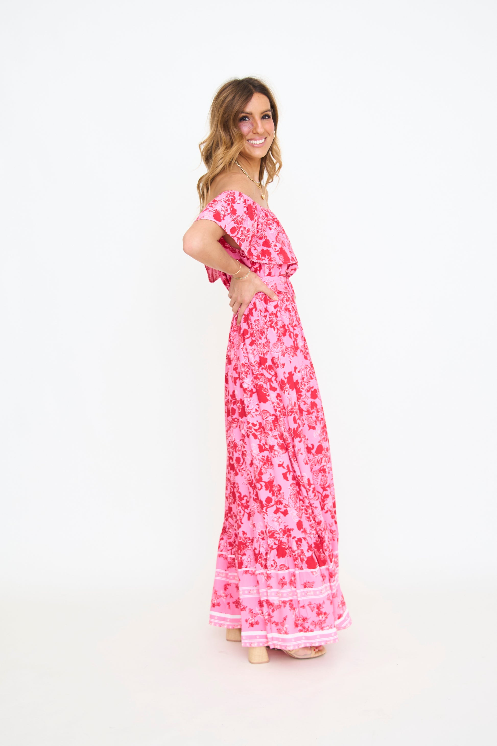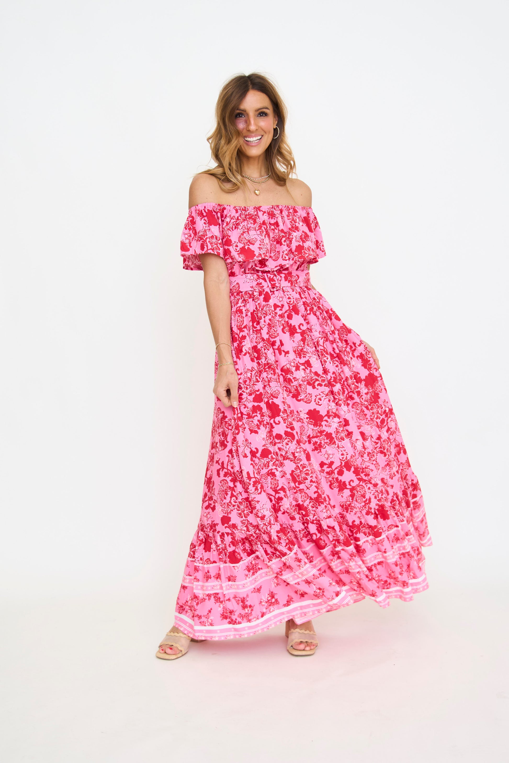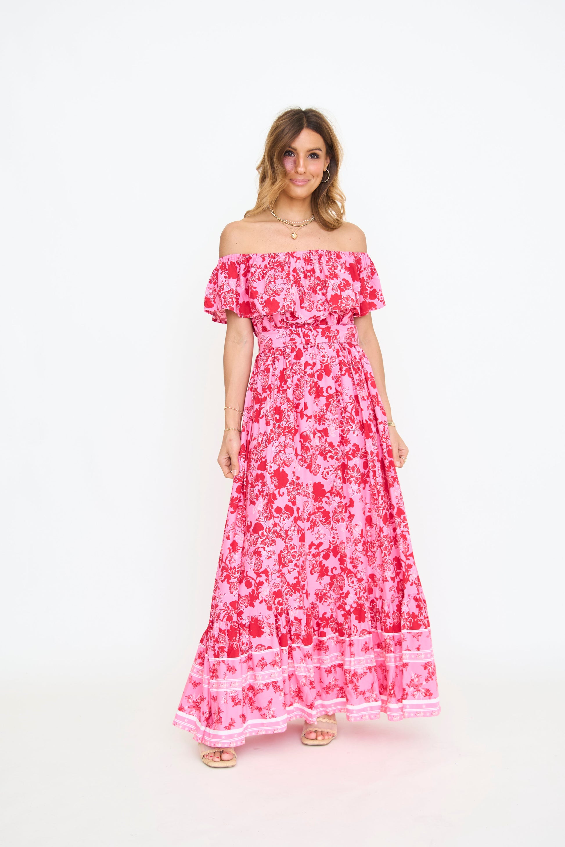 Give a warm welcome to the beautiful Aiza Floral Otis Off the Shoulder Maxi Dress. Red florals take on this pink maxi dress with an off the shoulder look and an elastic waist band. The bottom ruffle hem has a border design. Looks great with heels or sandals.