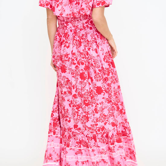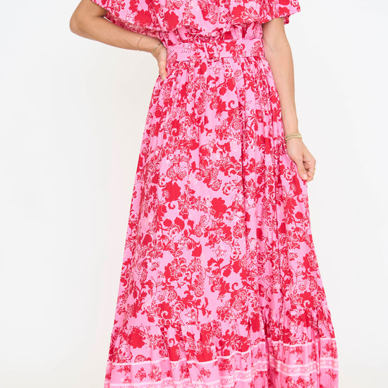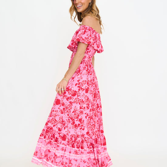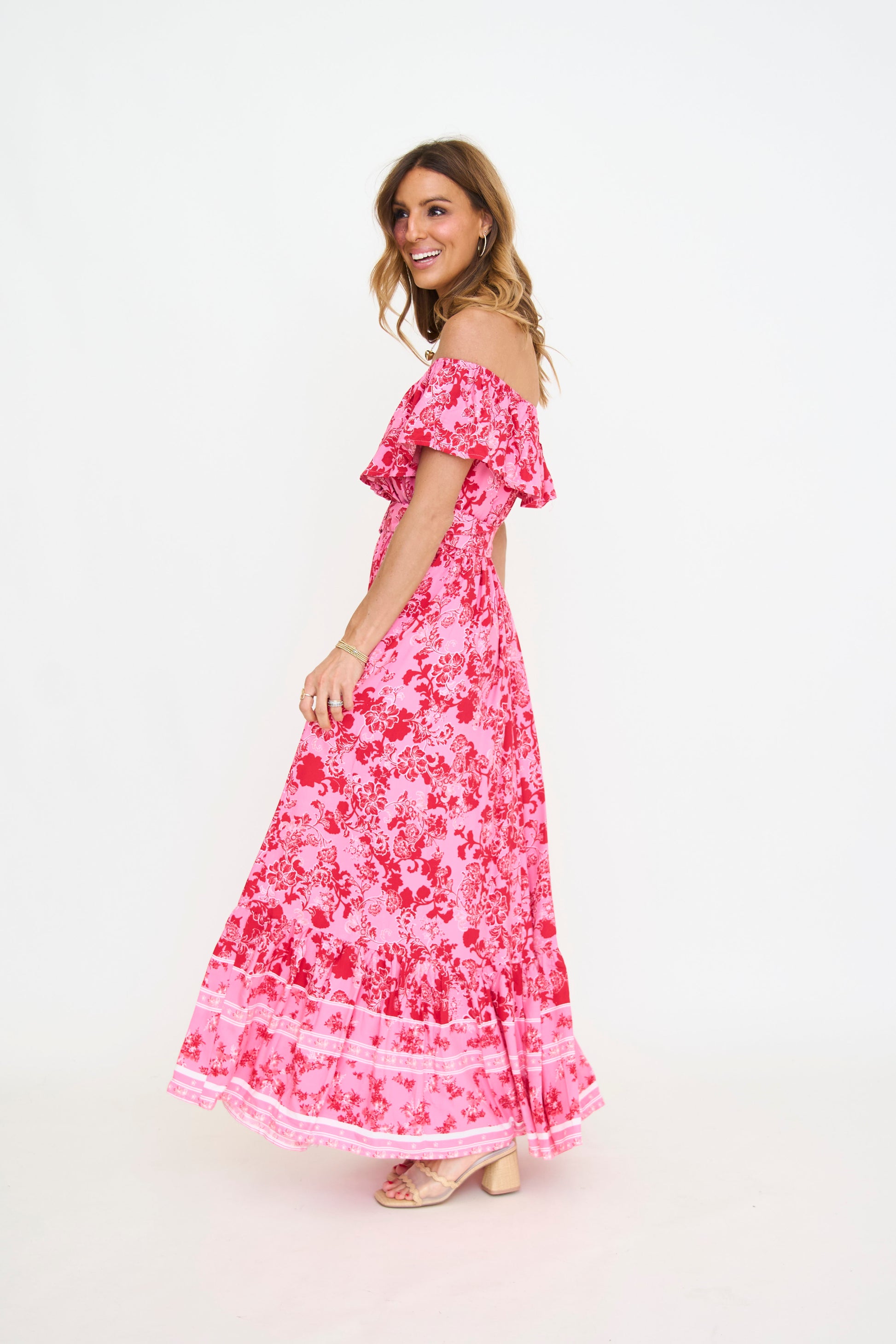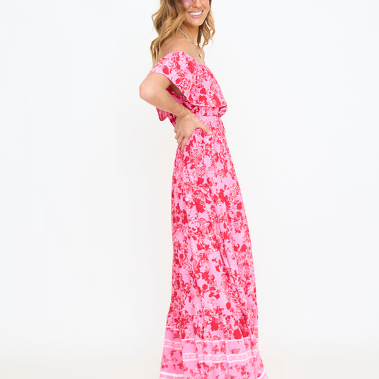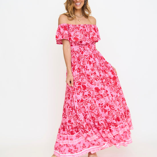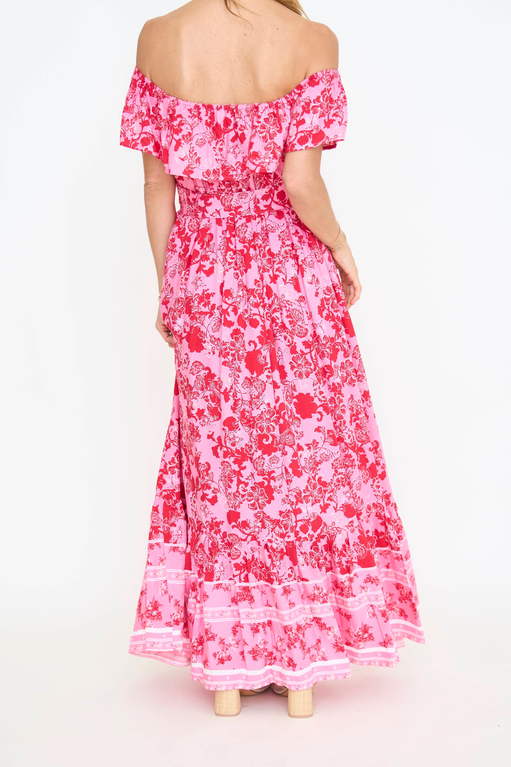 Give a warm welcome to the beautiful Aiza Floral Otis Off the Shoulder Maxi Dress. Red florals take on this pink maxi dress with an off the shoulder look and an elastic waist band. The bottom ruffle hem has a border design. Looks great with heels or sandals.