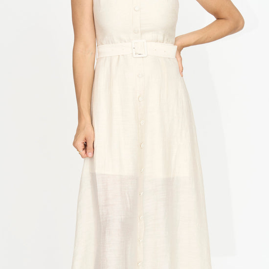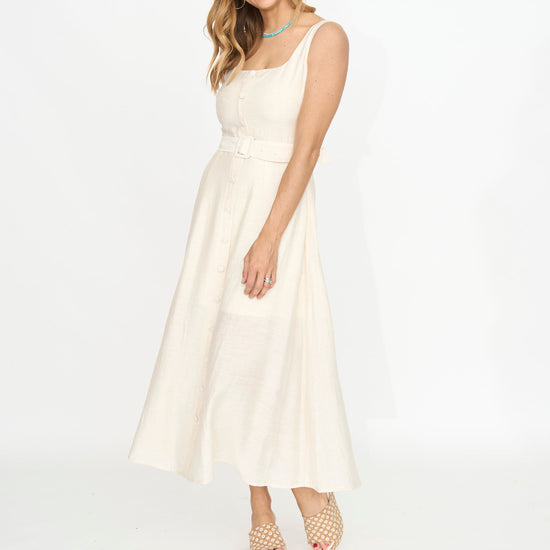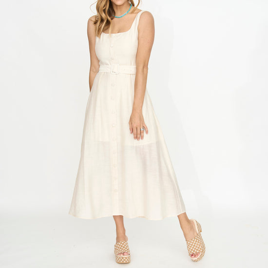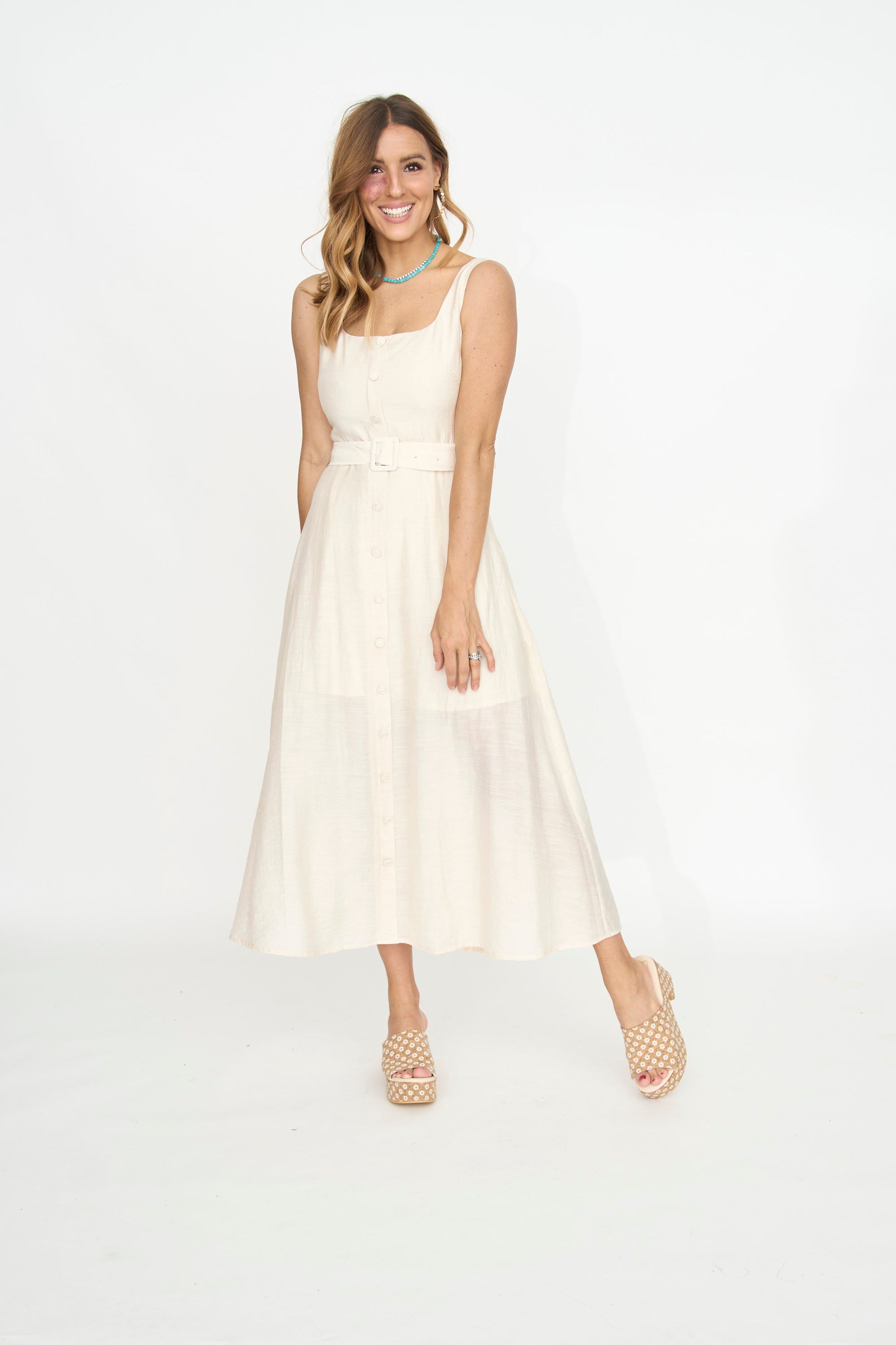 A very classy and feminine dress! Wide shoulder straps, button front (non functional), belted waist and aline silhouette come together making the perfect Spring dress.