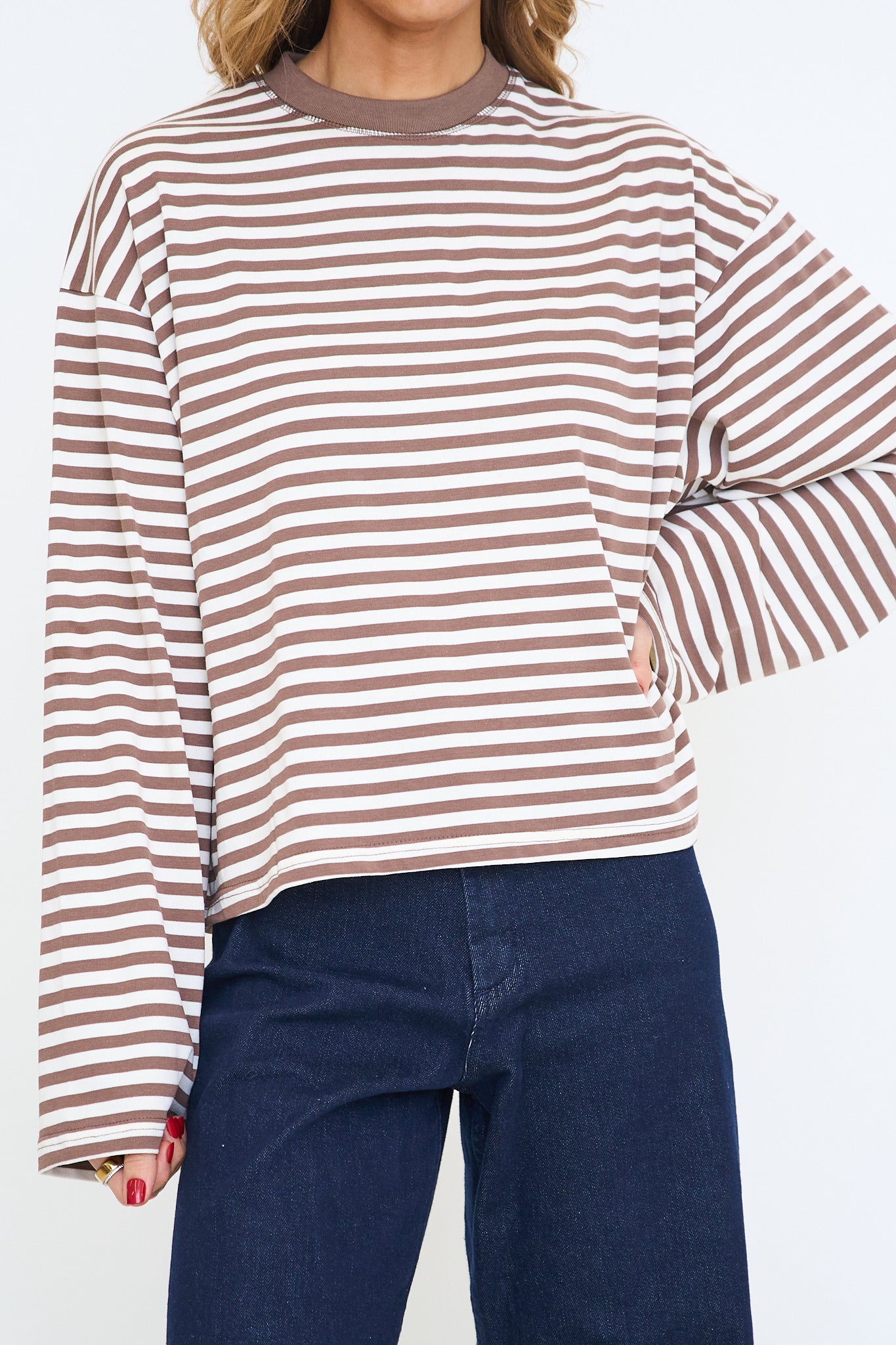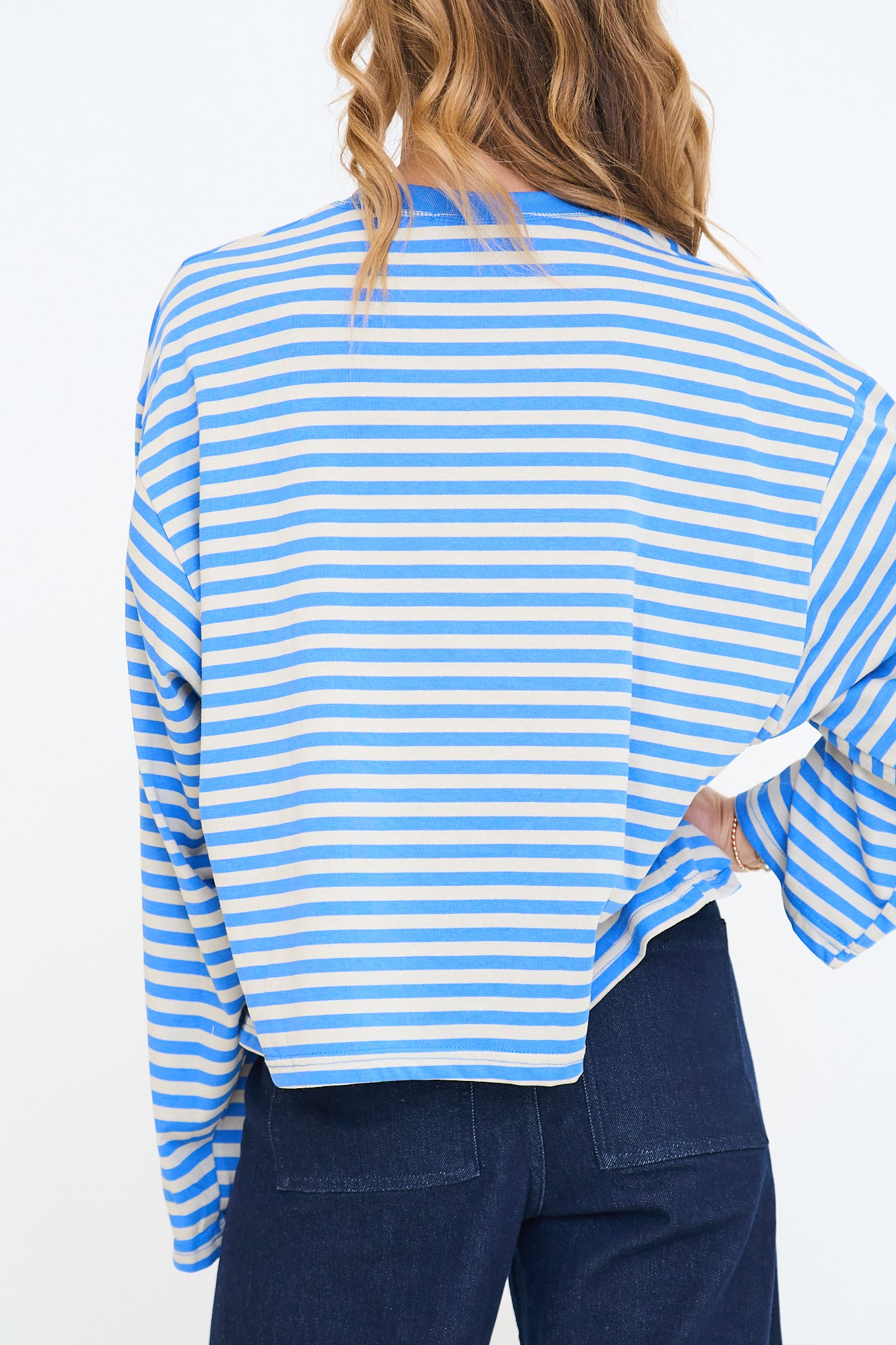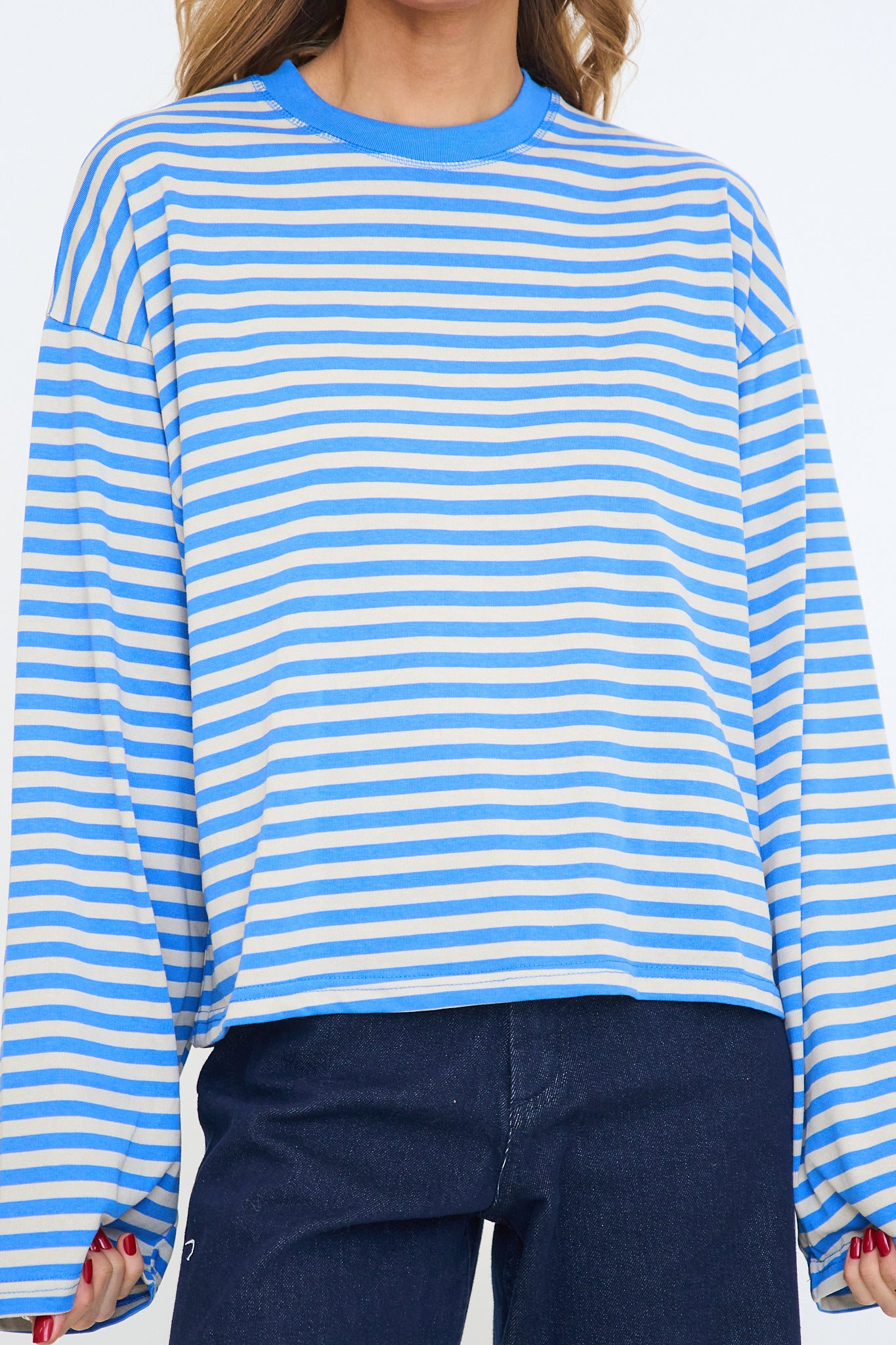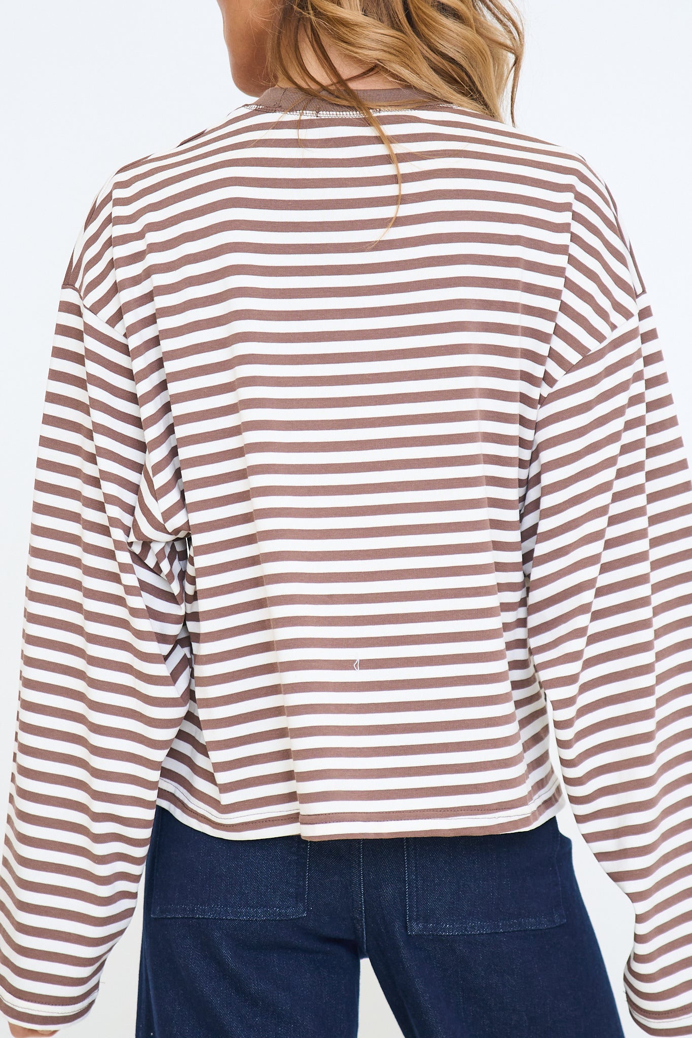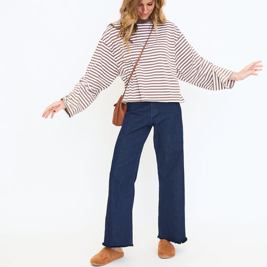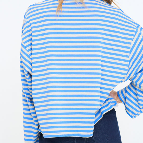 Our Anna Stripe Long-Sleeve Top features a relaxed, oversized fit with dropped shoulders for an easy, laid-back look and a soft horizontal stripe pattern that adds a casual, everyday feel.