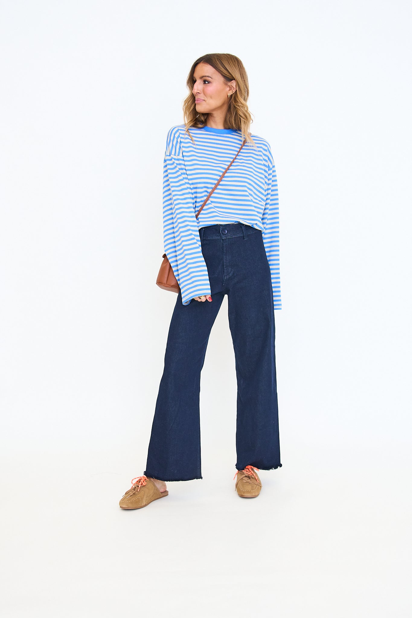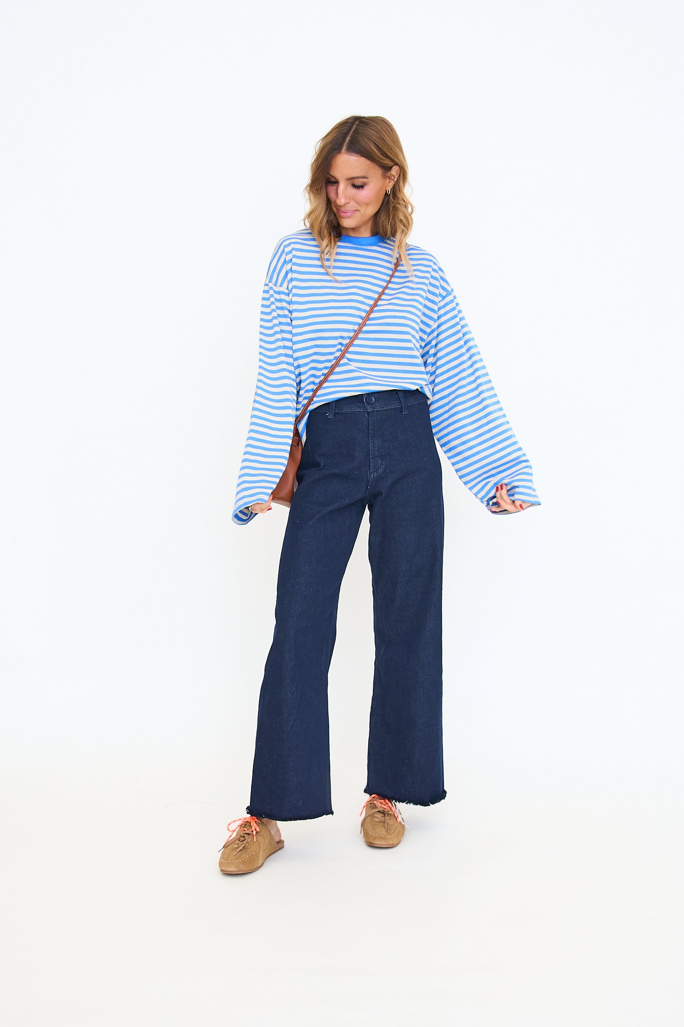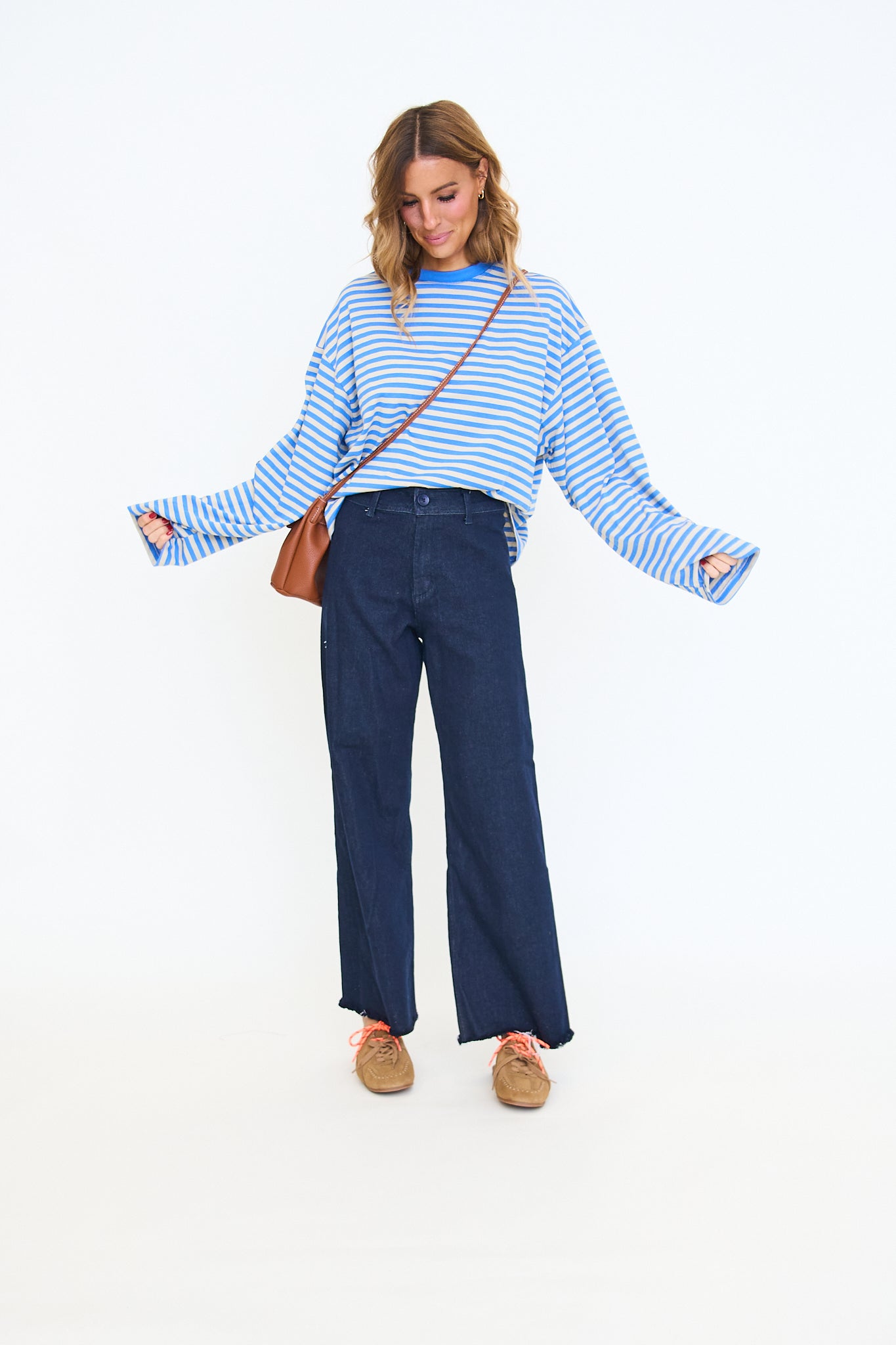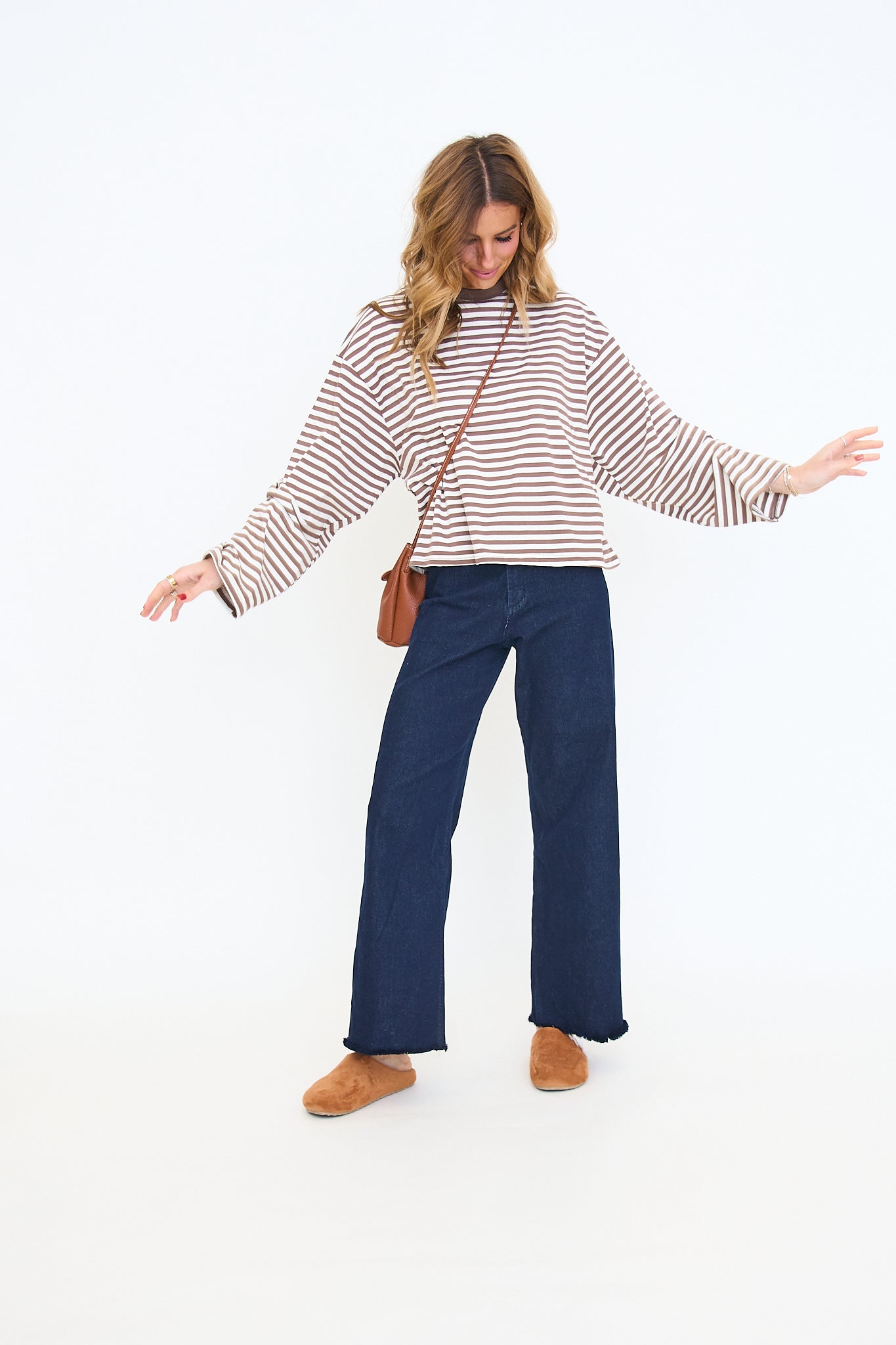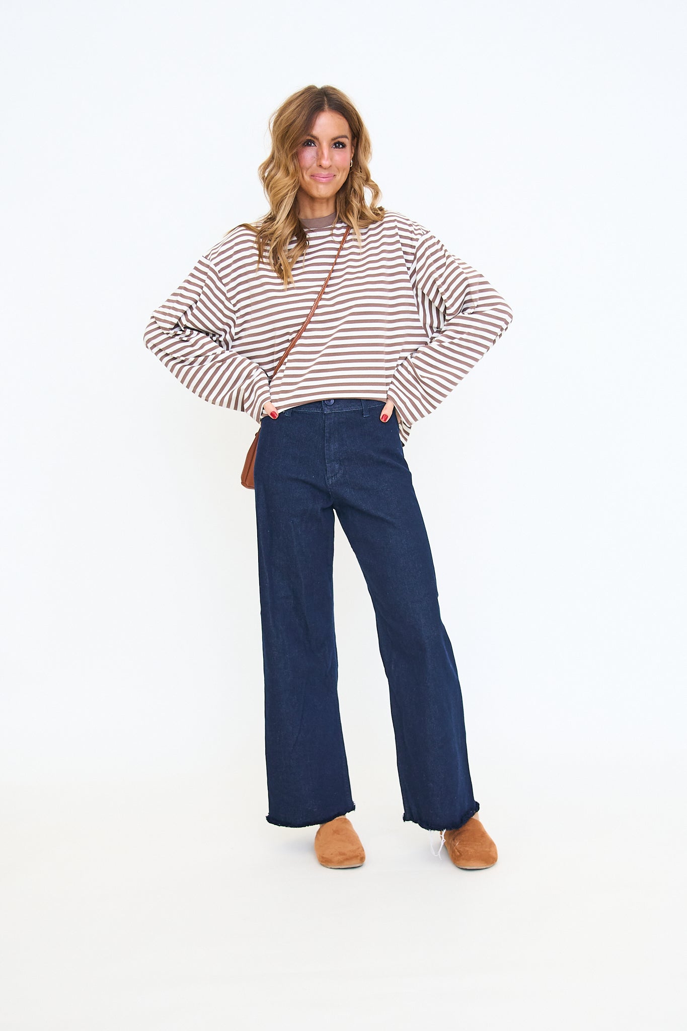 Our Anna Stripe Long-Sleeve Top features a relaxed, oversized fit with dropped shoulders for an easy, laid-back look and a soft horizontal stripe pattern that adds a casual, everyday feel.