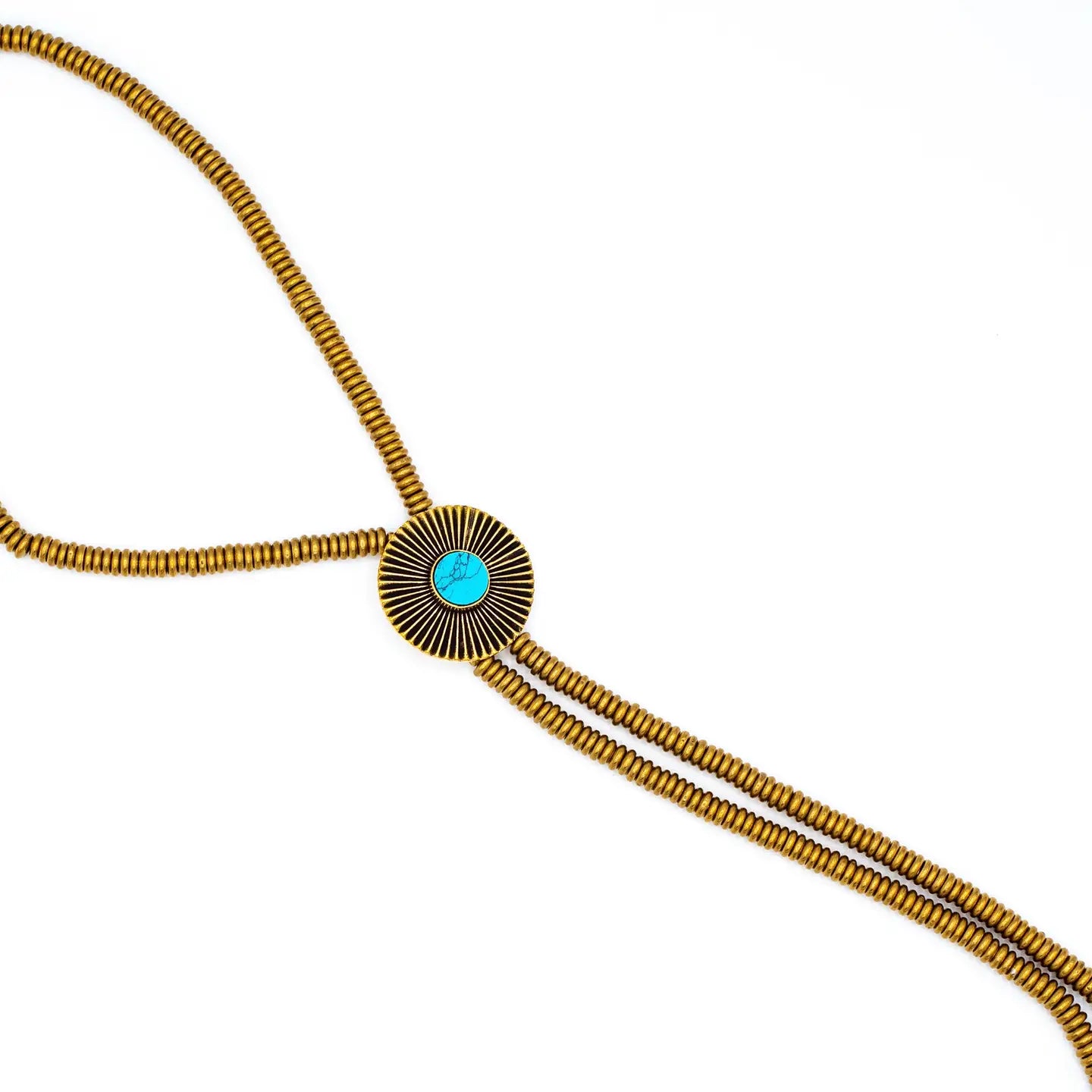 Stunning brass beaded bolo style necklace featuring sun burst turquoise pendant. 20 inch length to pendant, full length with tassels is 38 inches.