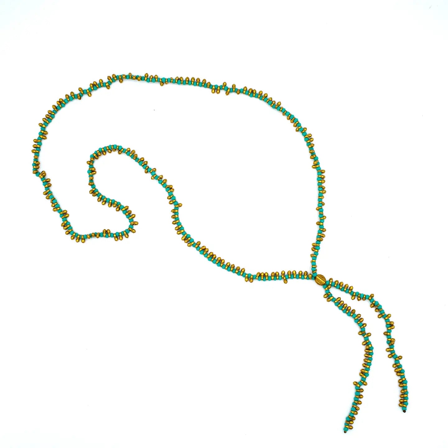Brass & glass beaded bolo style necklace in turquoise. 25 inch length to circular bead, full length with tassels is 34 inches.