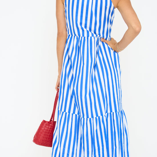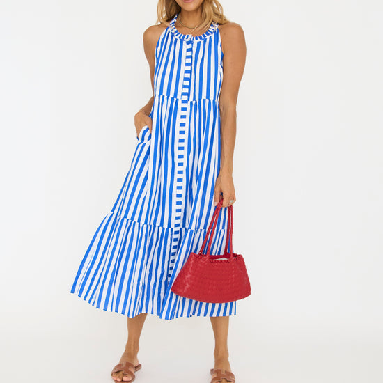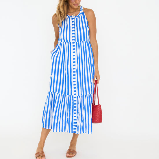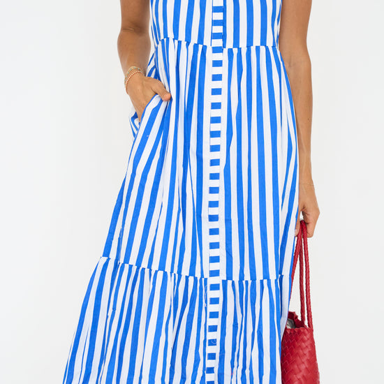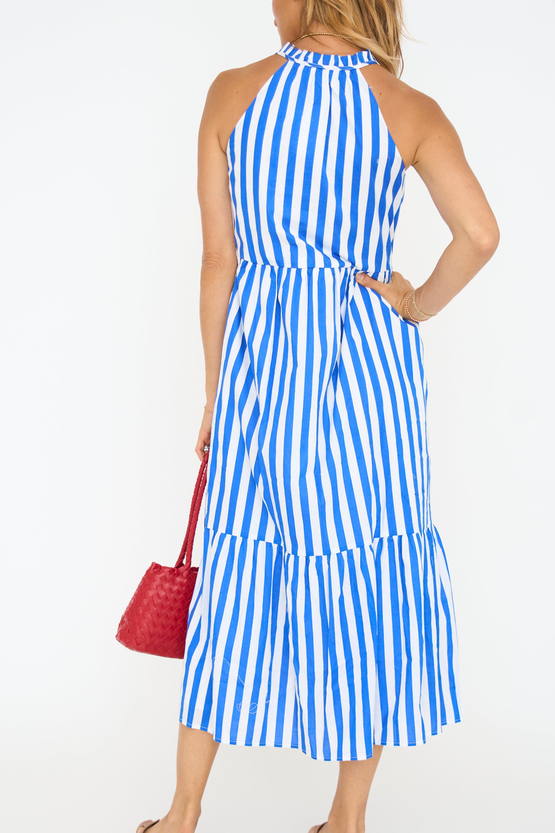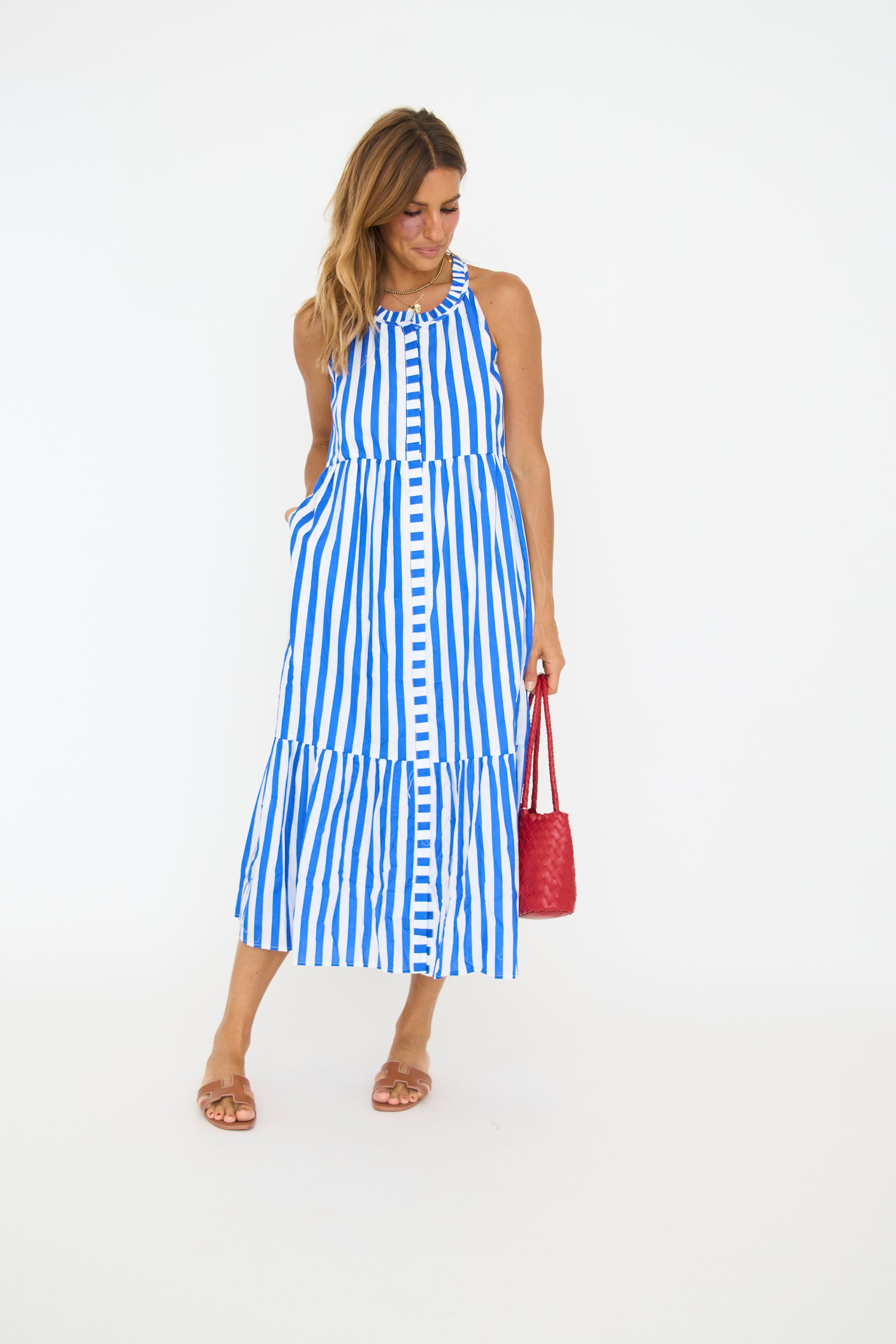 Take your look from day to night in the Bey Stripe Zelie Sleeveless Midi Dress. A striped pattern decorates this dress with a button-down placket in the front with a ruffle neck and no sleeves. It maintains a flowy fit and ends at a midi hem. Complete the look with some white heels or cute sandals!