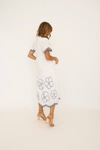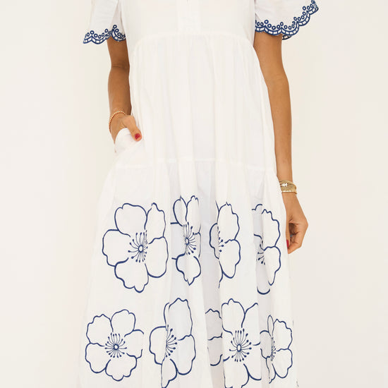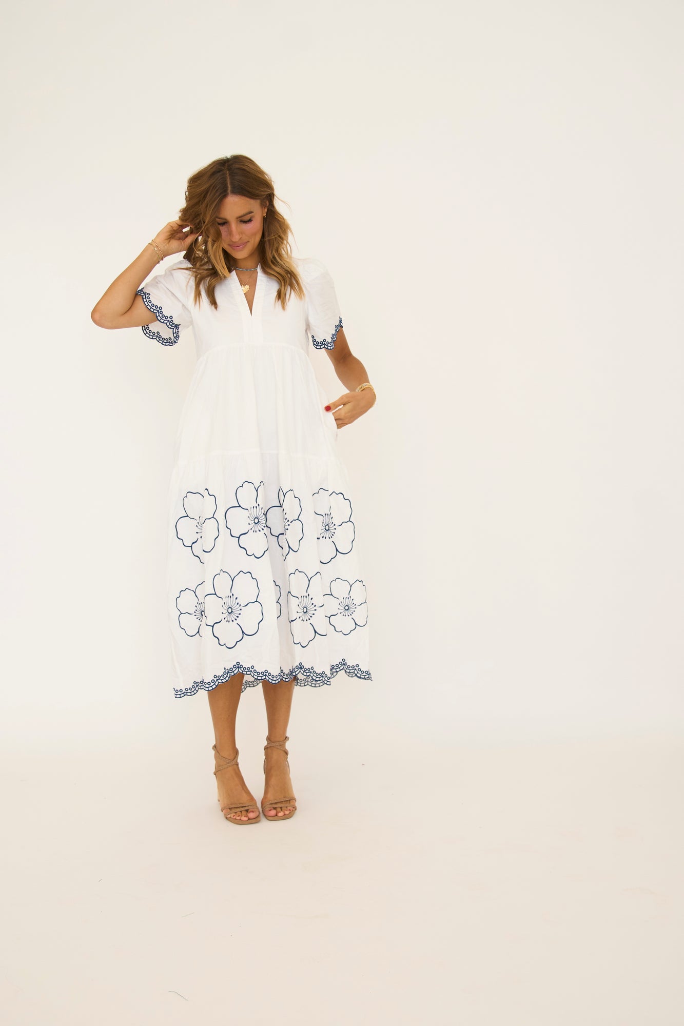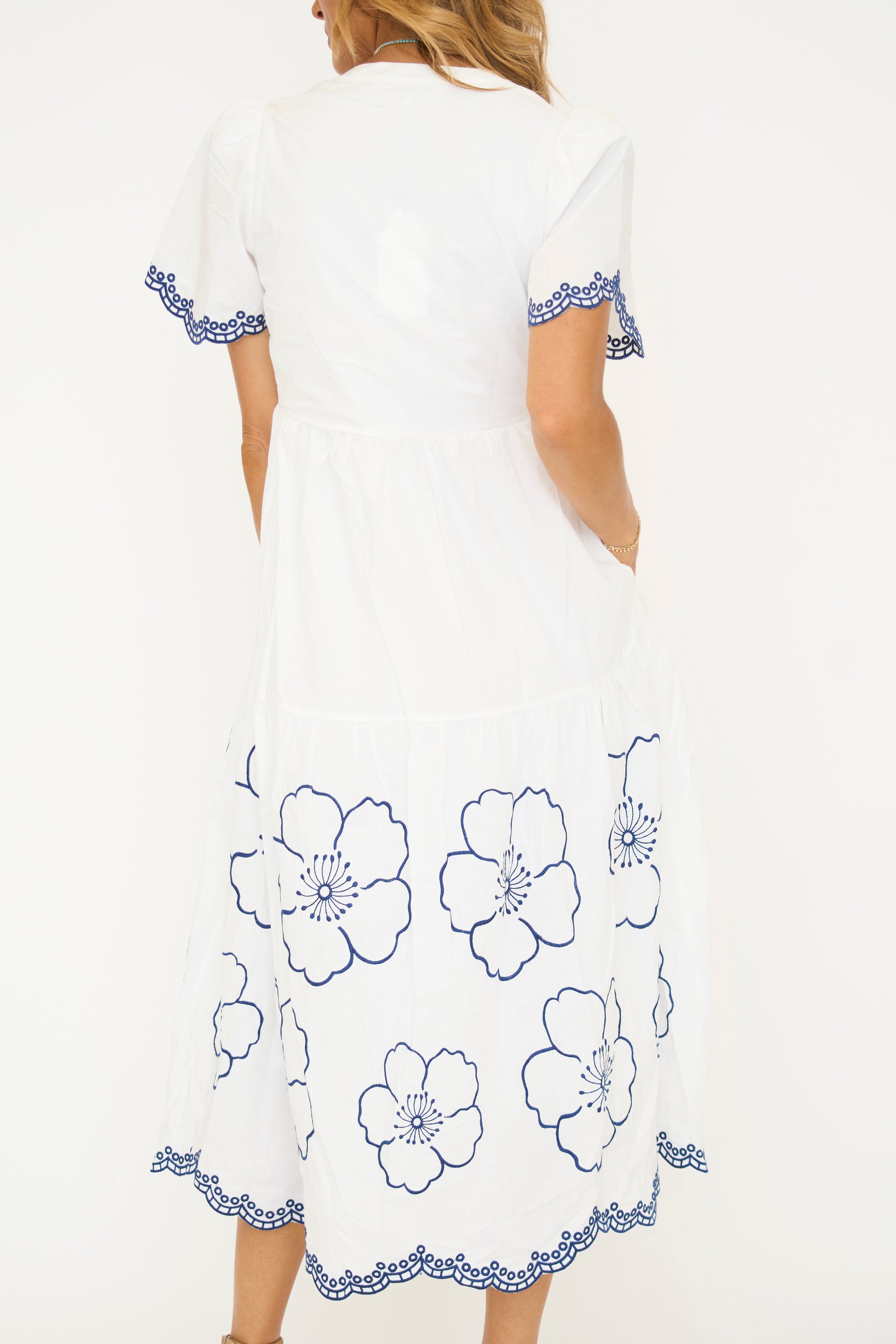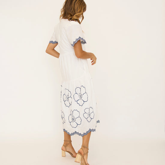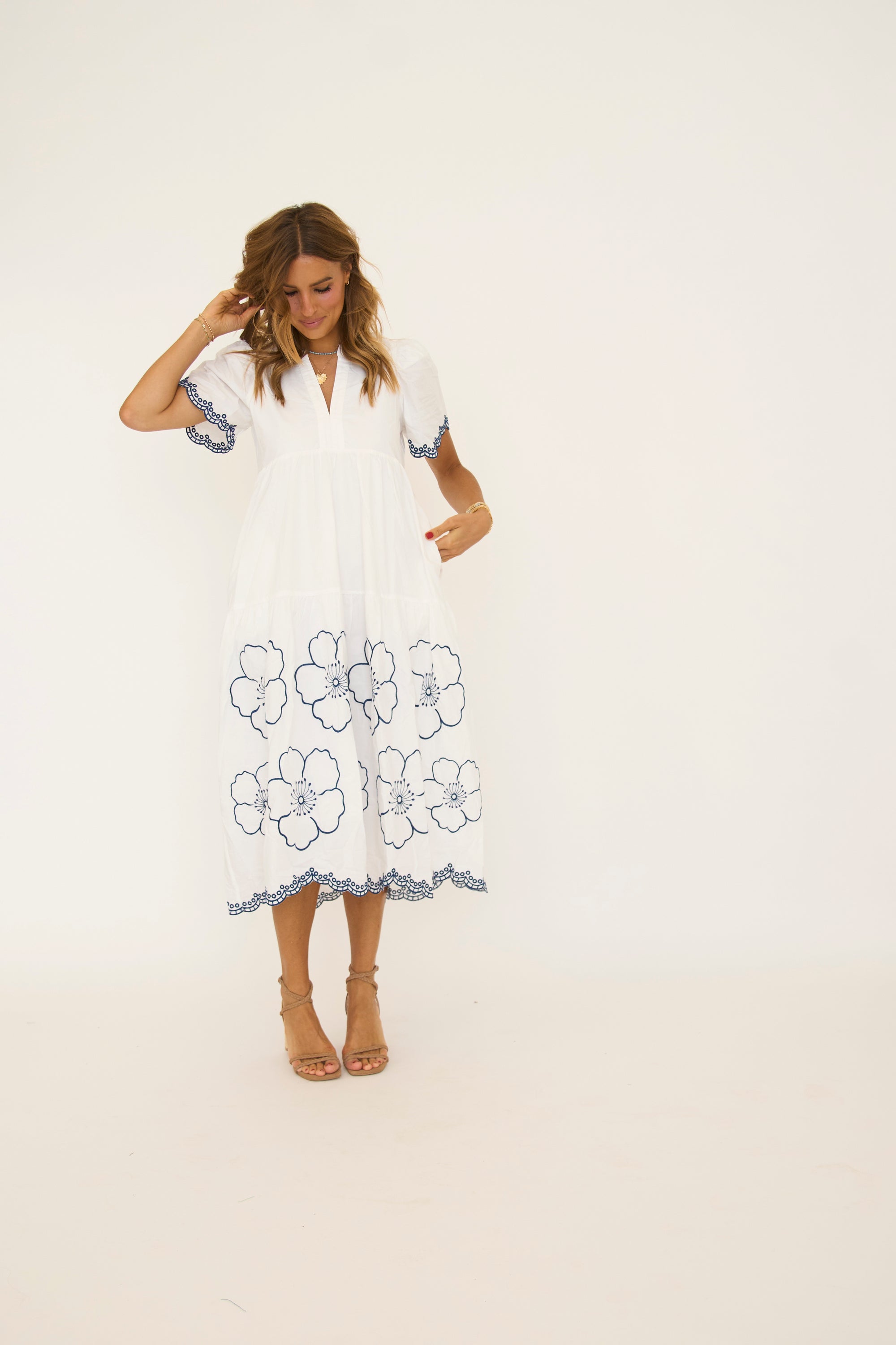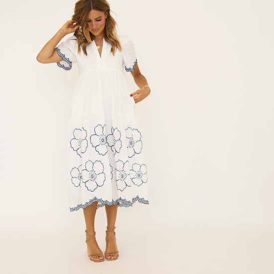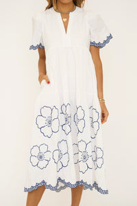 Charming and effortlessly refined, the Blossom Edge Midi Dress features delicate floral embroidery, scalloped edges, and a timeless silhouette. Designed with a flattering V neckline, puff sleeves, and a softly tiered skirt, this midi dress blends romance with sophistication. The intricate contrast embroidery adds just the right amount of detail, making it perfect for garden parties, weekend outings, or special events. Crafted from high-quality materials for comfort and durability, this versatile piece will carry you from day to night with ease. A wardrobe staple that's as elegant as it is eye-catching.