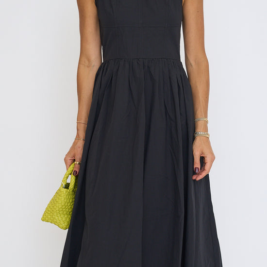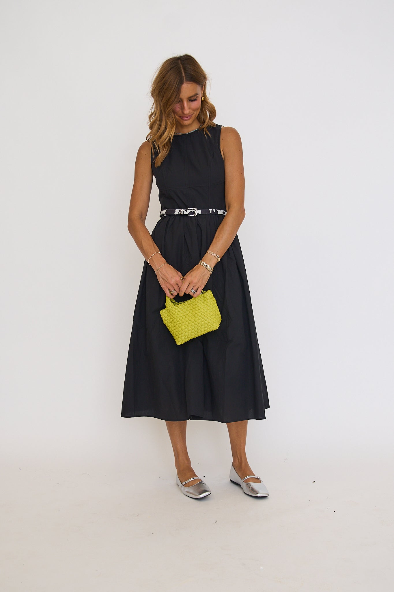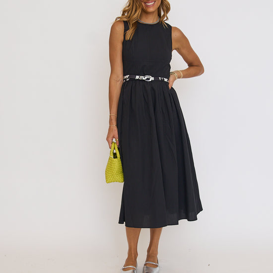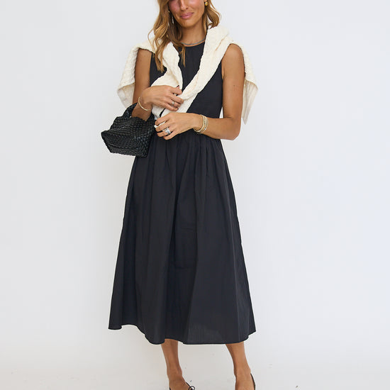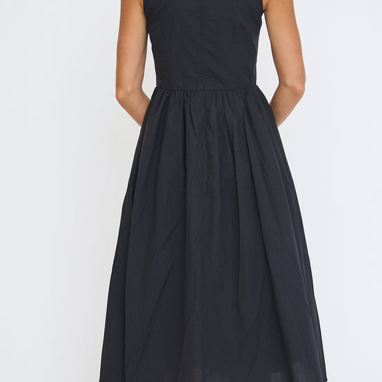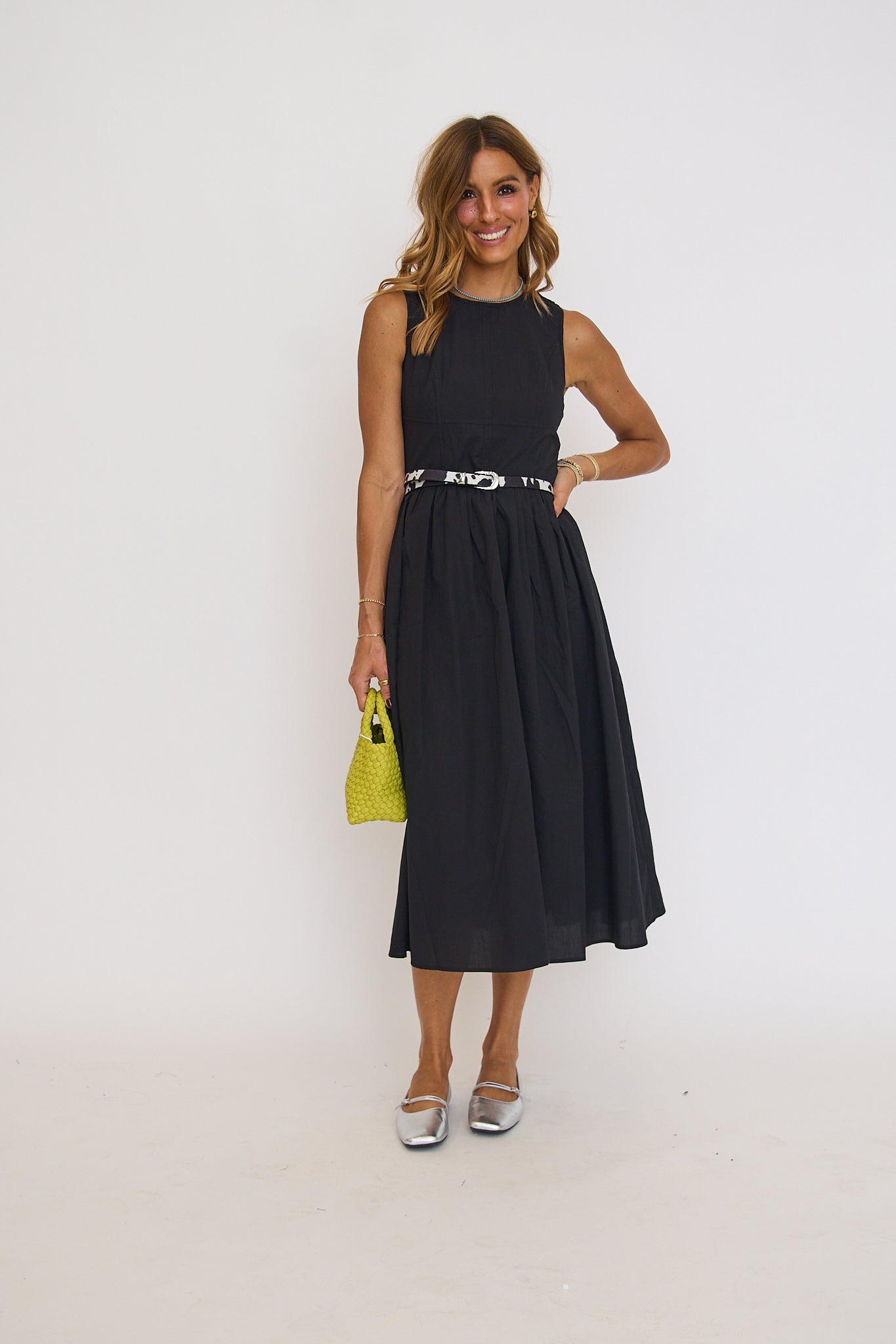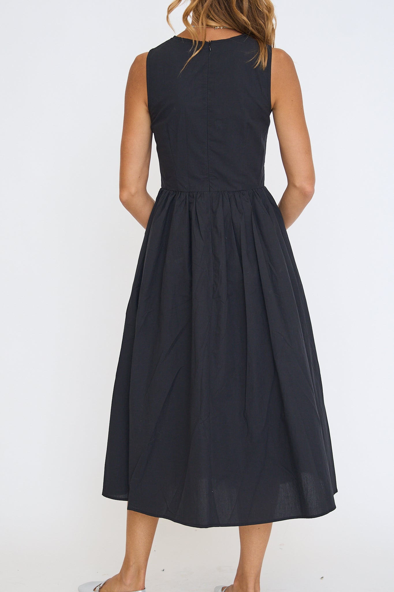 A sleeveless midi dress featuring a fitted bodice and softly gathered waist for a flattering A-line silhouette.