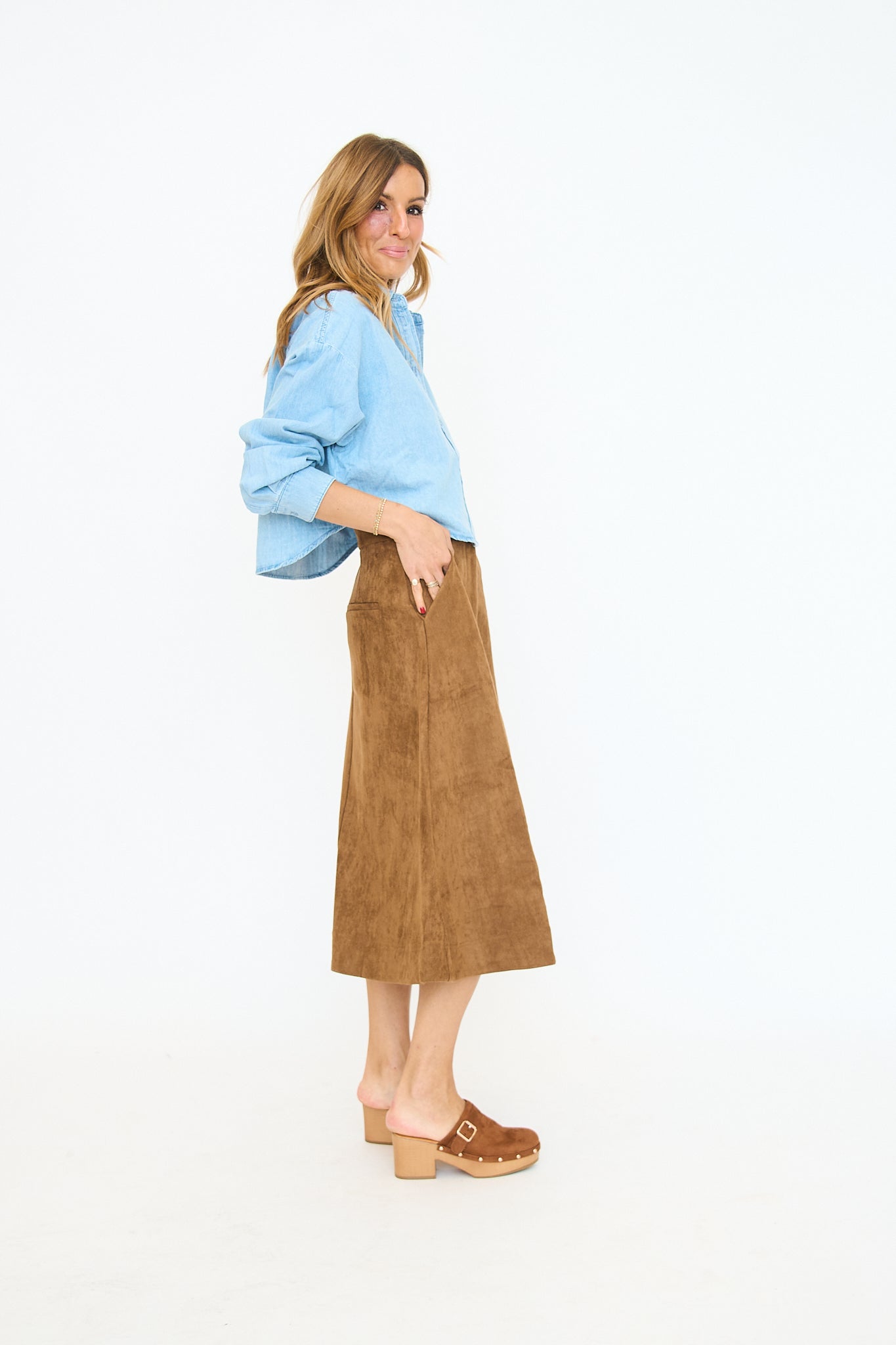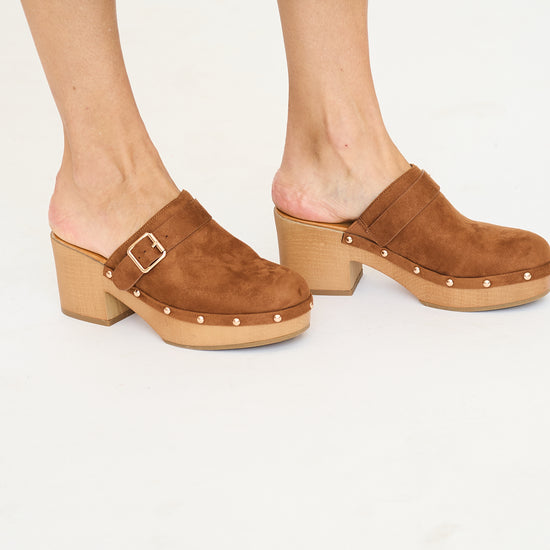 Suede heeled clog with buckle detail
