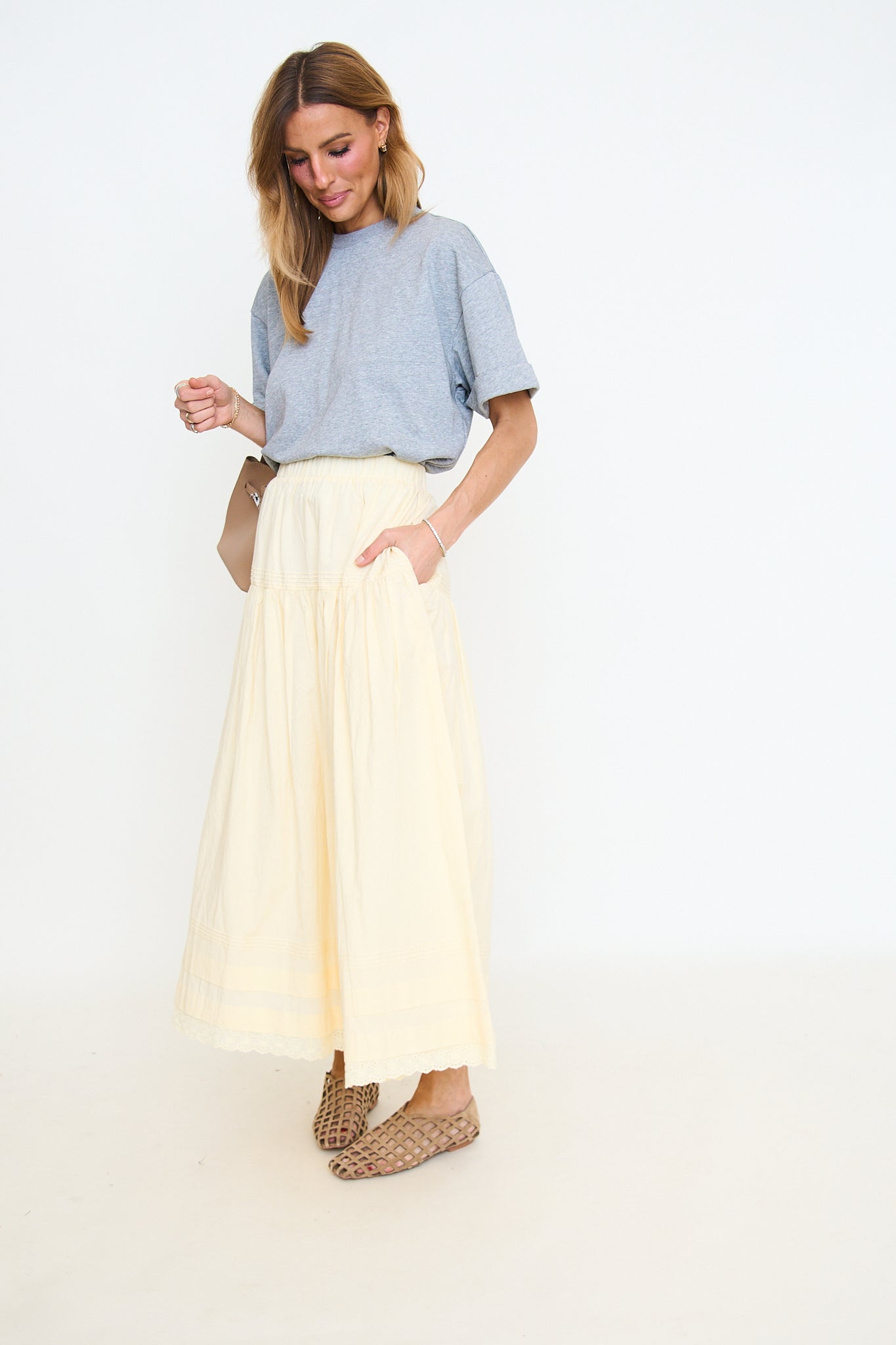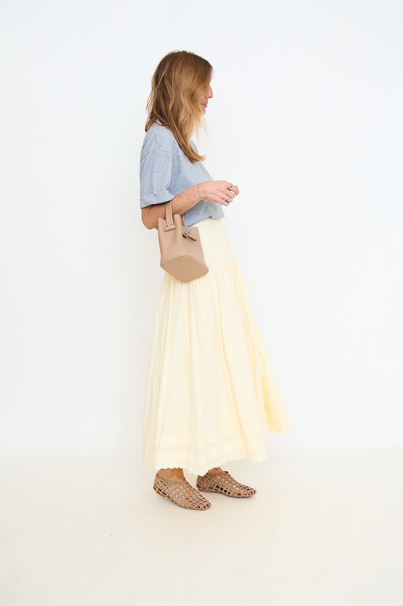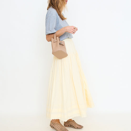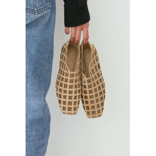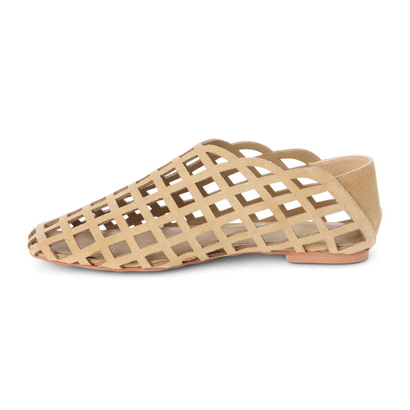 The Cooper flat showcases a natural suede upper with an airy woven cage design and low-profile sole for effortless warm-weather wear.
