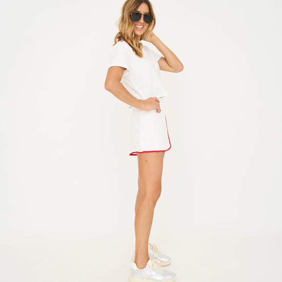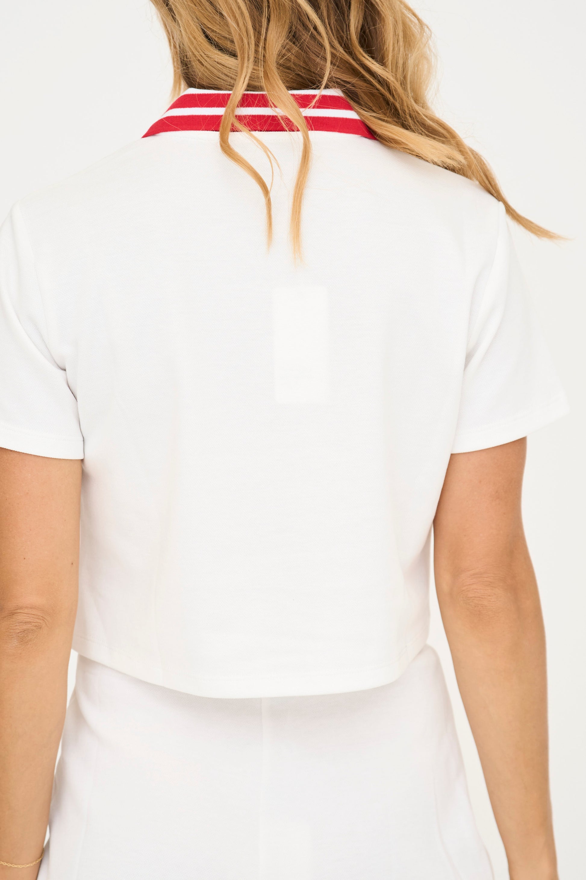 Elevate your style game with our Courtside Polo Top! This cropped button up features a bold red stripe collar that adds a touch of flair to your look. Complete the outfit with our matching Courtside Wrap Skort for a winning combination. Perfect for any athletic or casual occasion!