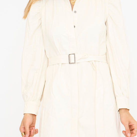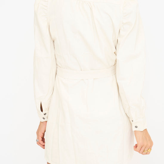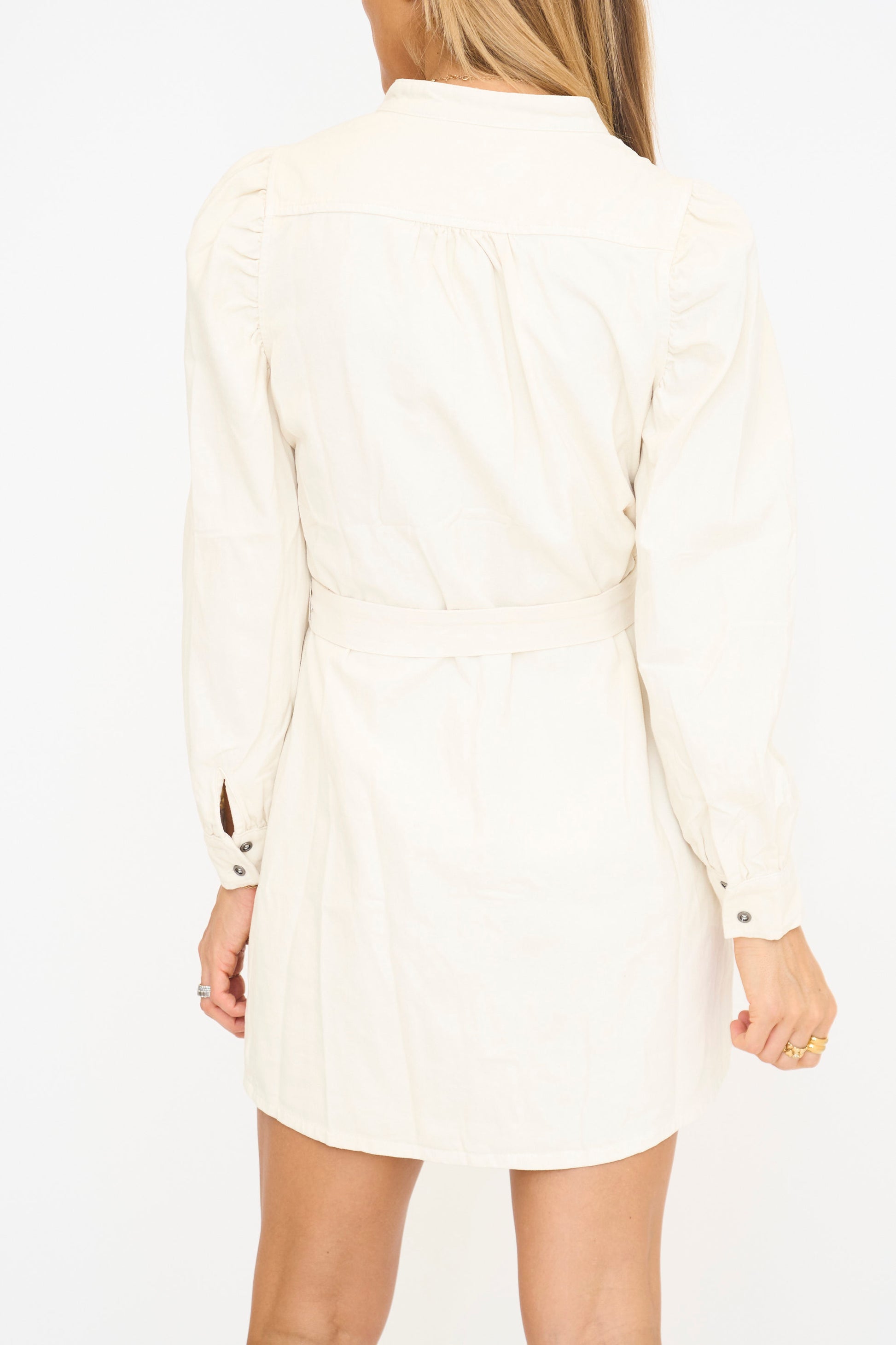 Cream dnim Puff Sleeve Belted Dress offers a modern twist on classic denim with its flattering silhouette and stylish puff sleeves.