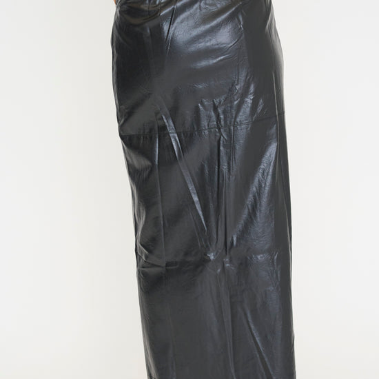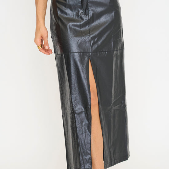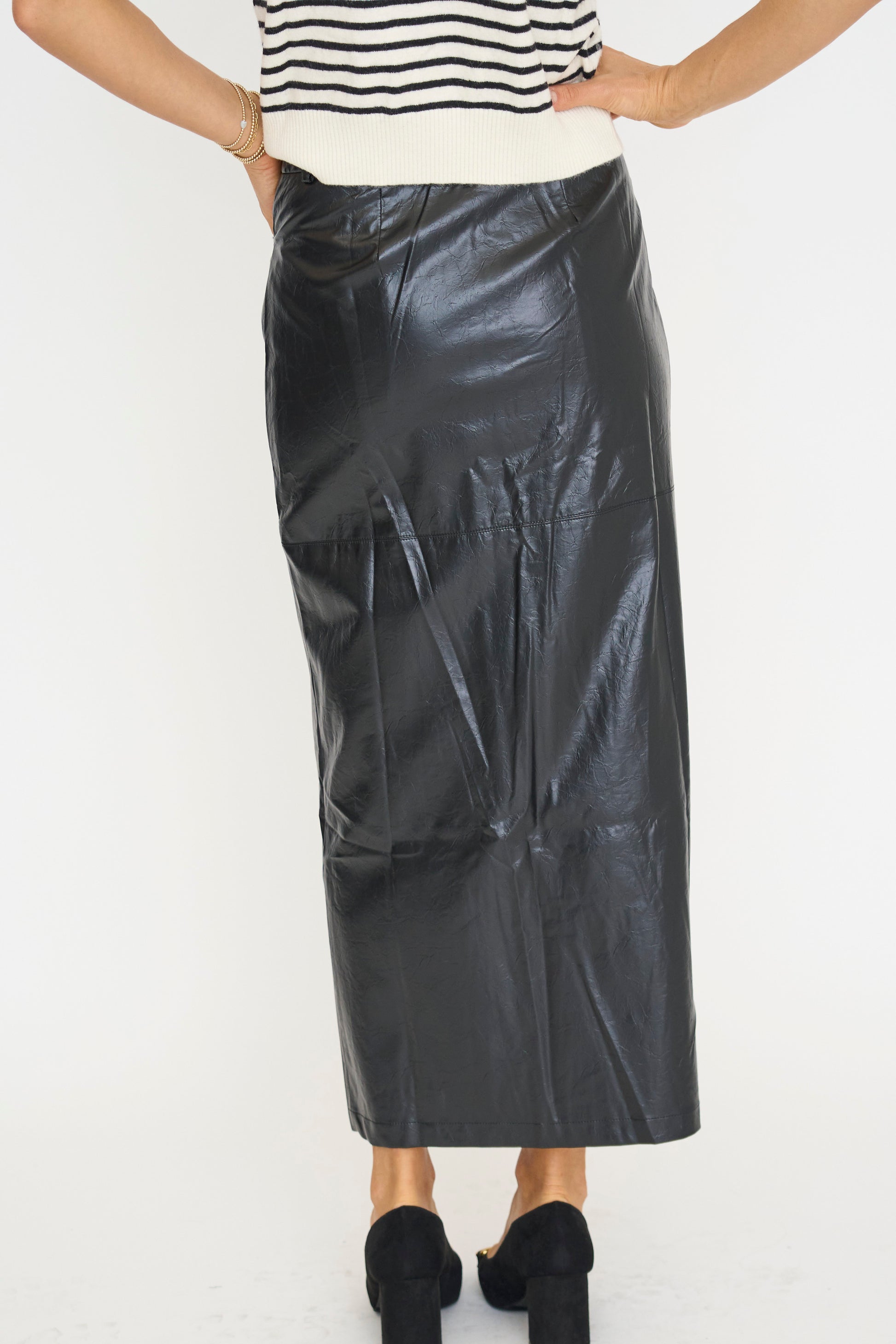 Great for wearing with blouses, body suits or even make her casual with a tee! She features a black faux leather, zipper-button fly, midi to maxi length, open slit in front for movement and great versatility for any woman! Easy to pair back with boots, heels or a casual fashion sneaker!
