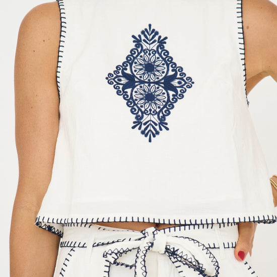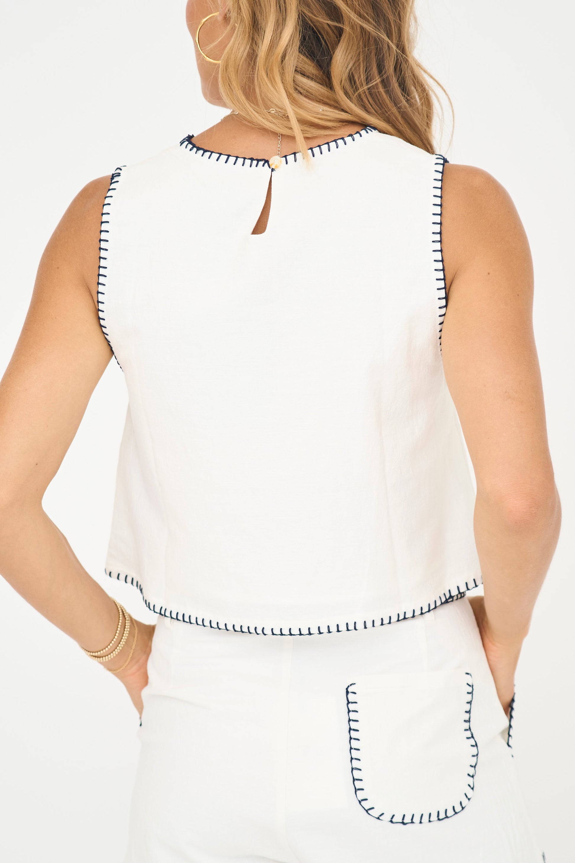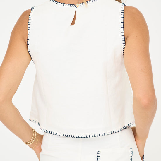 Effortlessly elevate your summer wardrobe with the Dawson Top. This top features a classic white and navy colorway with a tank top silhouette. The navy stitched trim detailing adds a touch of sophistication to this versatile piece.