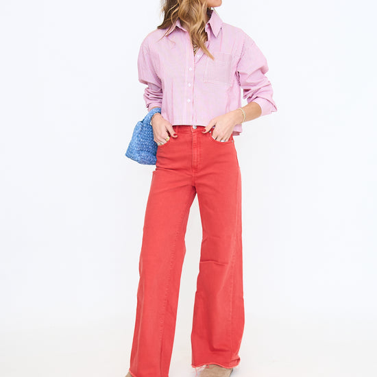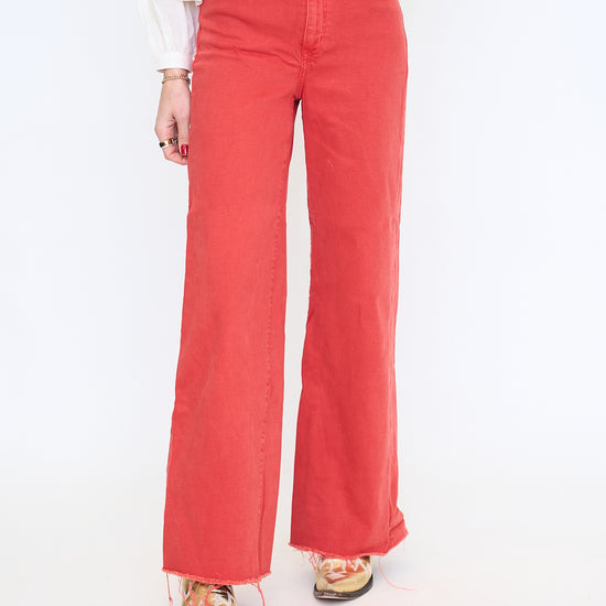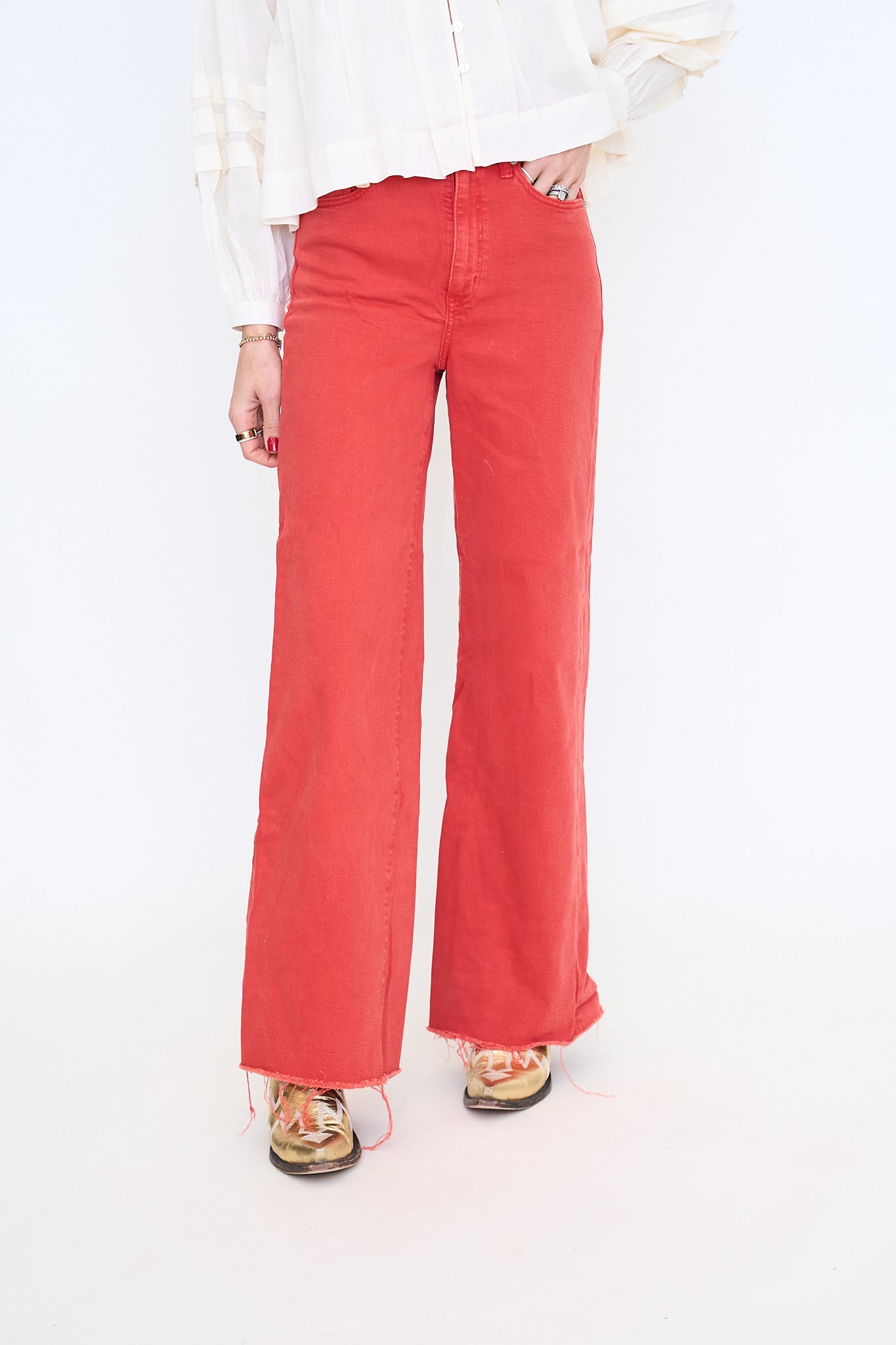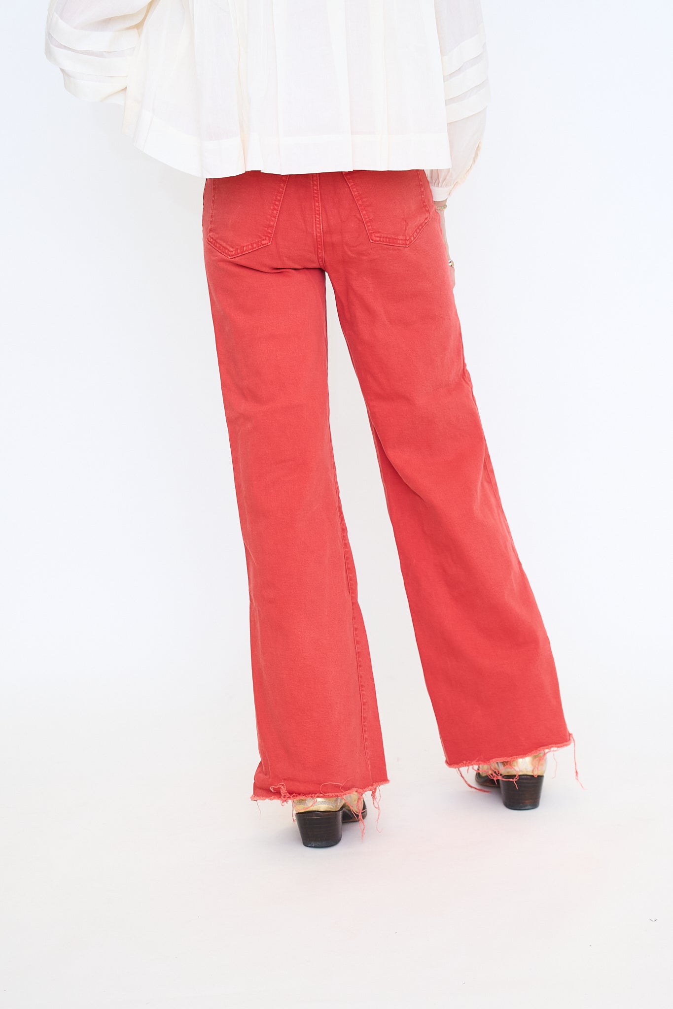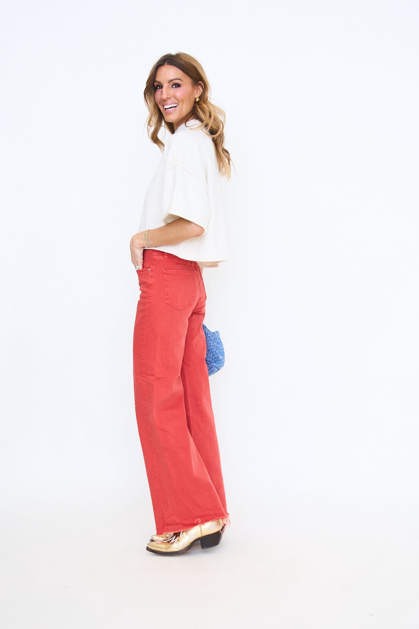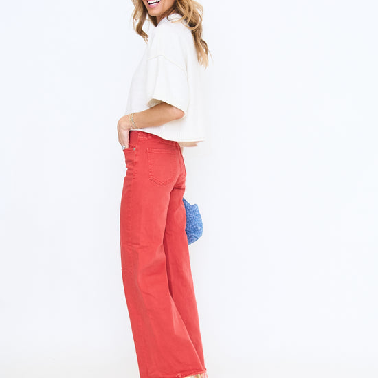 The Far Out in Cherry is an ultra-flattering high rise wide leg jean in a vibrant cherry red hue. Pair with the Lily Baby Tee in Cherry for a bold monochromatic look.