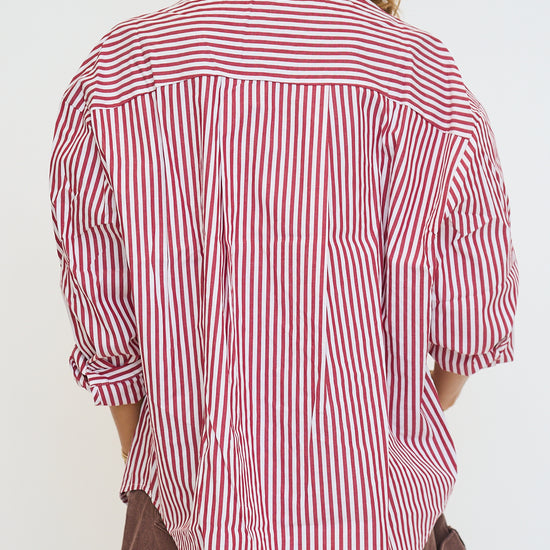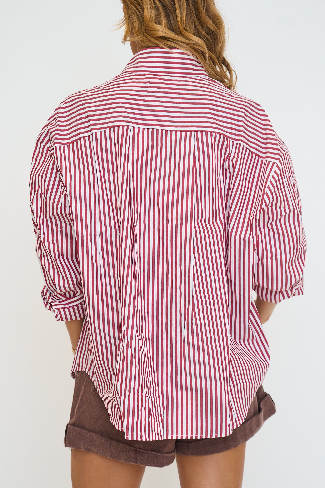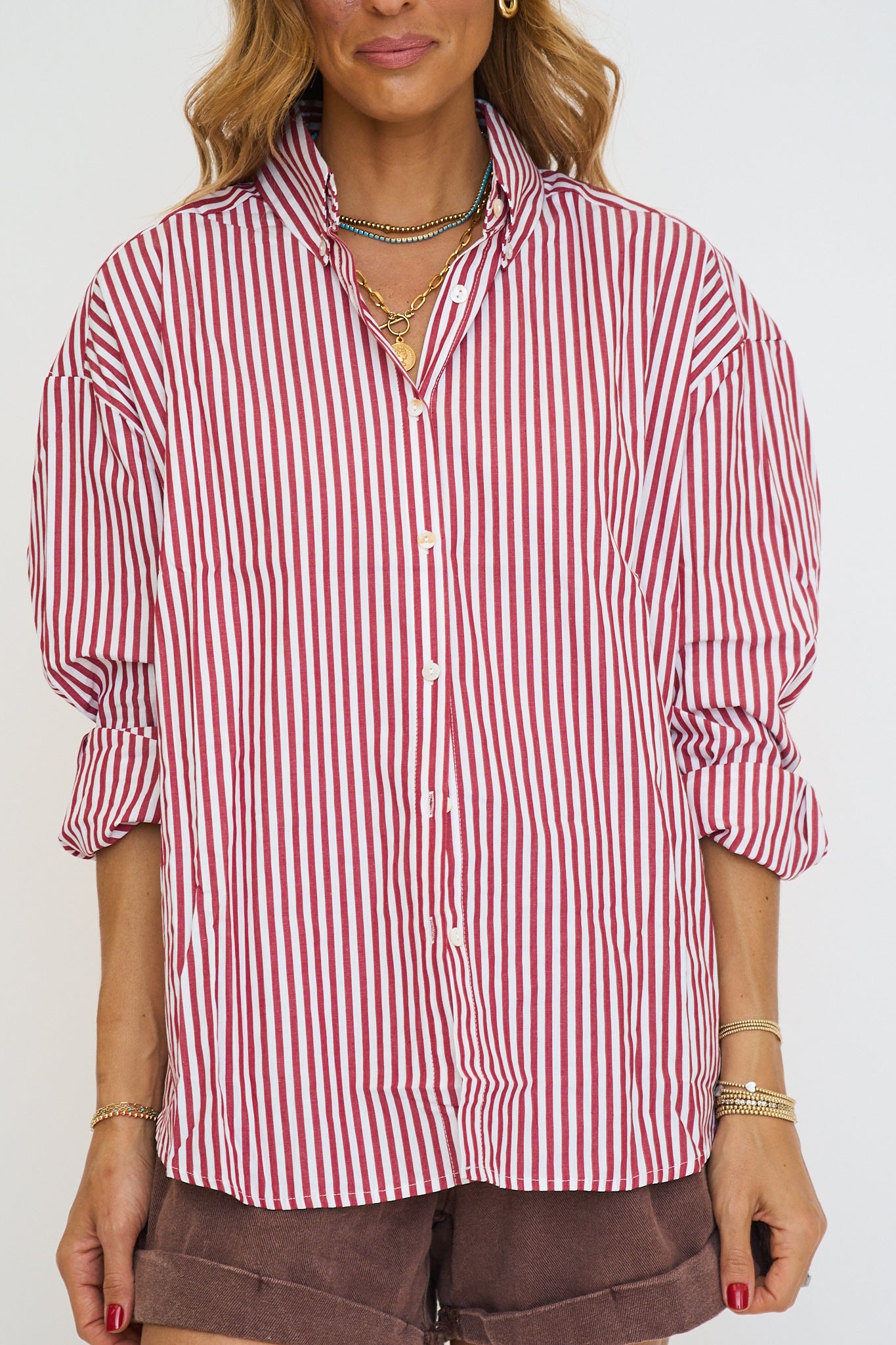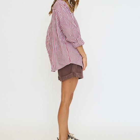 Our Demi Top features front button down closure and a bengal stripe in a deep red. Woven.