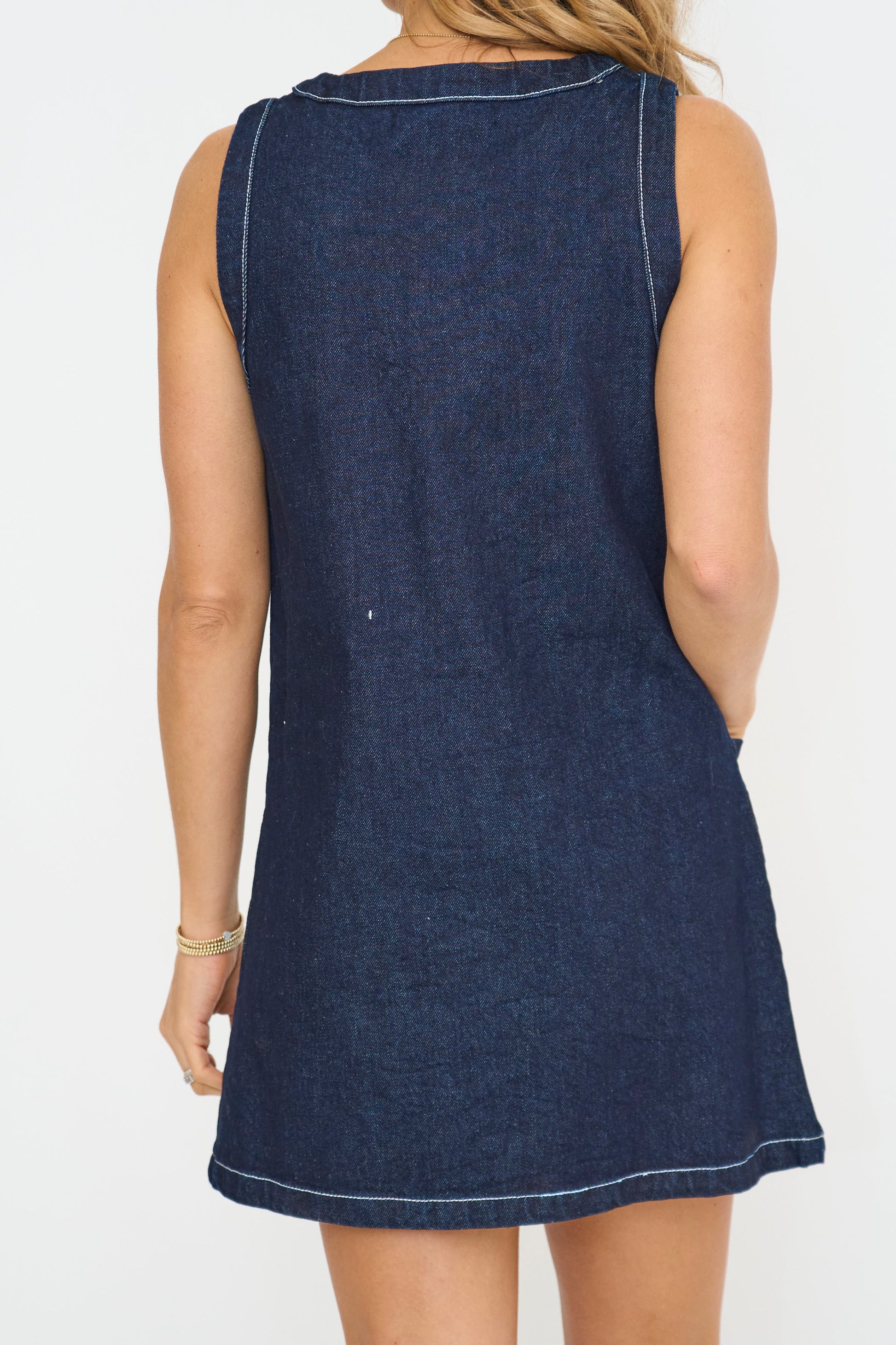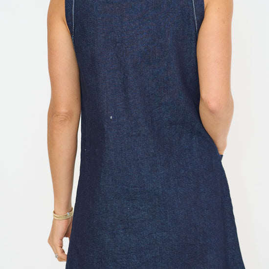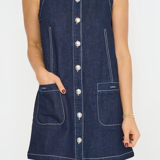 Get ready to slay in this must-have Denim Mini Dress. The round neckline and sleeveless design create a flattering silhouette while the front button closure adds a touch of charm. Keep your essentials close with the convenient front pockets. Perfect for any occasion this dress will elevate your style game. Step out in confidence and make a statement in this trendy Denim Mini Dress.