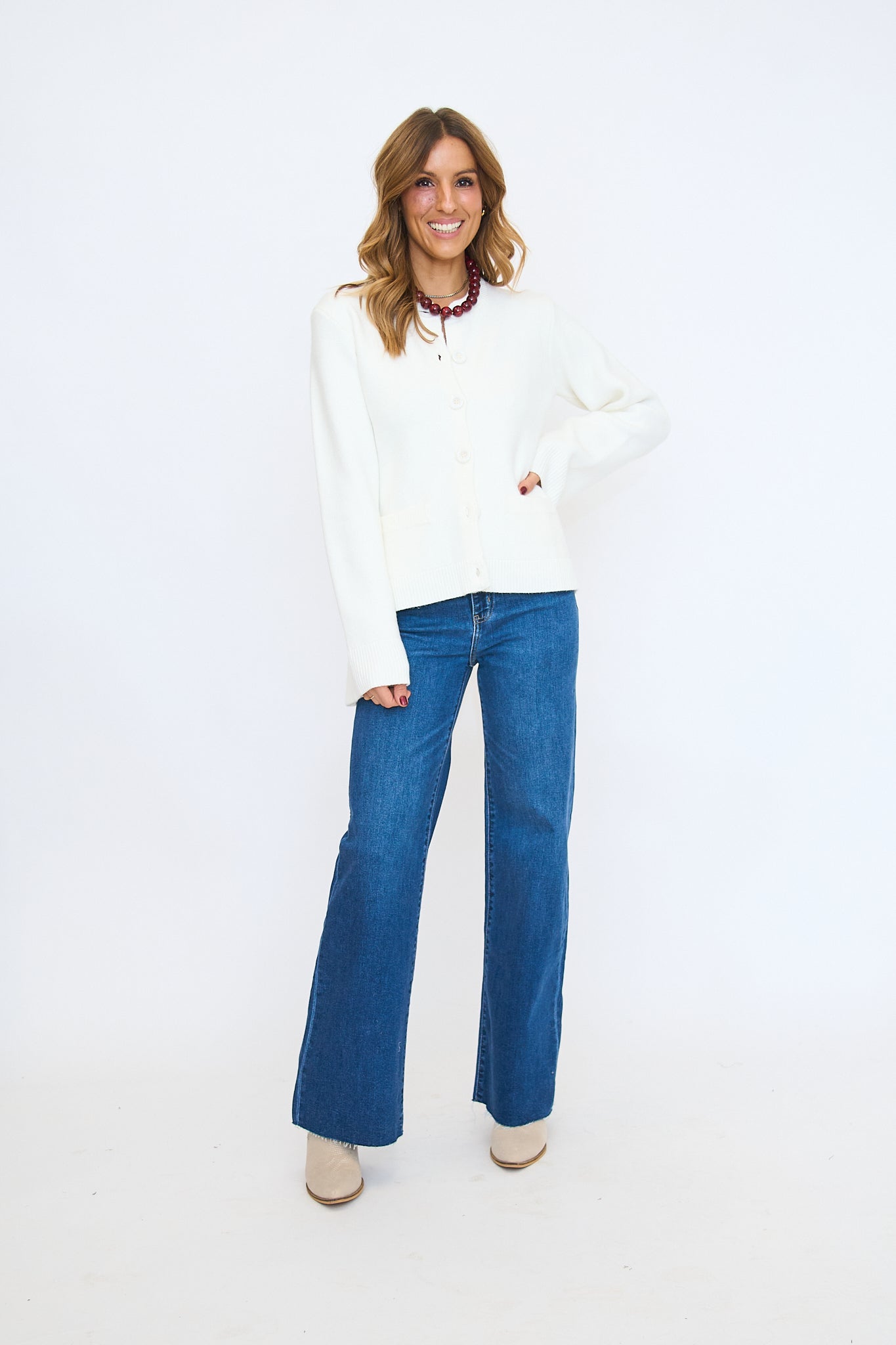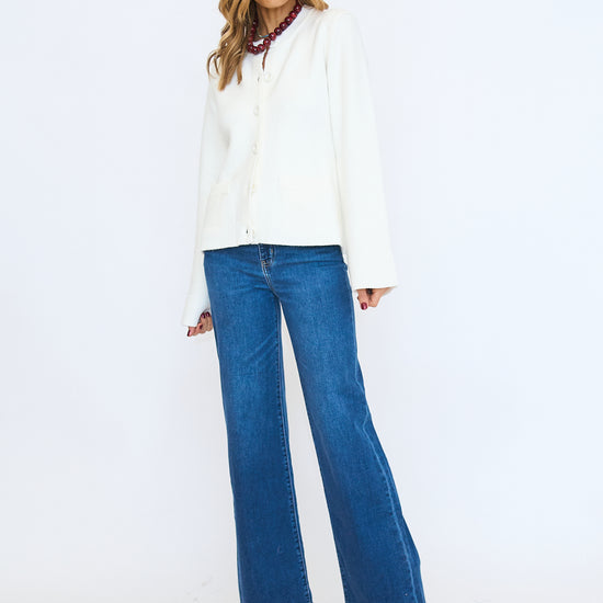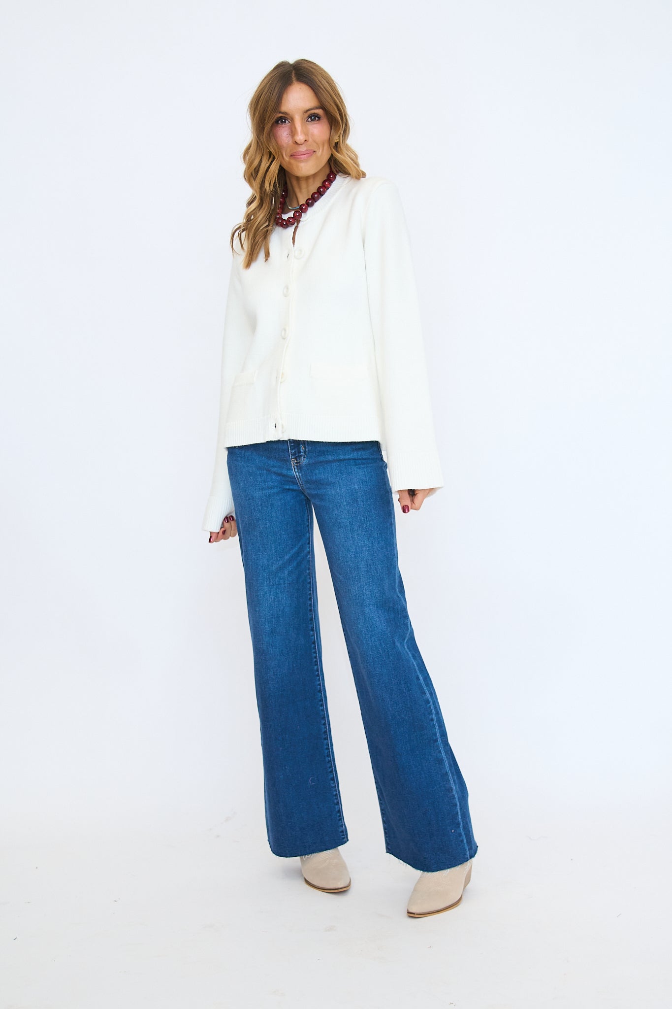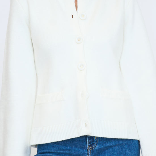 A timeless classic, this knit cardigan is designed with a clean, tailored look. Features a round neckline, front button closure with oversized buttons and two front patch pockets. Ribbed trim at collar, cuffs and hem add subtle texture. Bell sleeves.