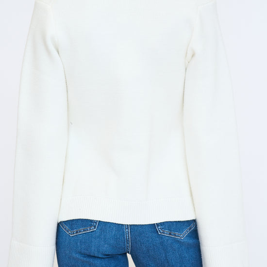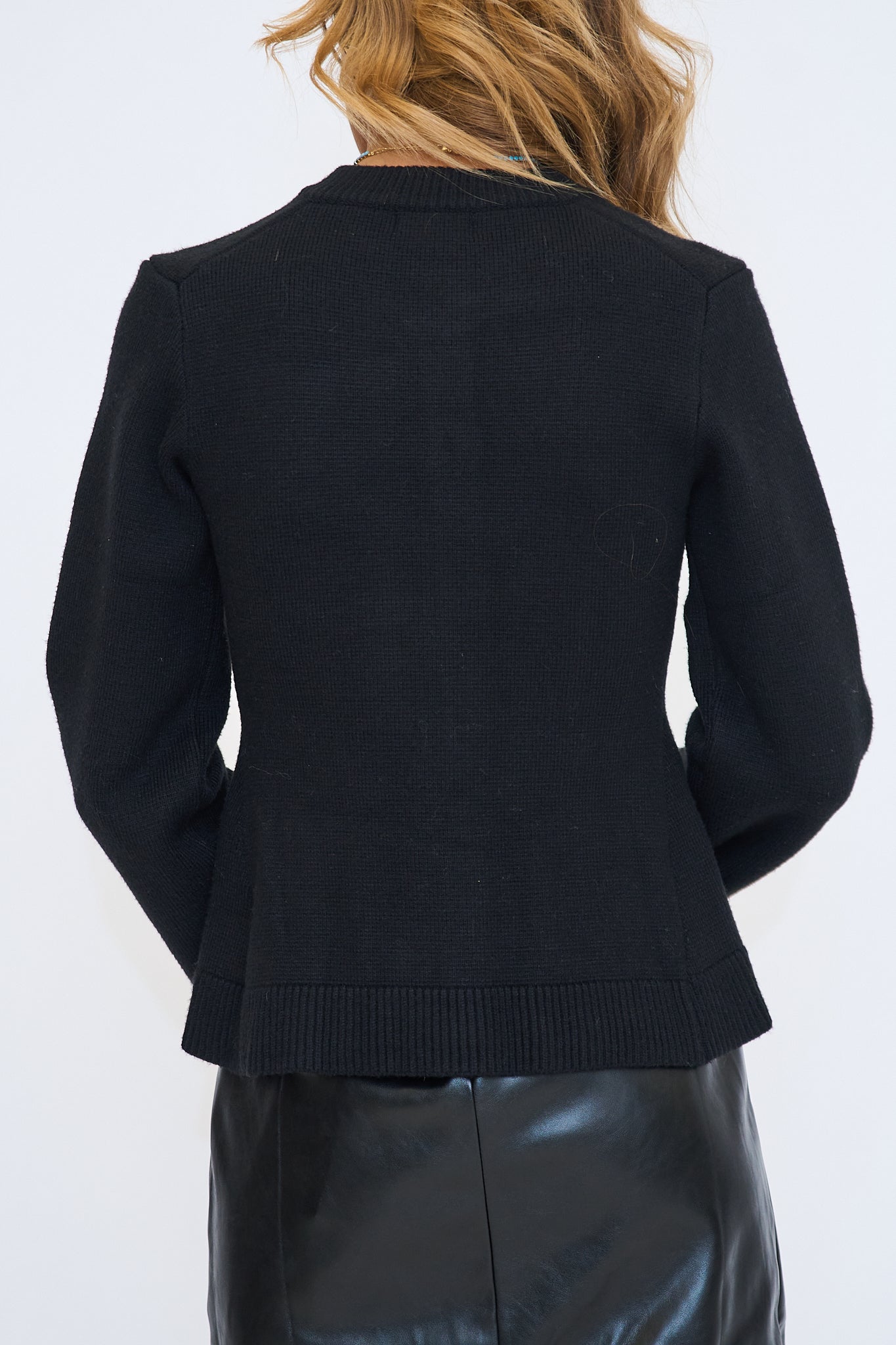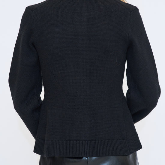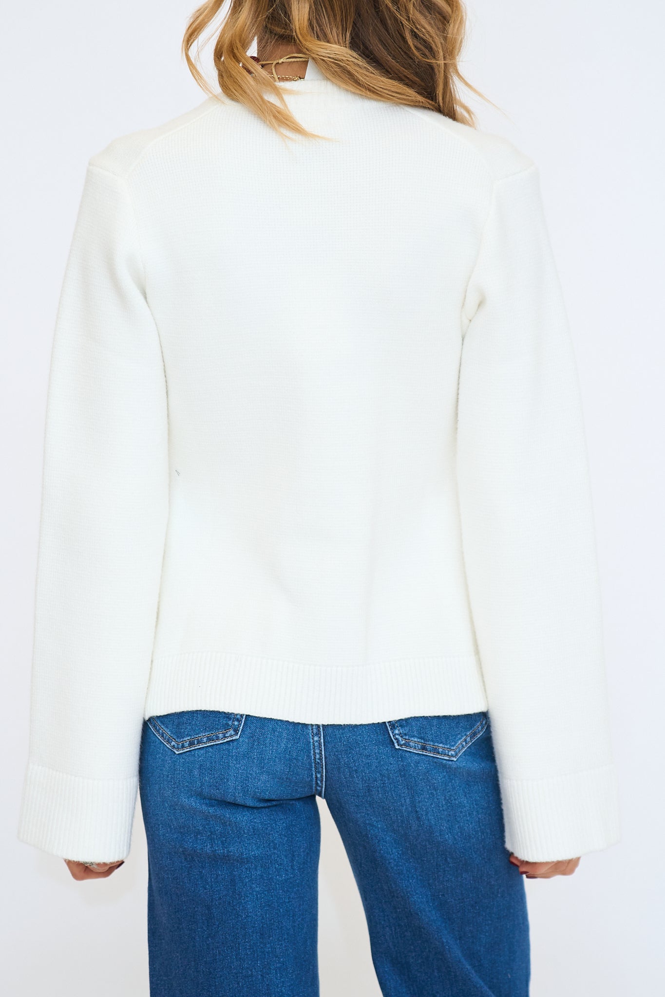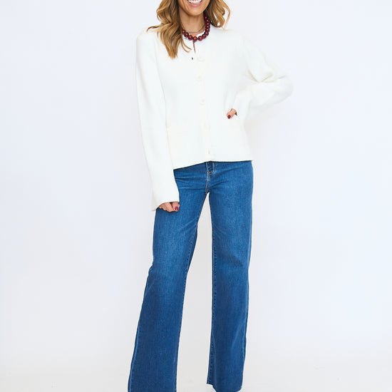 A timeless classic, this knit cardigan is designed with a clean, tailored look. Features a round neckline, front button closure with oversized buttons and two front patch pockets. Ribbed trim at collar, cuffs and hem add subtle texture. Bell sleeves.