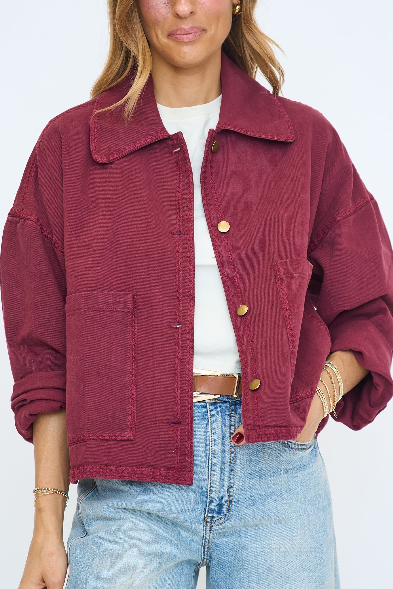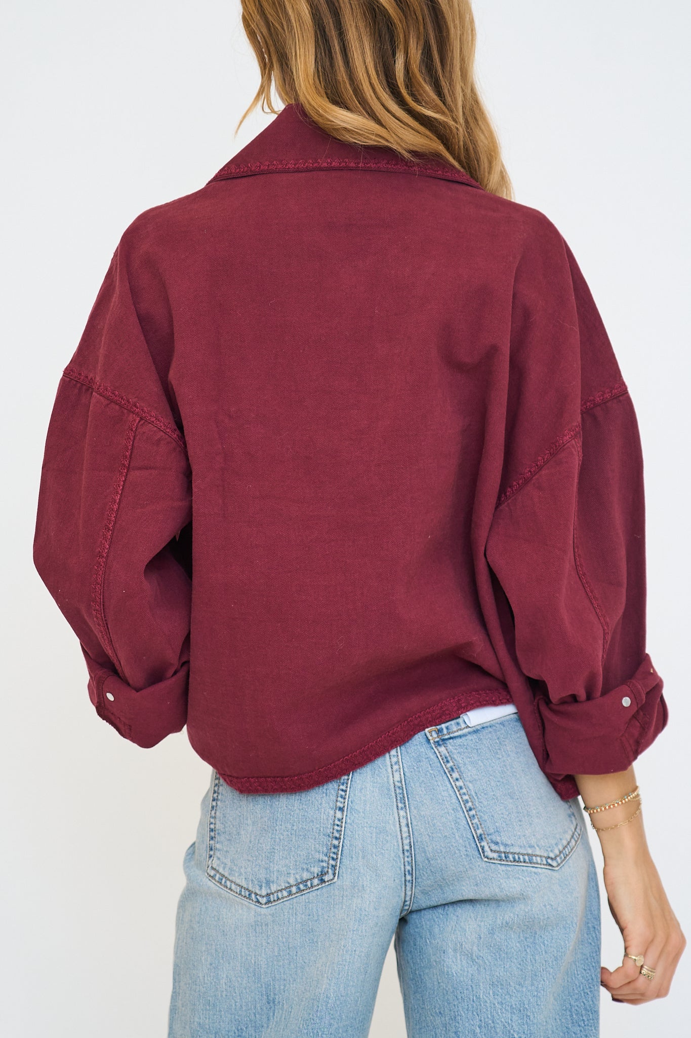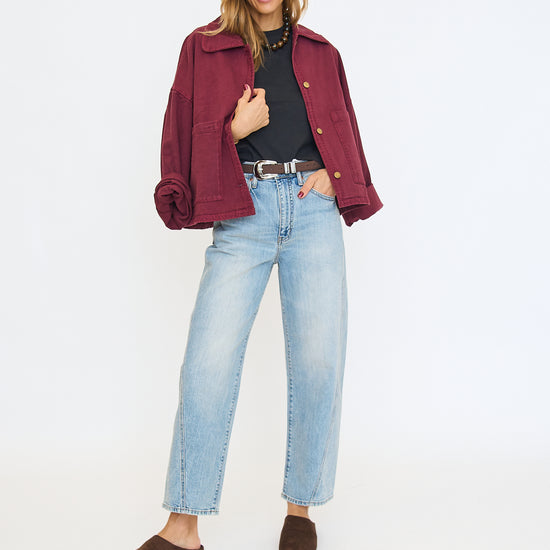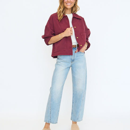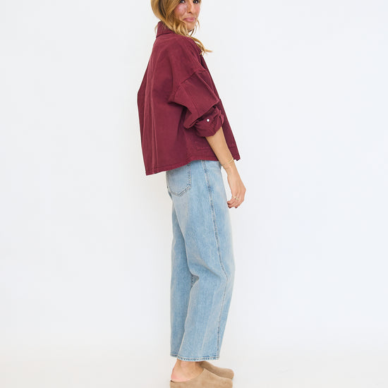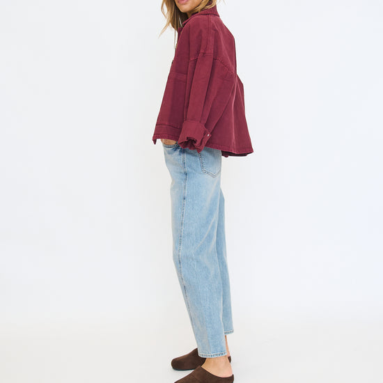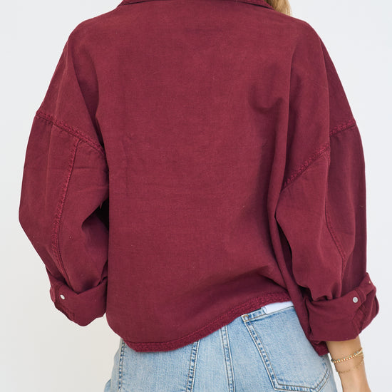 Oversized denim shacket in a plum colorway