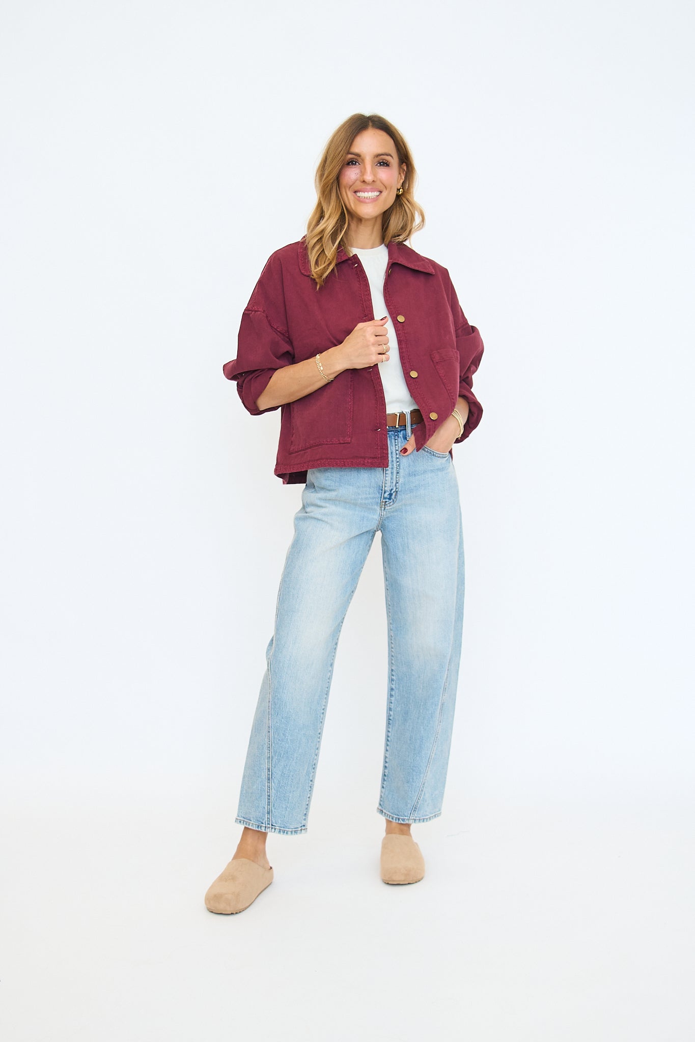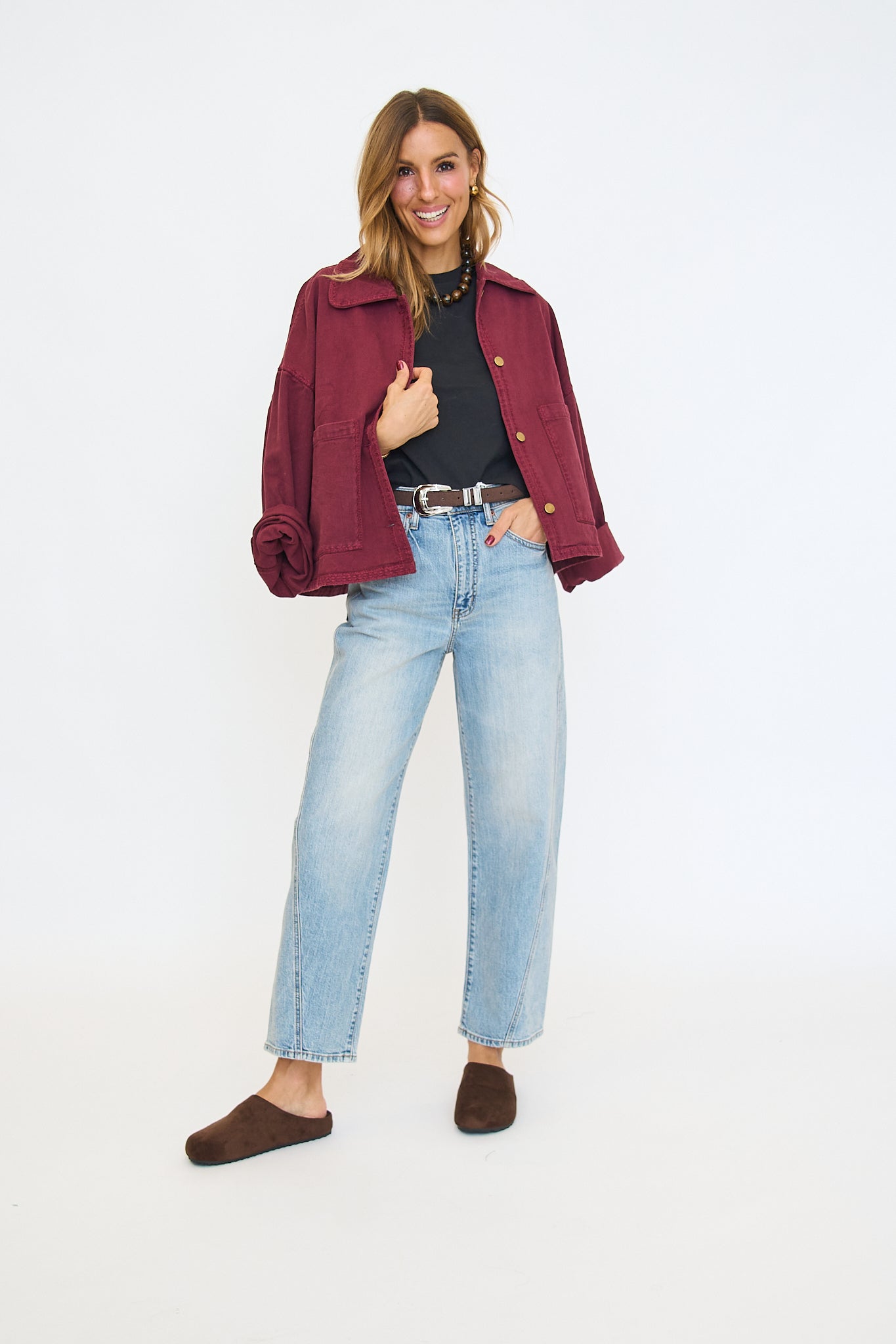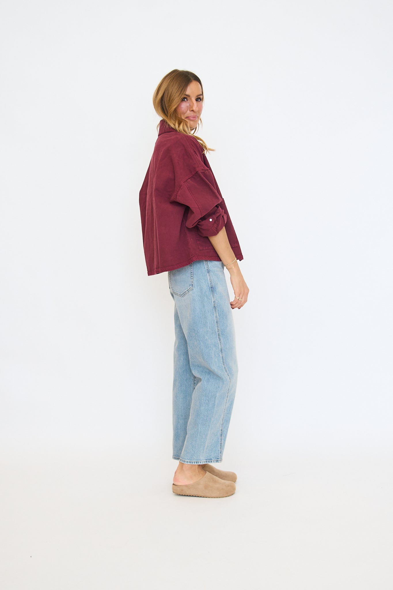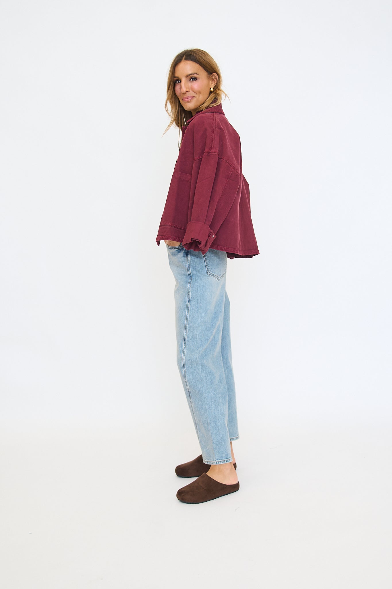 Oversized denim shacket in a plum colorway