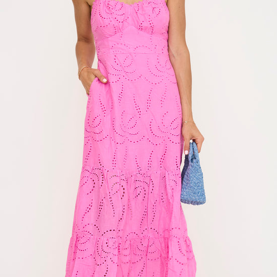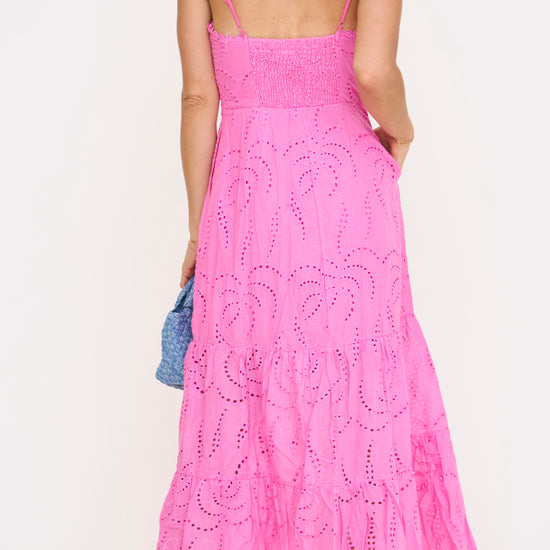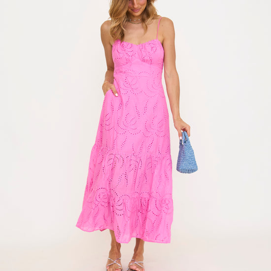 From the delicate eyelet fabric to the soft pink hue, every detail is designed to turn this dress into your new favorite. The midi length is flattering and versatile, perfect for everything from brunch to a day out. Pair with sandals or heels for a look that’s effortlessly cute, with just the right touch of charm.