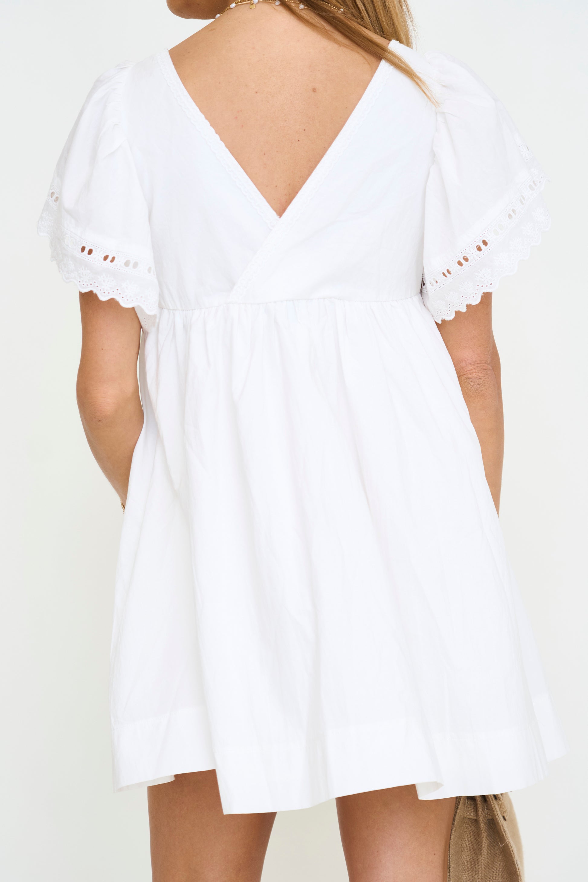 Eyelet lace trim on sleeve and neckline detail square neckline deep v-back mini dress. Lining with side pockets