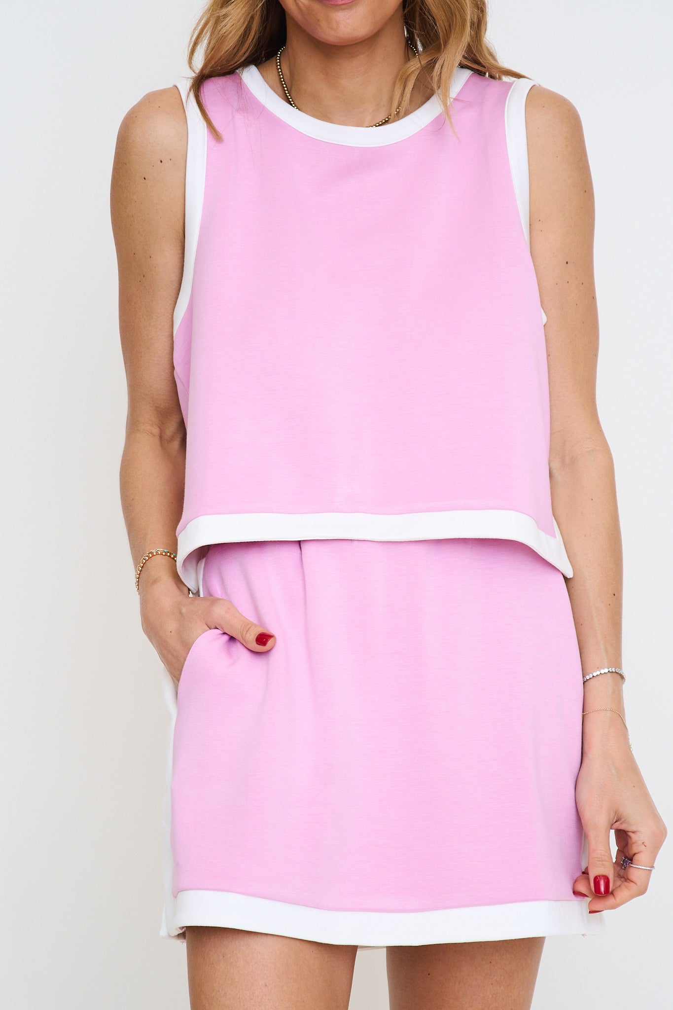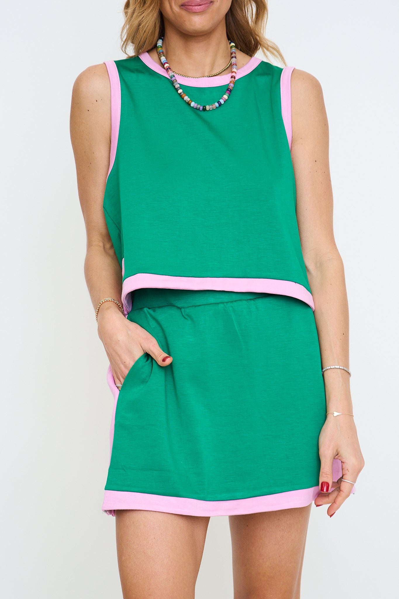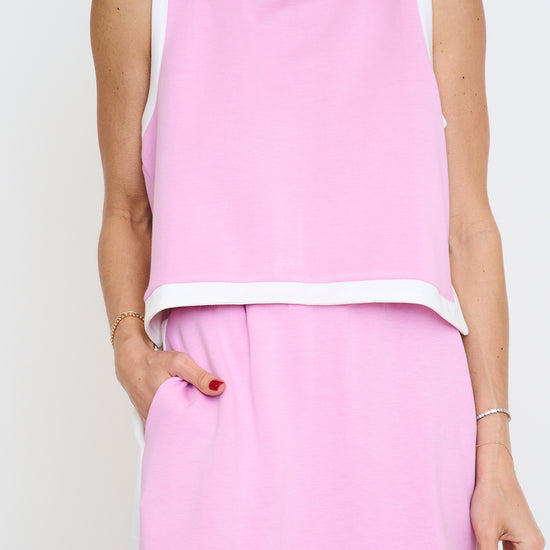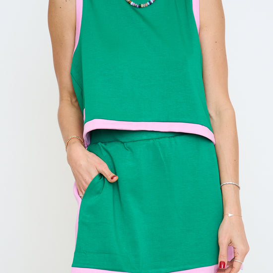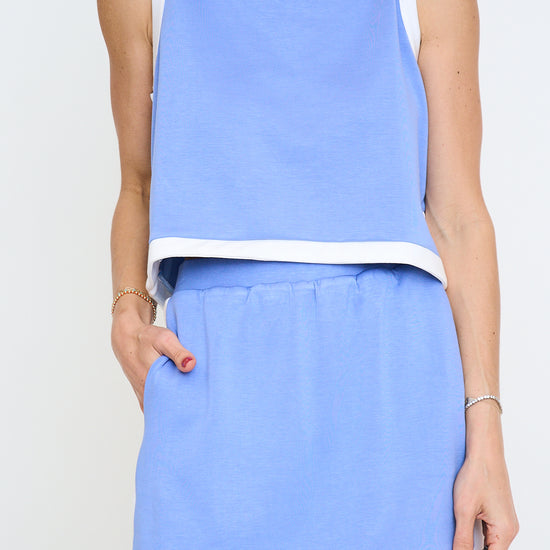 Skirt: Solid knit mini skirt featuring contrast binding and small side slit. Side pockets. Lined with shorts under. Knit. Lightweight.