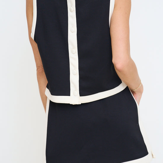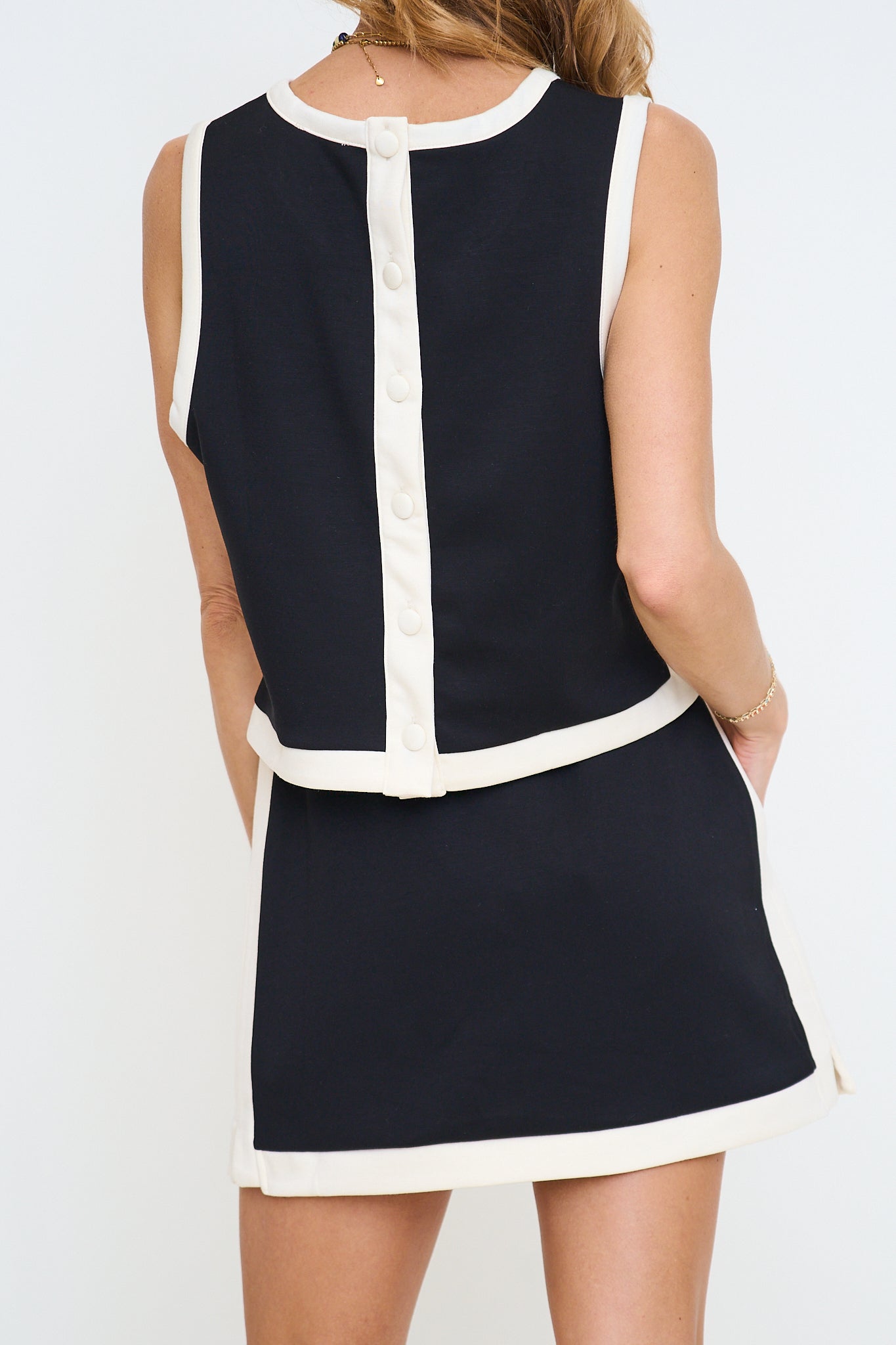 Top: Solid sleeveless knit top featuring contrast binding and covered button closure at back. Side slit detail. Unlined. Knit. Non-sheer. Lightweight.