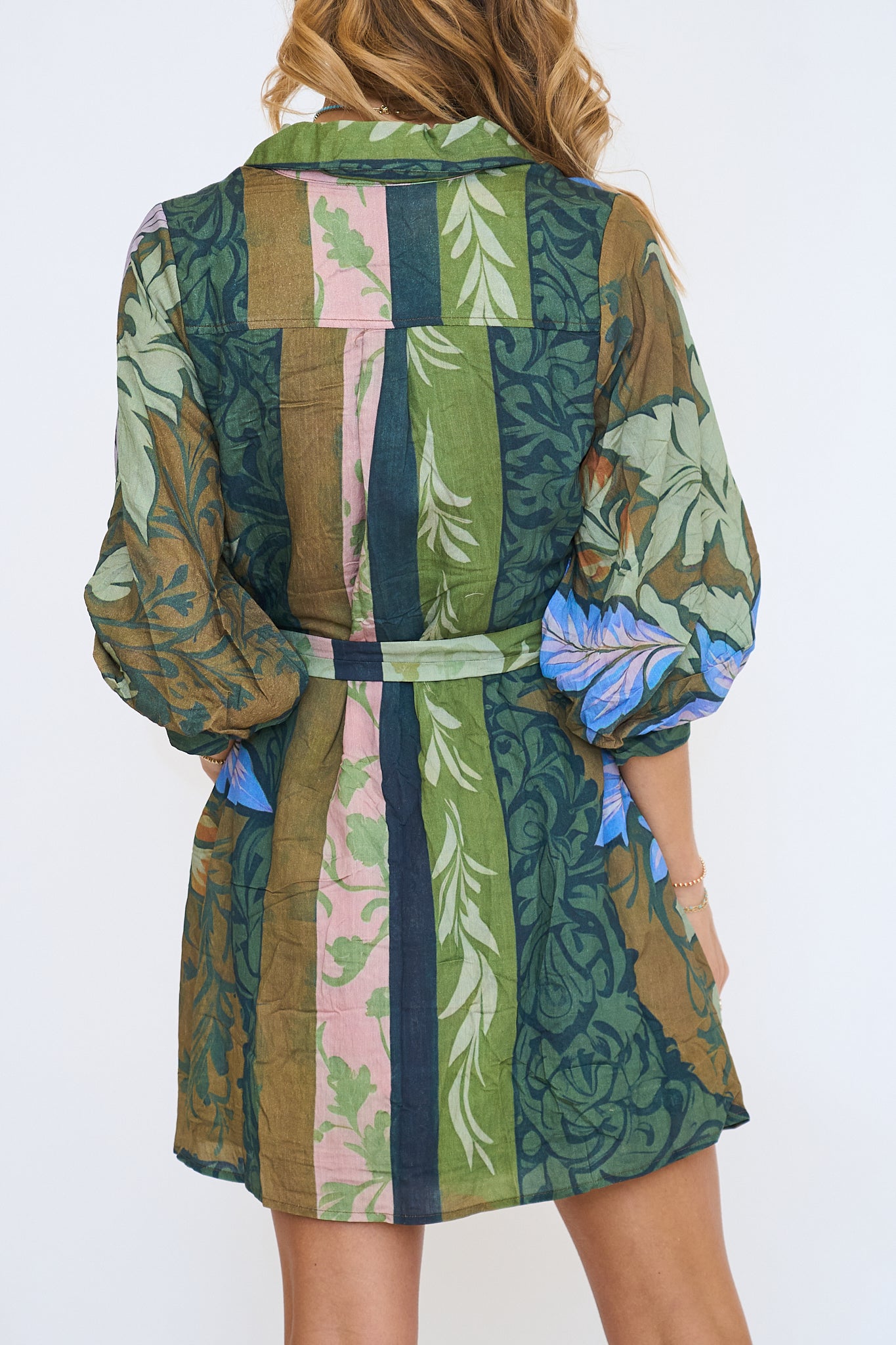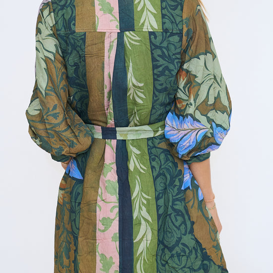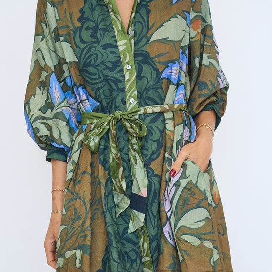 A gorgeous blend of earthy greens, bronze, and lavender hues come together in a sophisticated botanical print. Designed with a button-down front and removable waist tie, this lightweight dress flatters every figure while offering versatile styling — wear it belted for definition or loose for effortless chic.