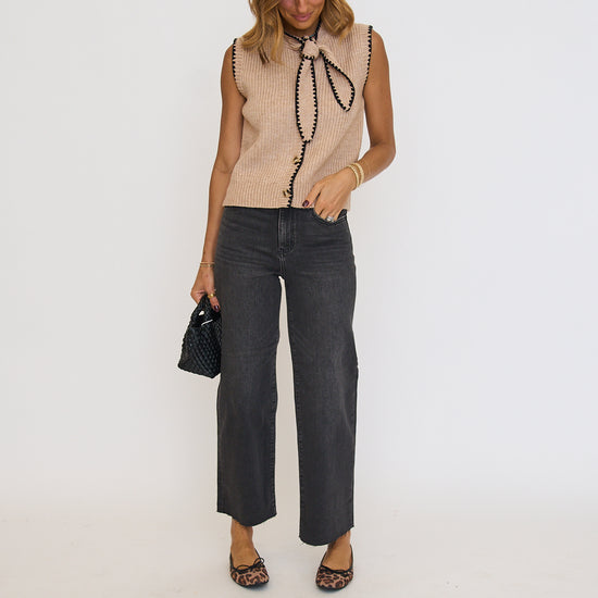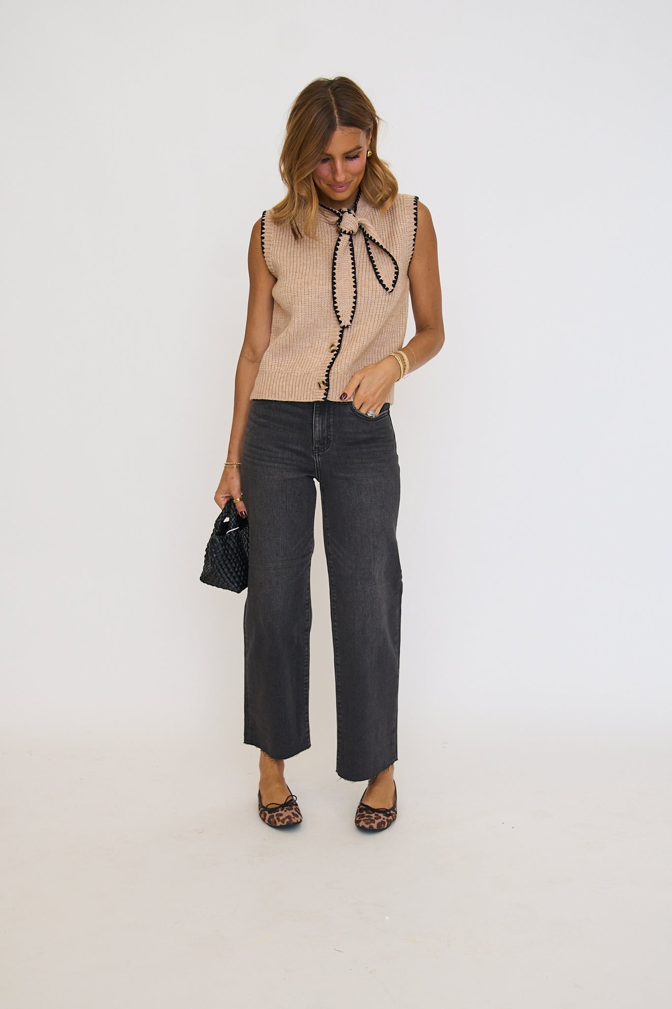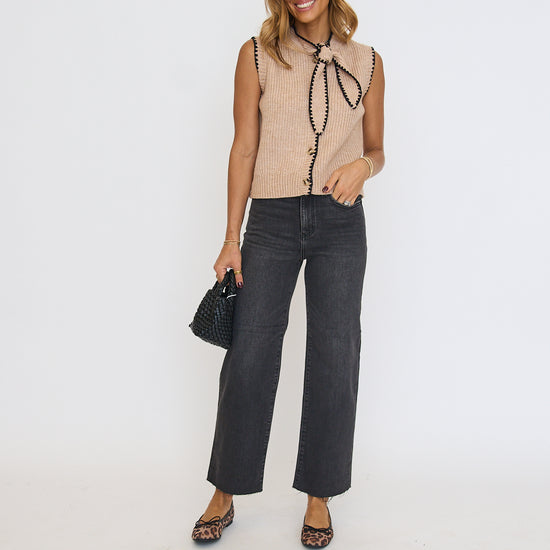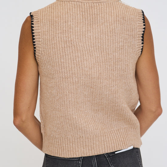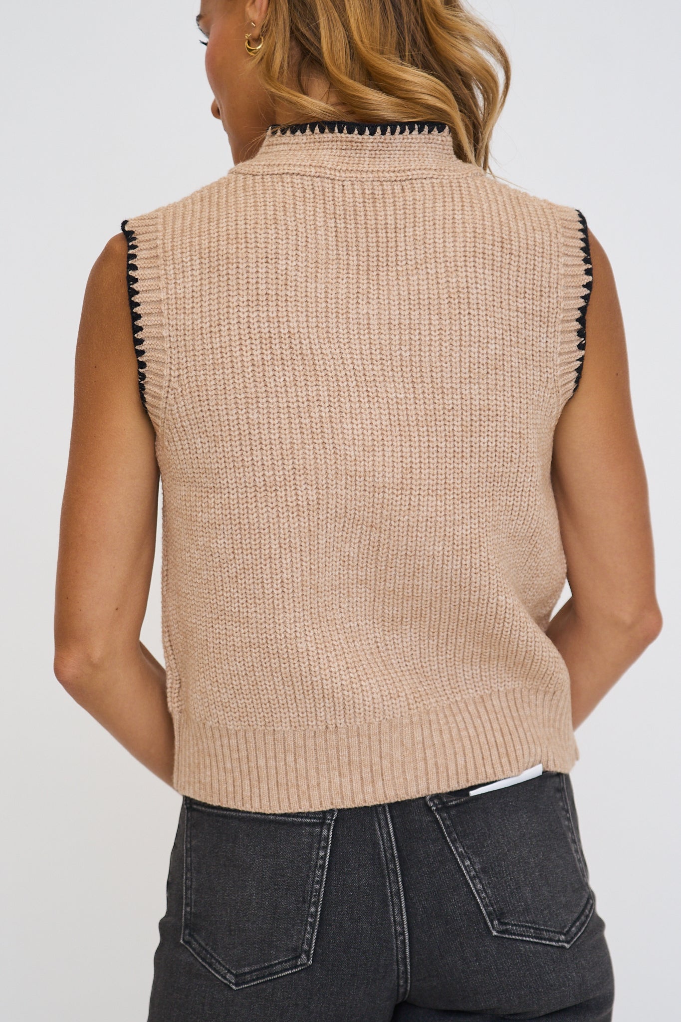 Solid sleeveless sweater knit button front knot closure top featuring accent blanket stitch finish details. Unlined. Knit. Non-sheer. Lightweight.
