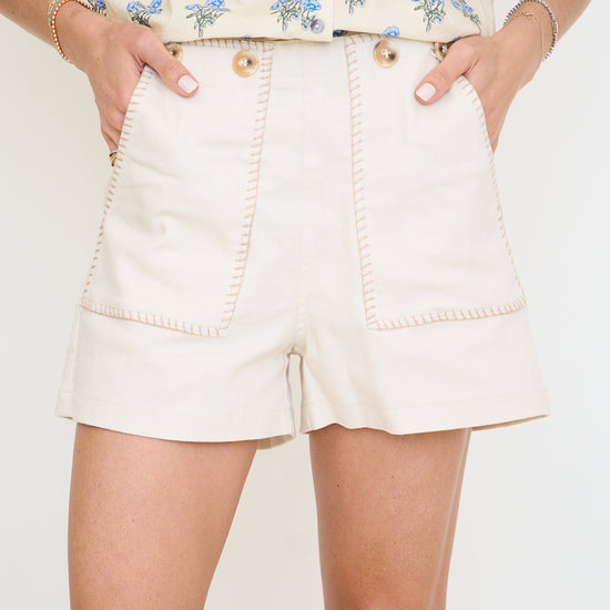 Solid high-waist shorts featuring contrast blanket stitch detailing and button accents at front. Hidden zip closure at front. Decorative tab detail at back waist. Front and back pockets. Unlined. Woven. Non-sheer. Lightweight.