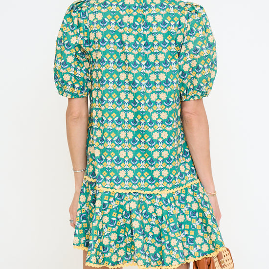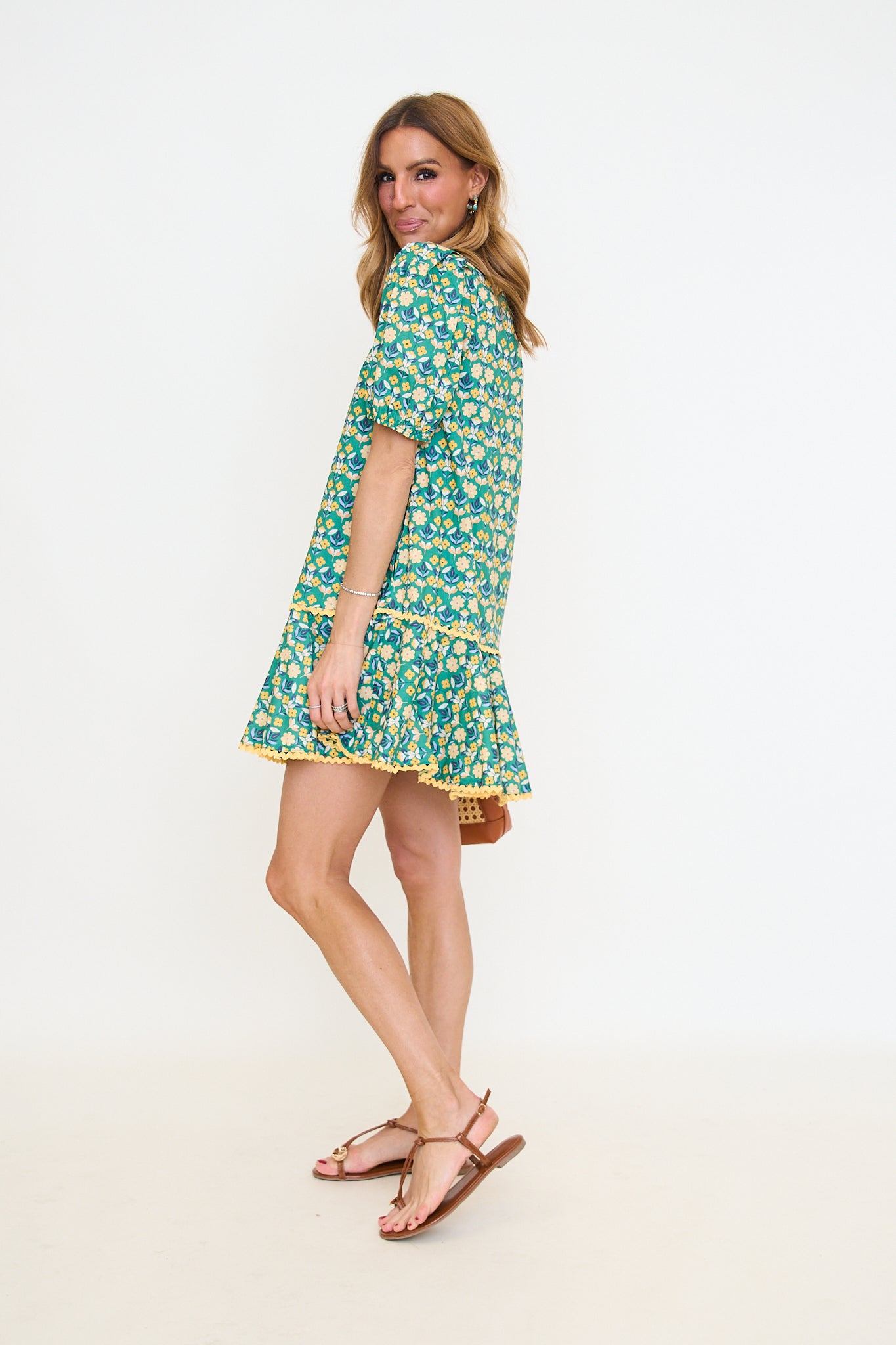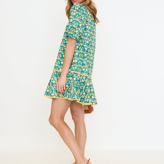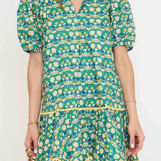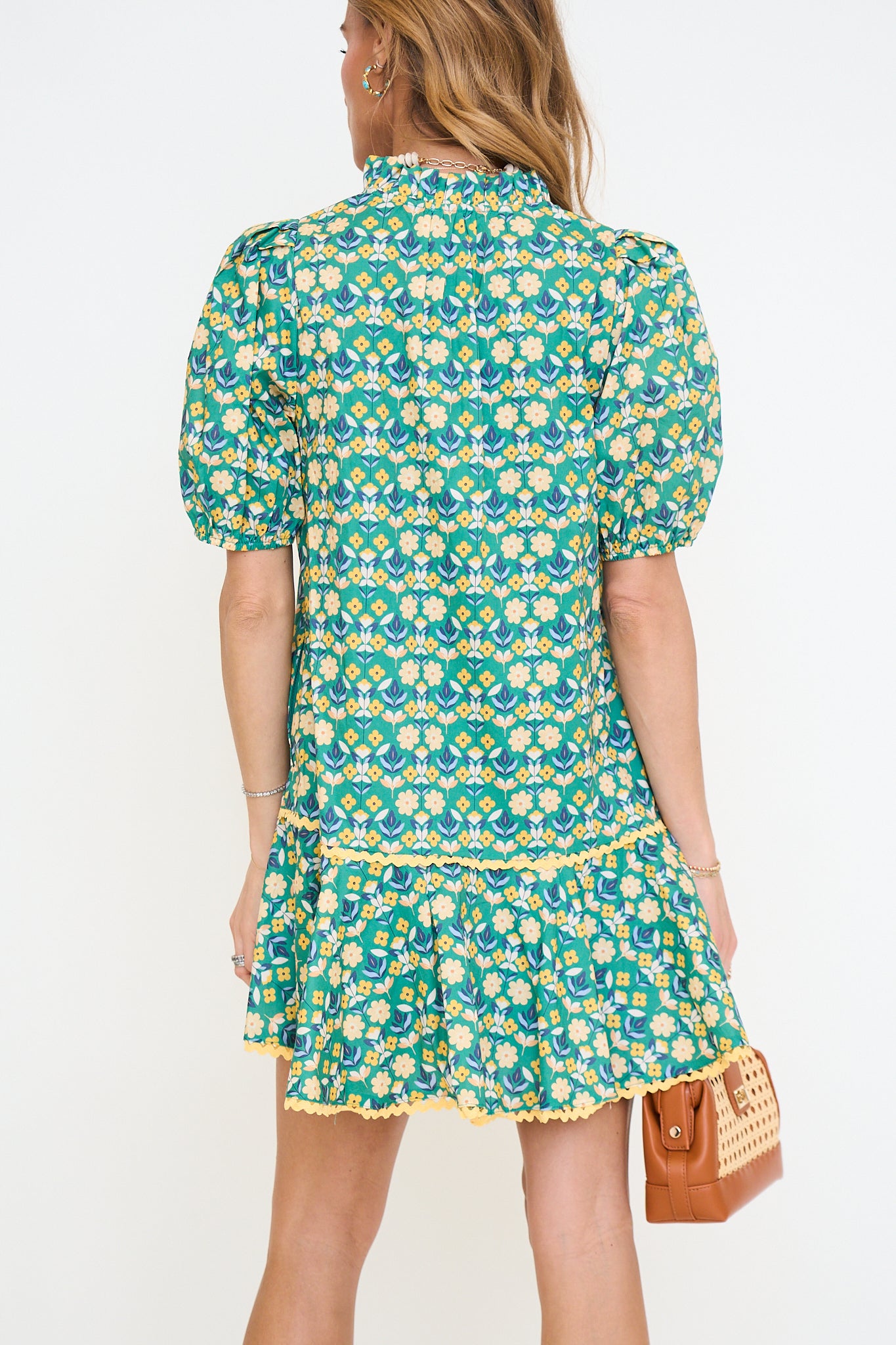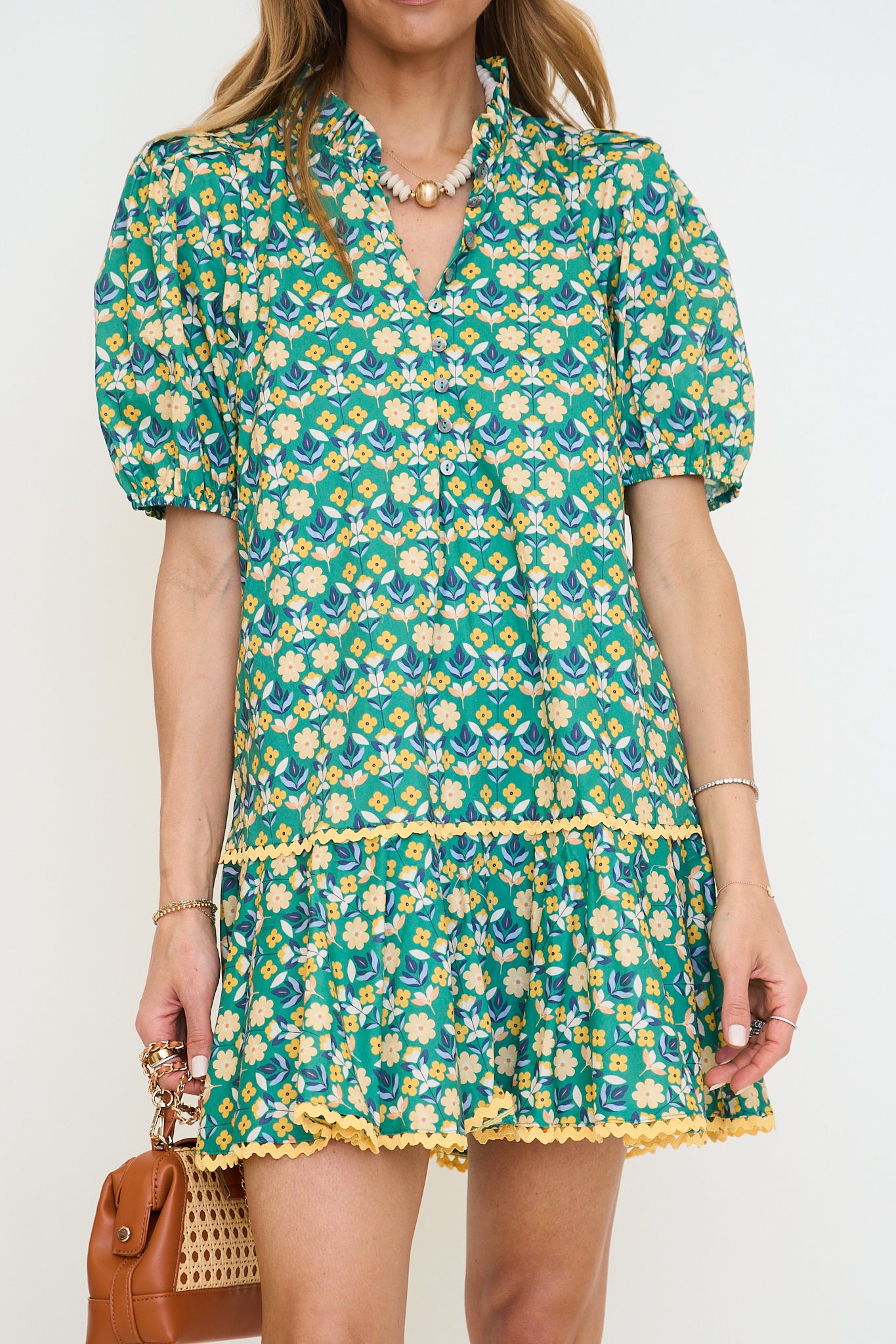 Floral print short puff sleeve mini dress featuring button closure at front. Side pockets. Lined. Woven. Non-sheer. Lightweight.