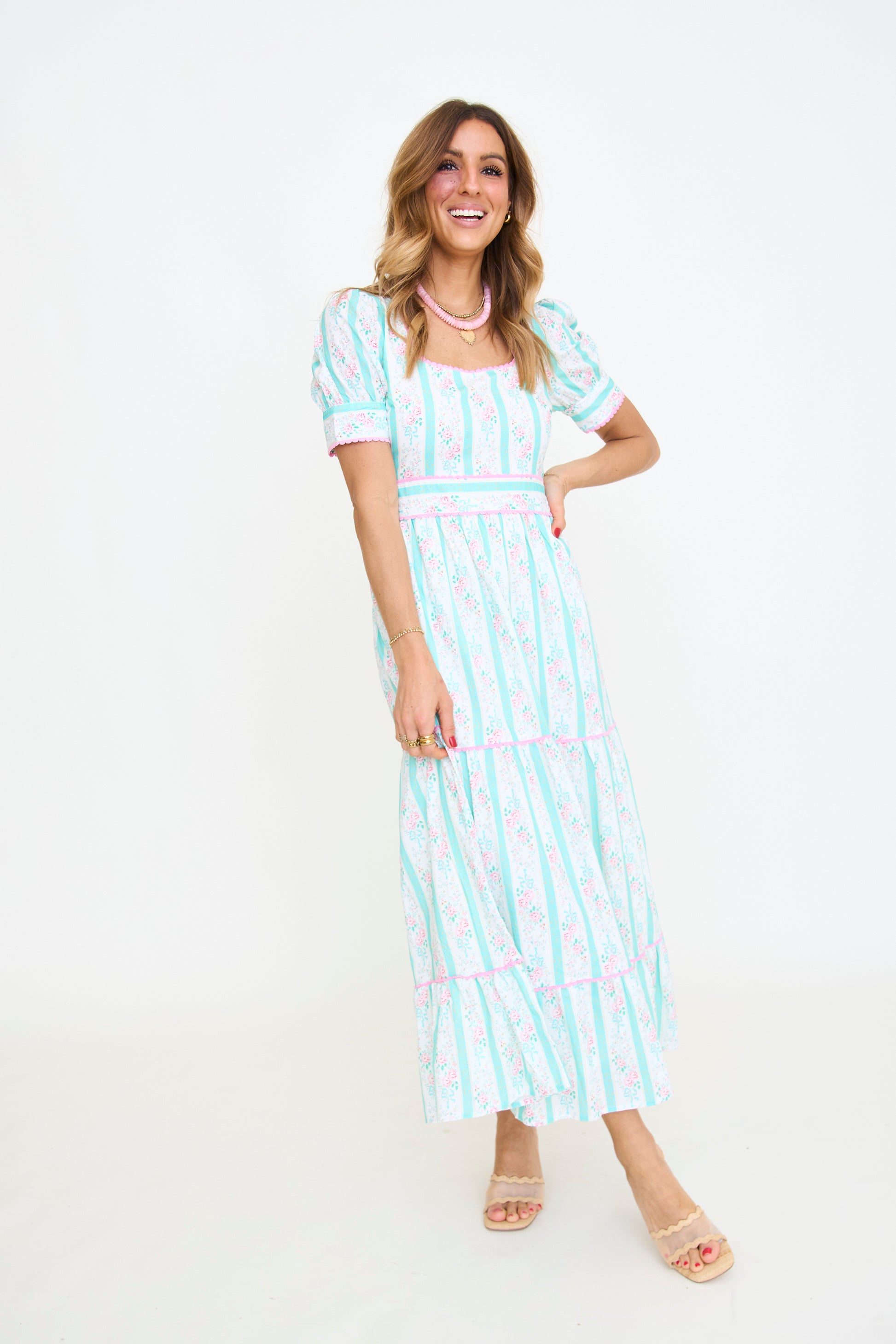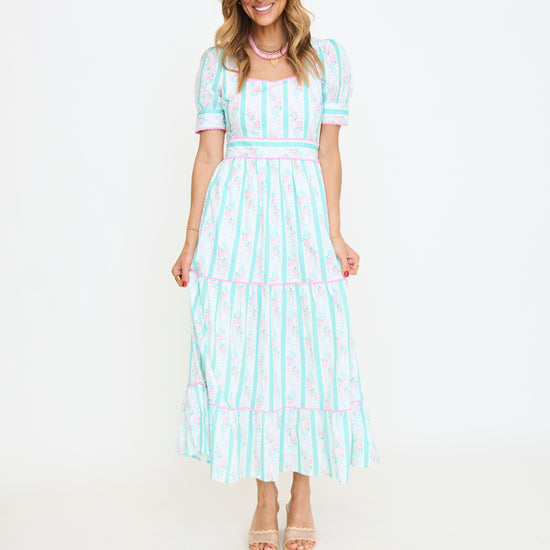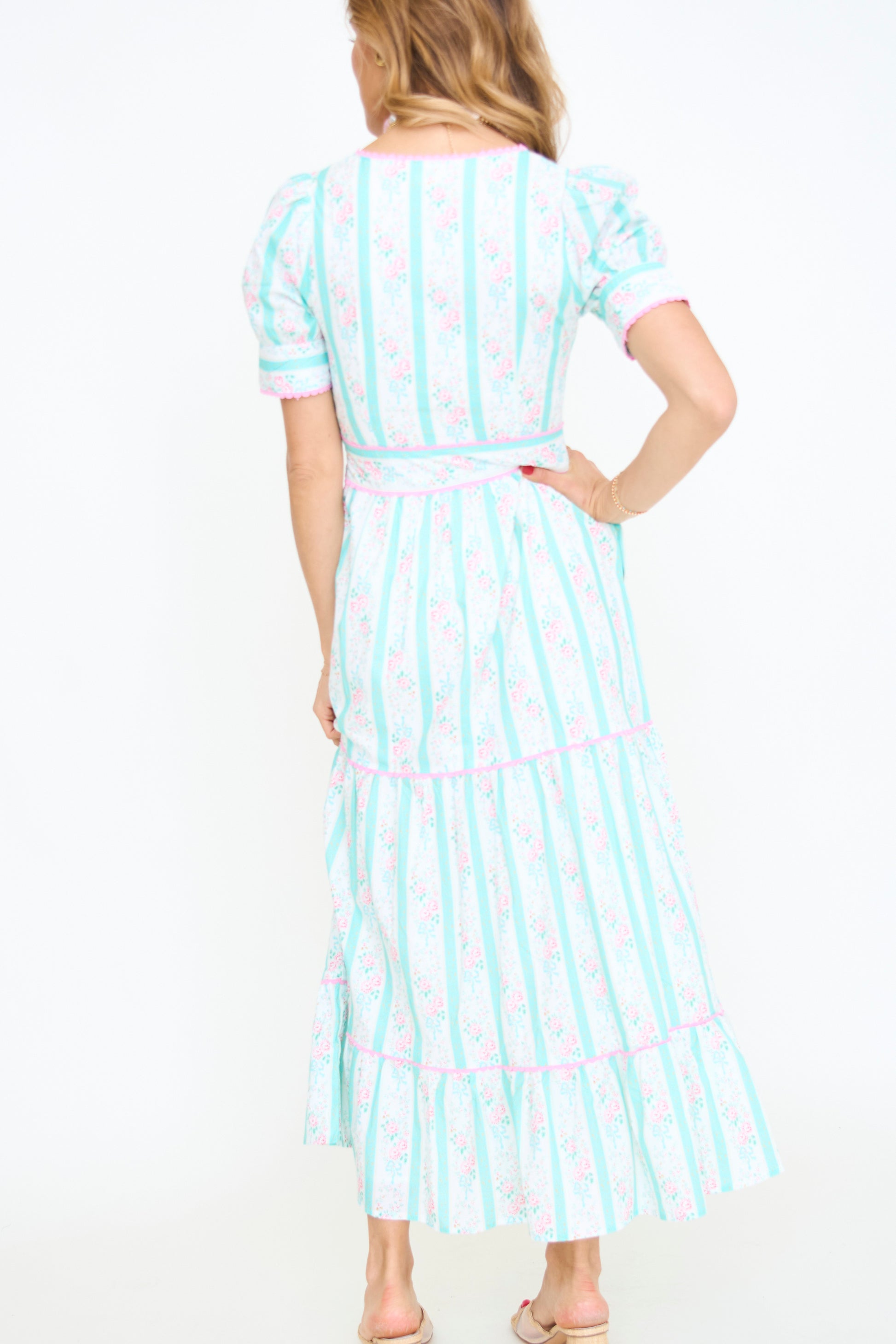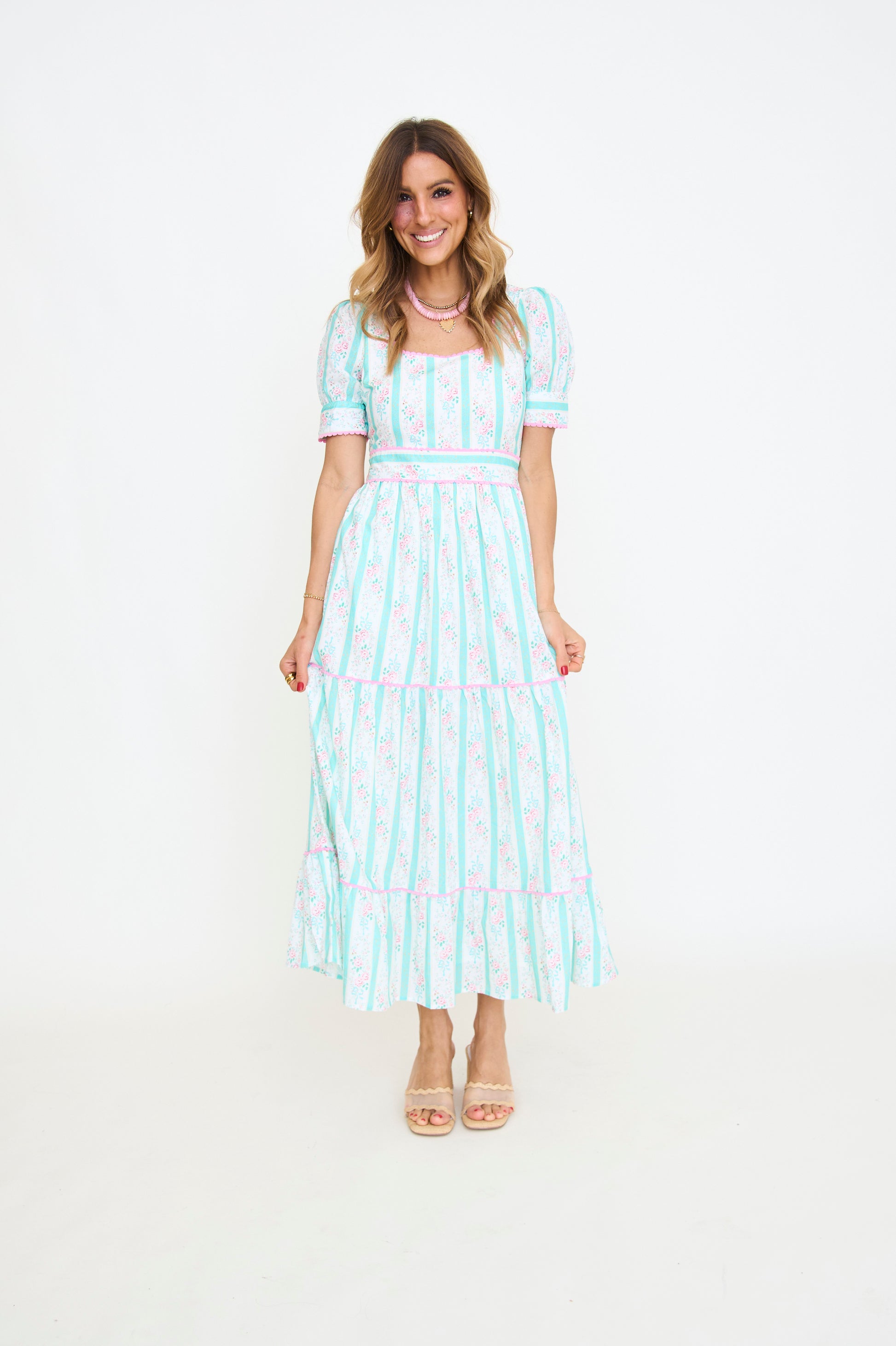 Striped floral midi dress with a cinched waist, puffed sleeves, hidden zipper, and full lining.