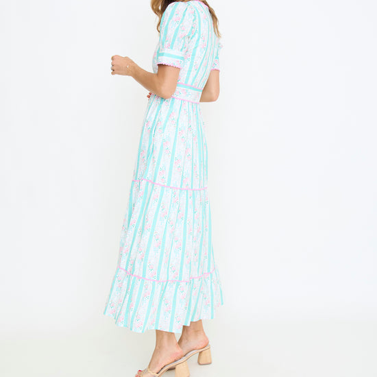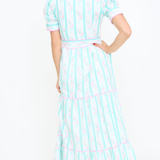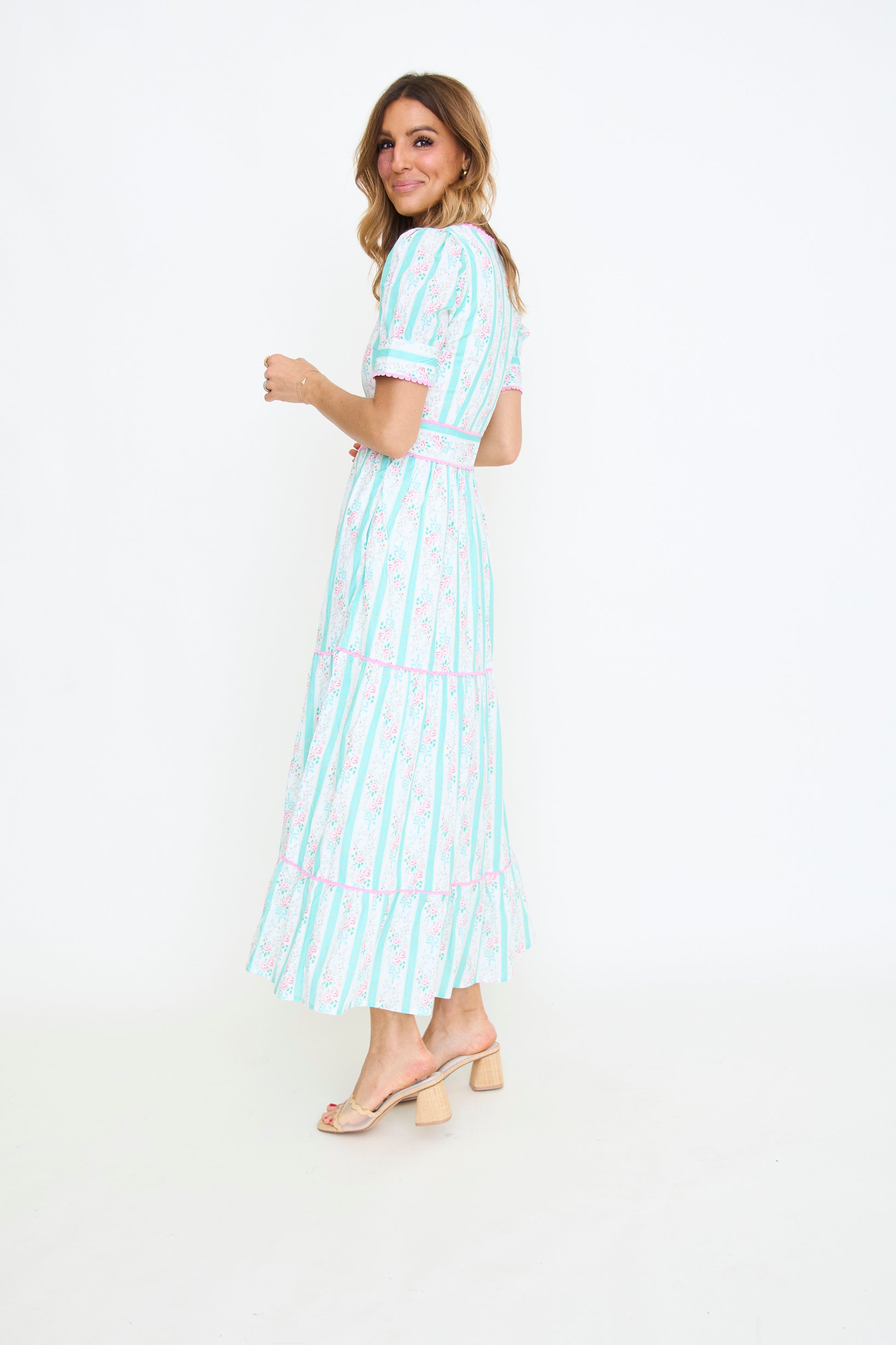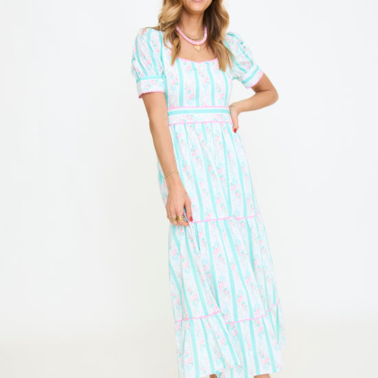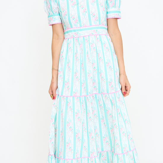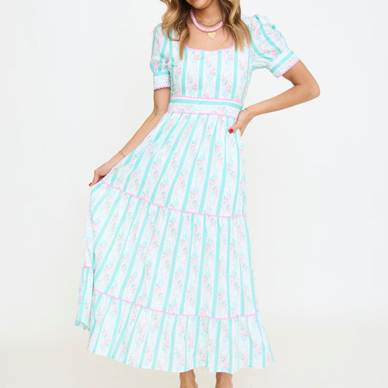 Striped floral midi dress with a cinched waist, puffed sleeves, hidden zipper, and full lining.