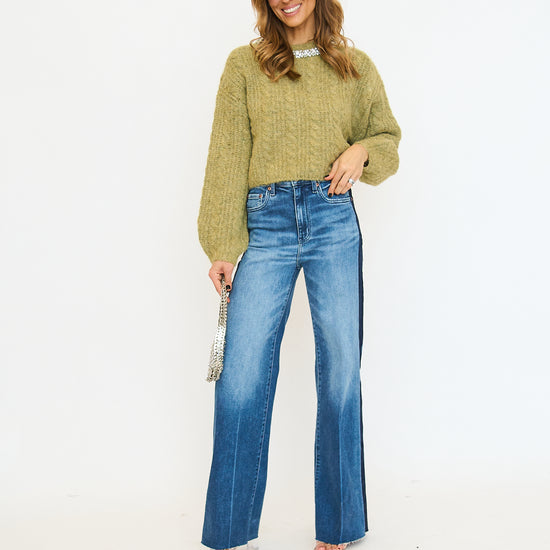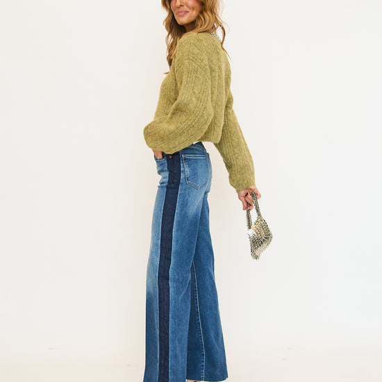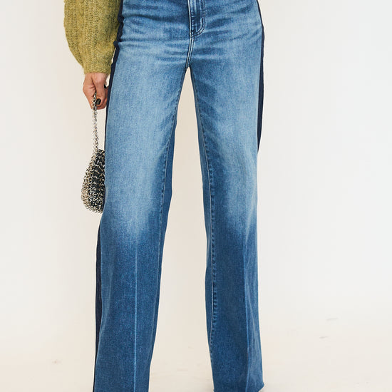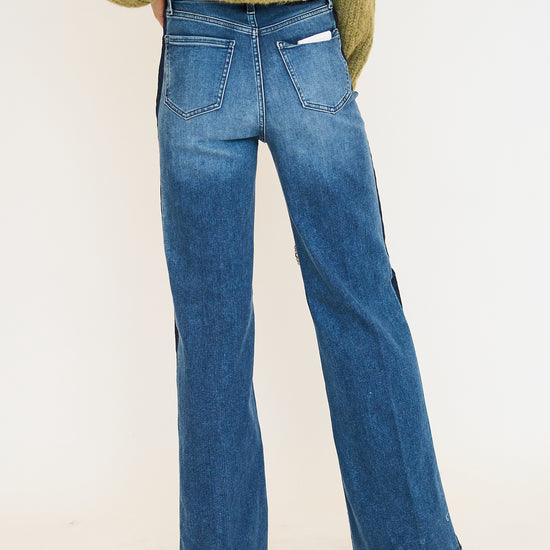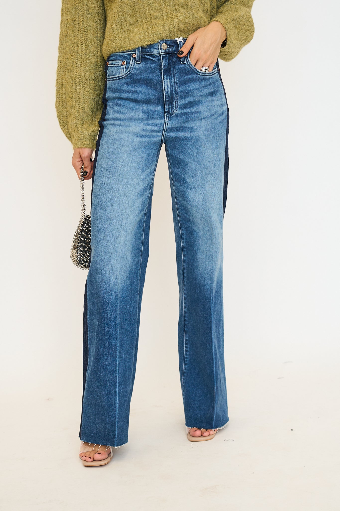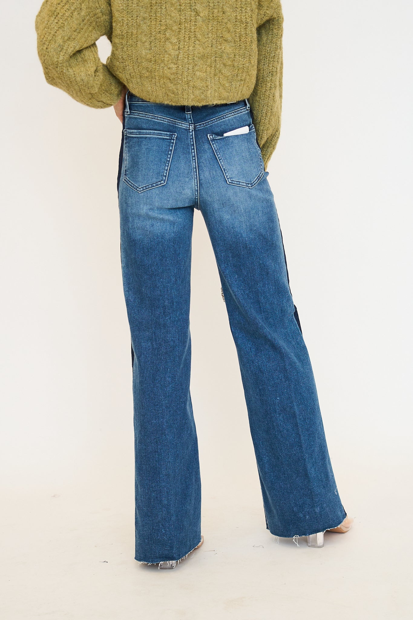 The cool girl jean just got even cooler, Far Out is a modern silhouette with black Tuxedo stripes across the sides of the legs for our take on denim tailored details. In a waist defining high rise, this wide leg is constructed in our "hug" denim that hugs your body, but has just enough weight to keep a structured fit.