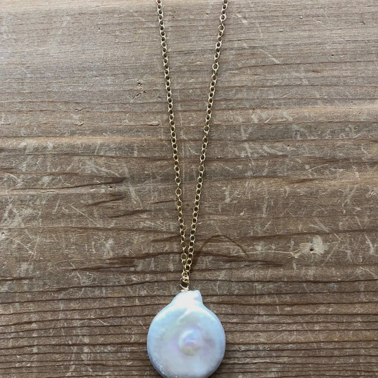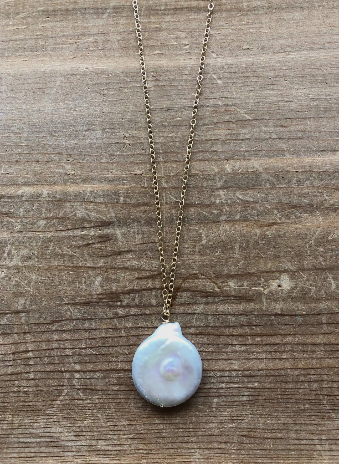 Shimmering Freshwater Coin Pearl on long delicate 14k gold filled chain. Total chain length 22", with clasp.
