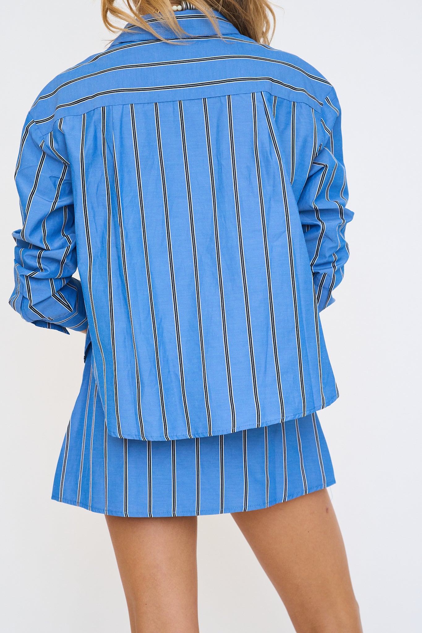 Button-up shirt with long sleeves, buttoned cuffs, front pocket, and side slits. Matching high-waisted mini skort with front button detail. Lining.
