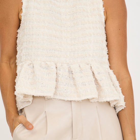 Frayed textured fabric sleeveless babydoll peplum tank top with back button keyhole closure. Lining.