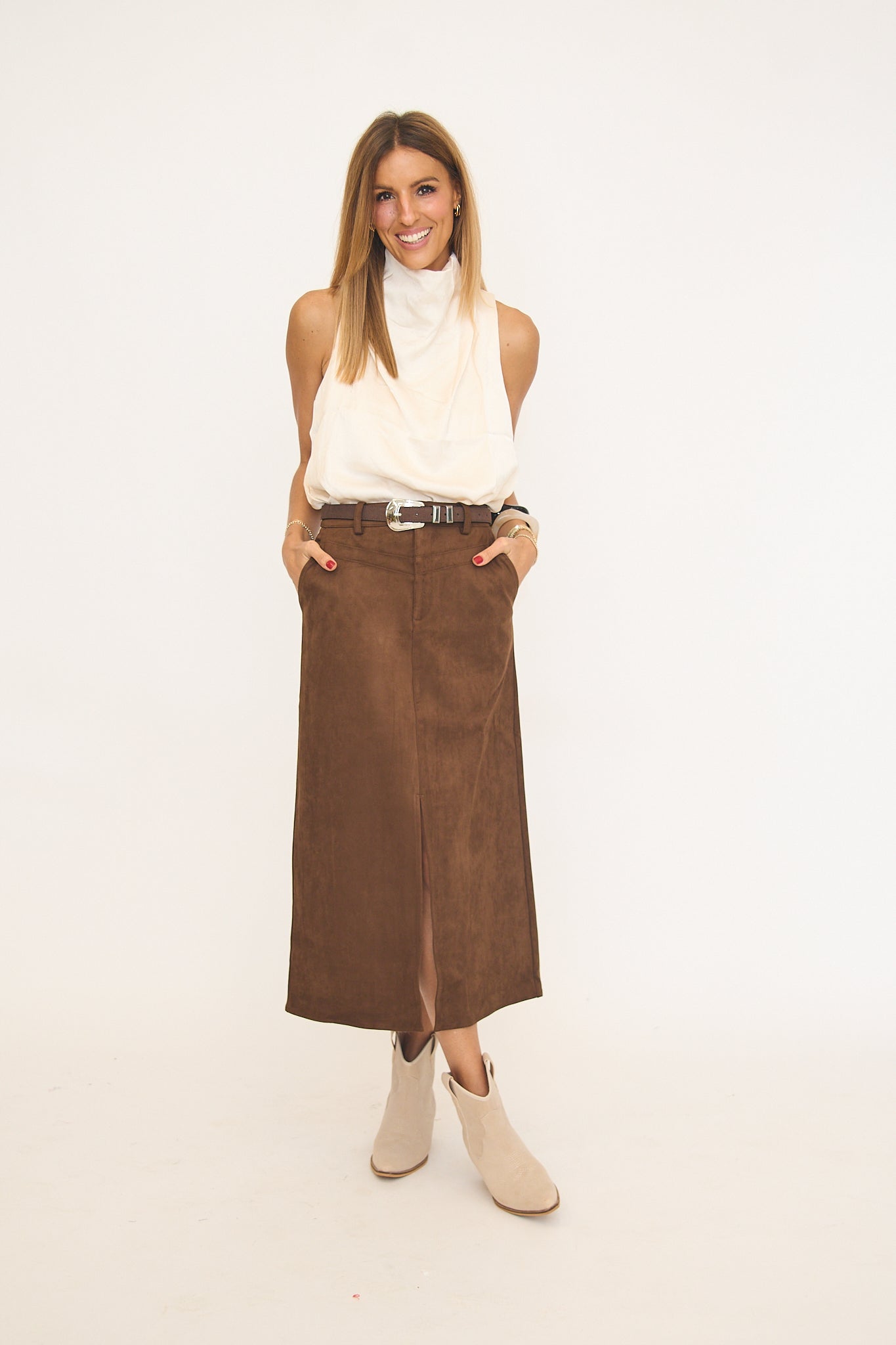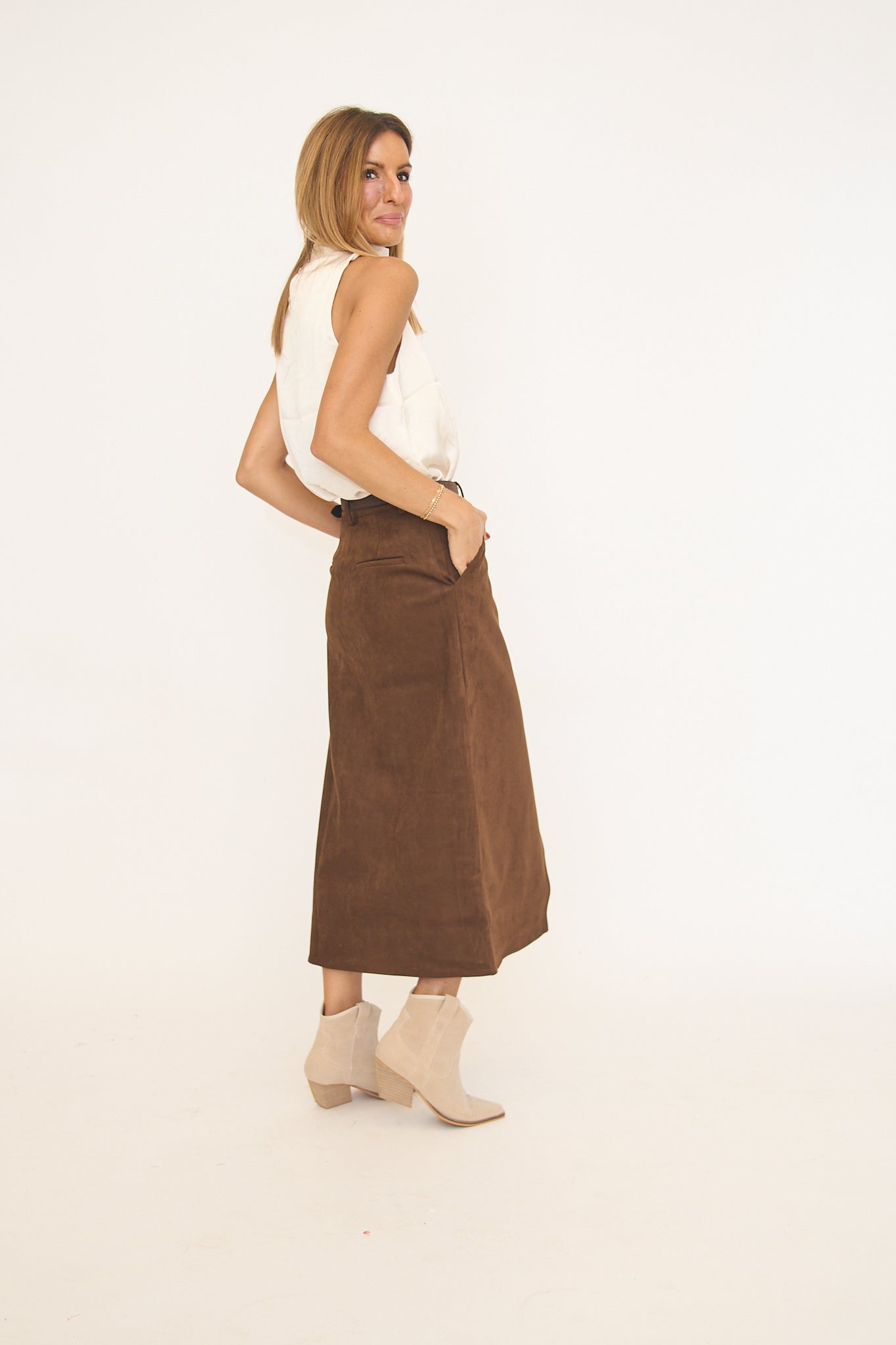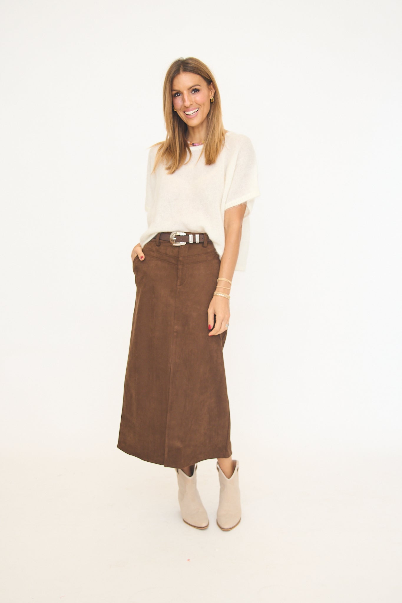 A sleek midi skirt in a rich chocolate brown faux suede with a front slit for ease of movement. Tailored with clean lines, it’s a versatile staple for both work and weekend!