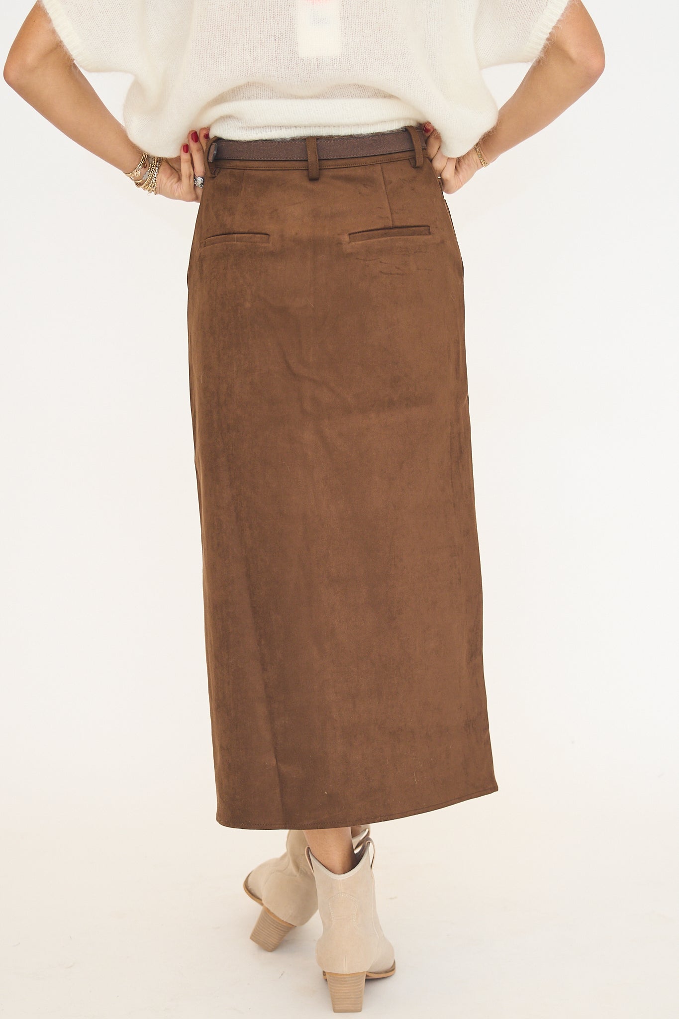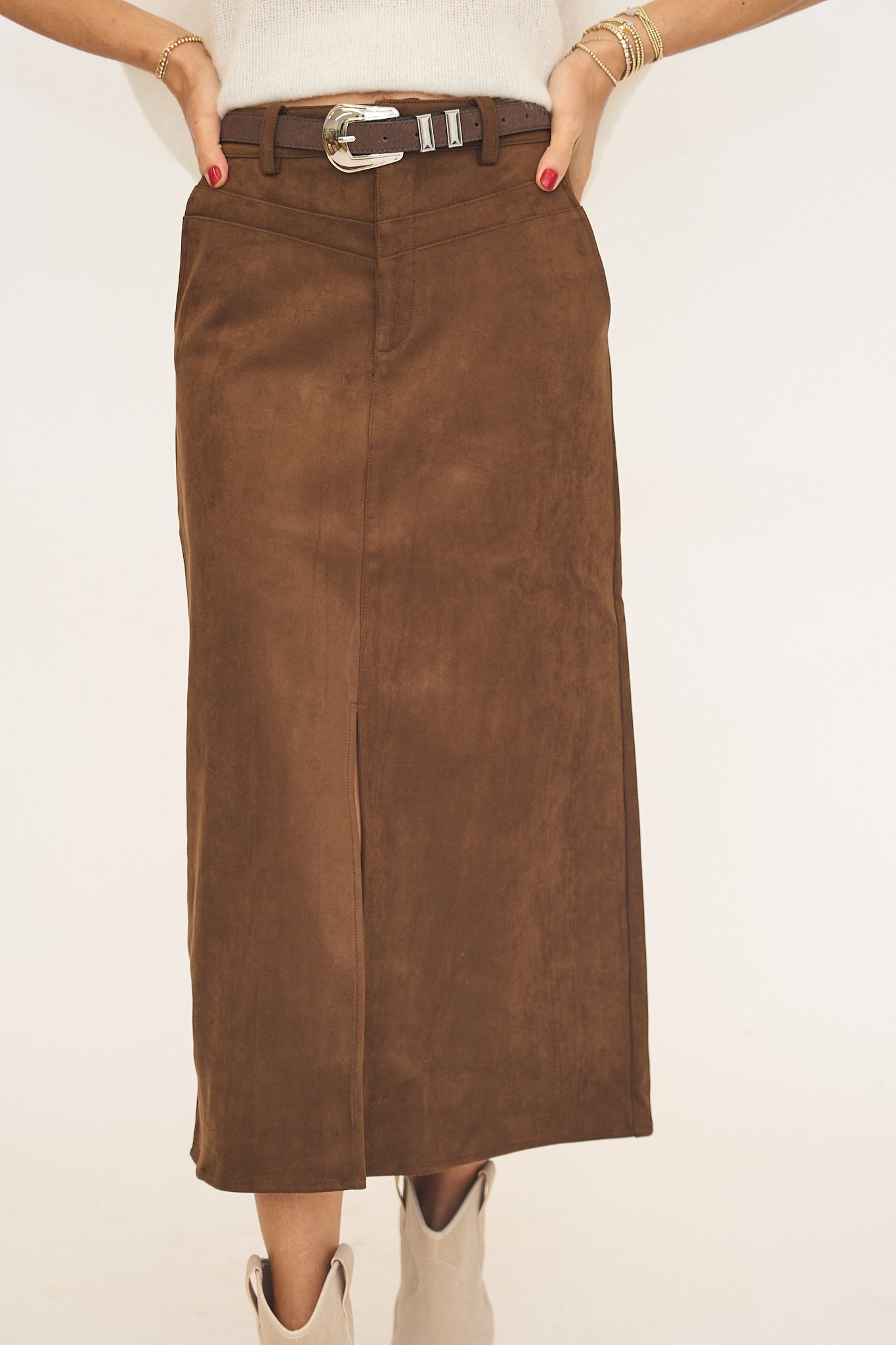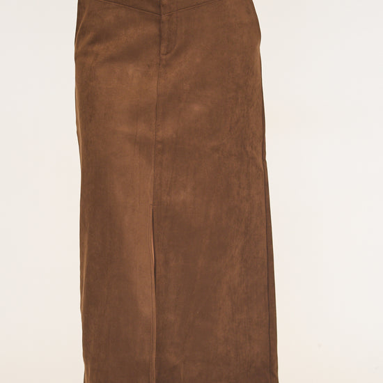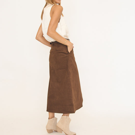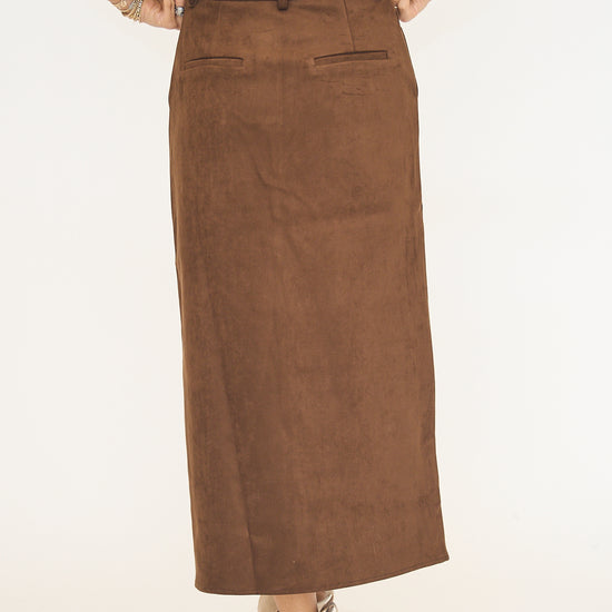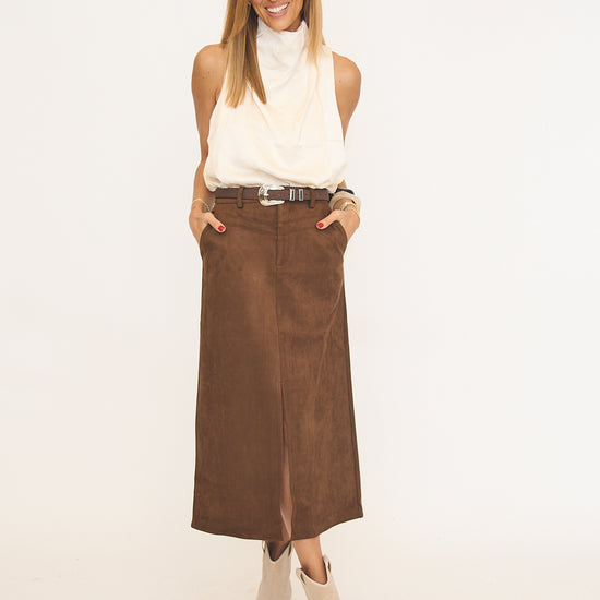 A sleek midi skirt in a rich chocolate brown faux suede with a front slit for ease of movement. Tailored with clean lines, it’s a versatile staple for both work and weekend!