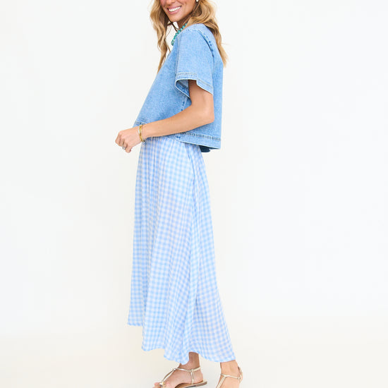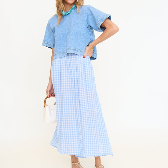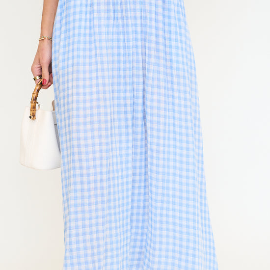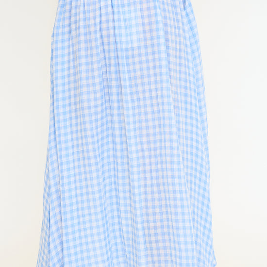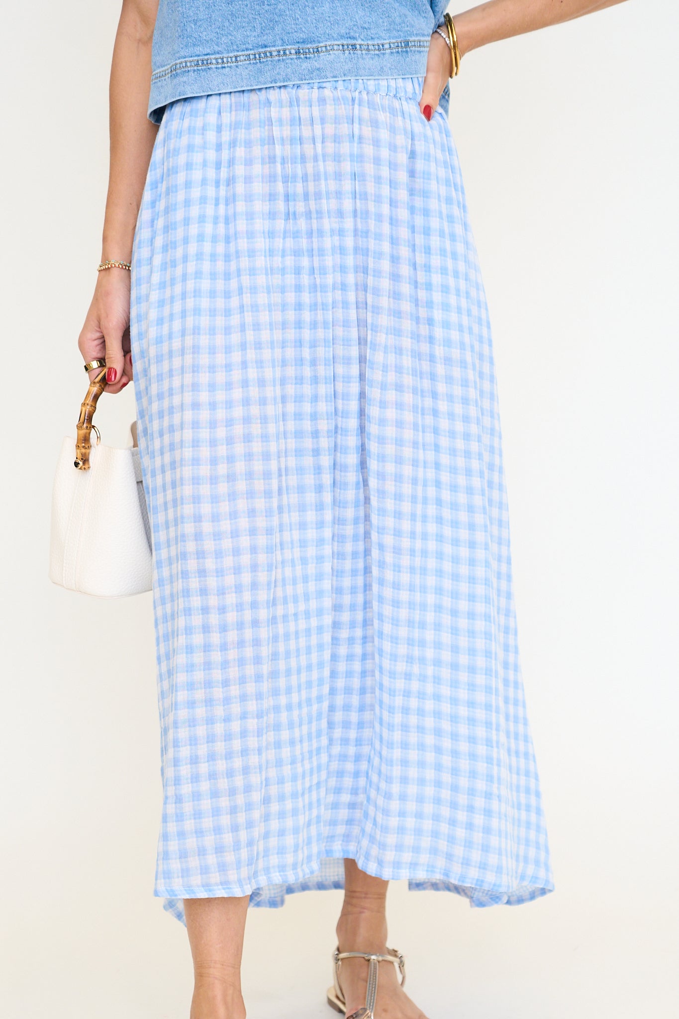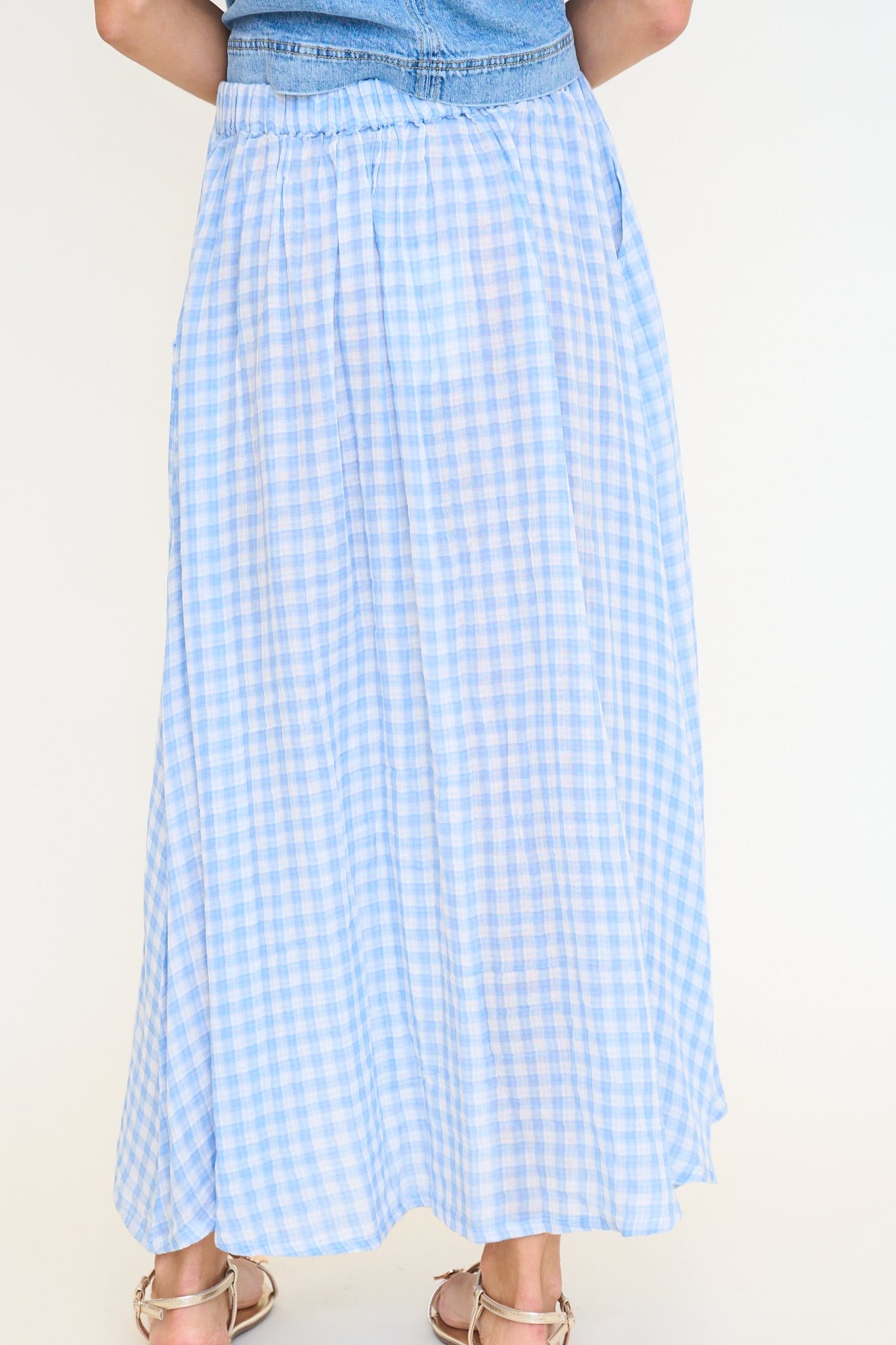 Long blue and white gingham check cotton skirt with elasticated waist.