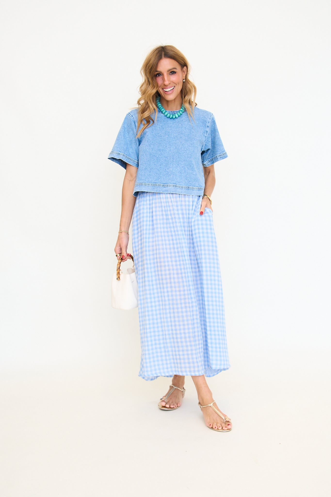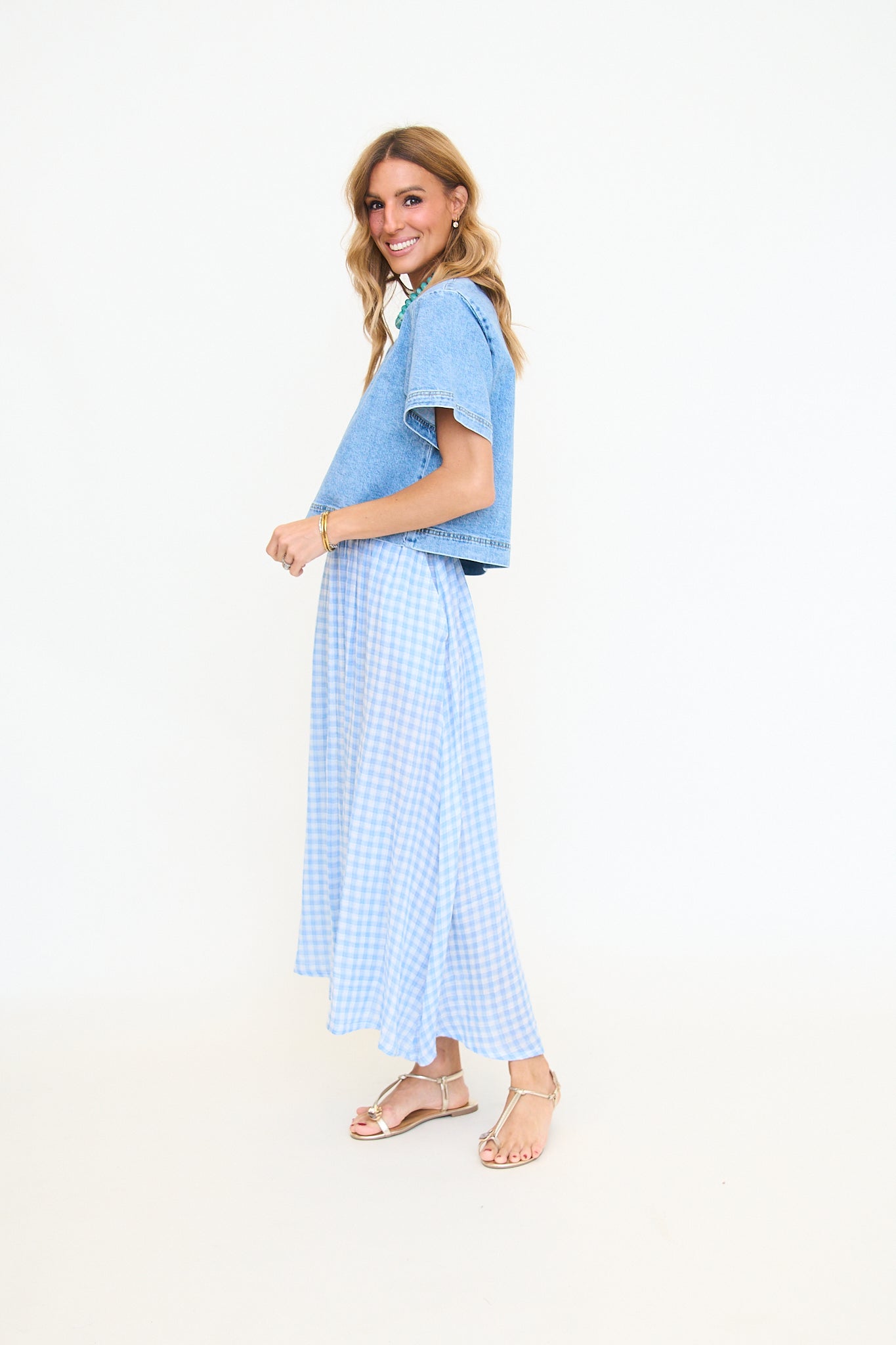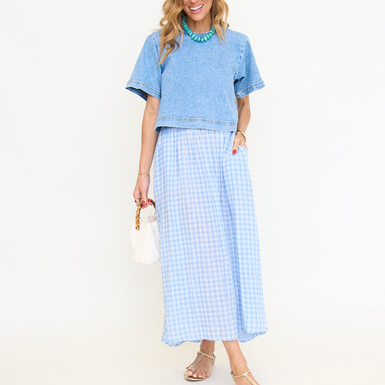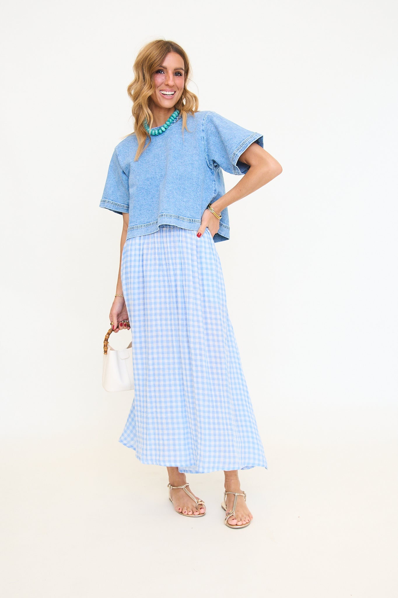 Long blue and white gingham check cotton skirt with elasticated waist.