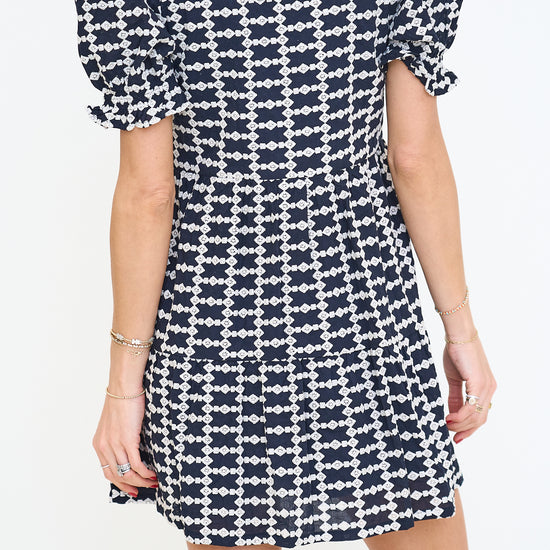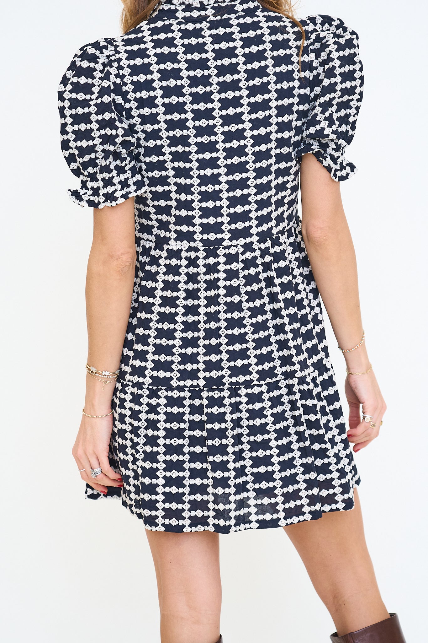 Navy Embroidered Mini Dress combines bold geometric patterns with charming details that make it perfect for any occasion. The hidden button front keeps things sleek while the mock neckline and puffed sleeves with ruffled trim add a touch of whimsy. A tiered skirt gives you that effortlessly flowy, feminine vibe without sacrificing style.