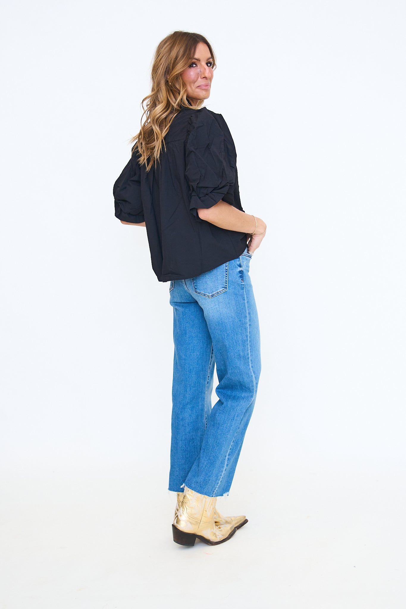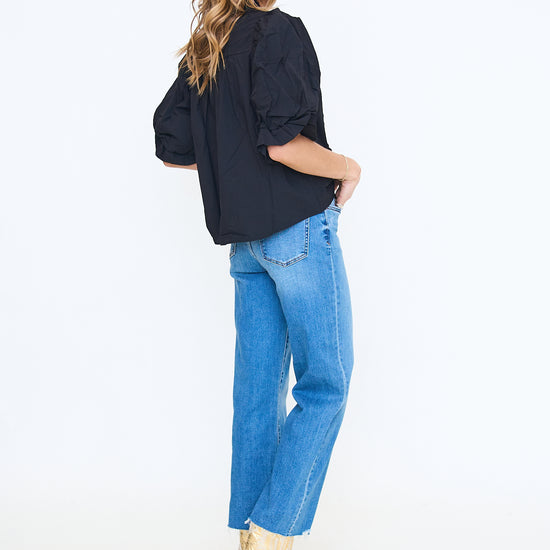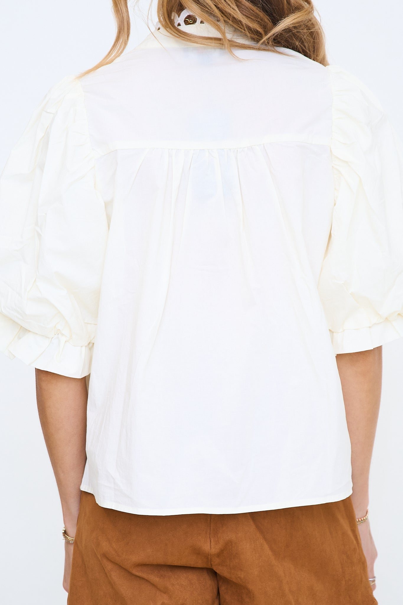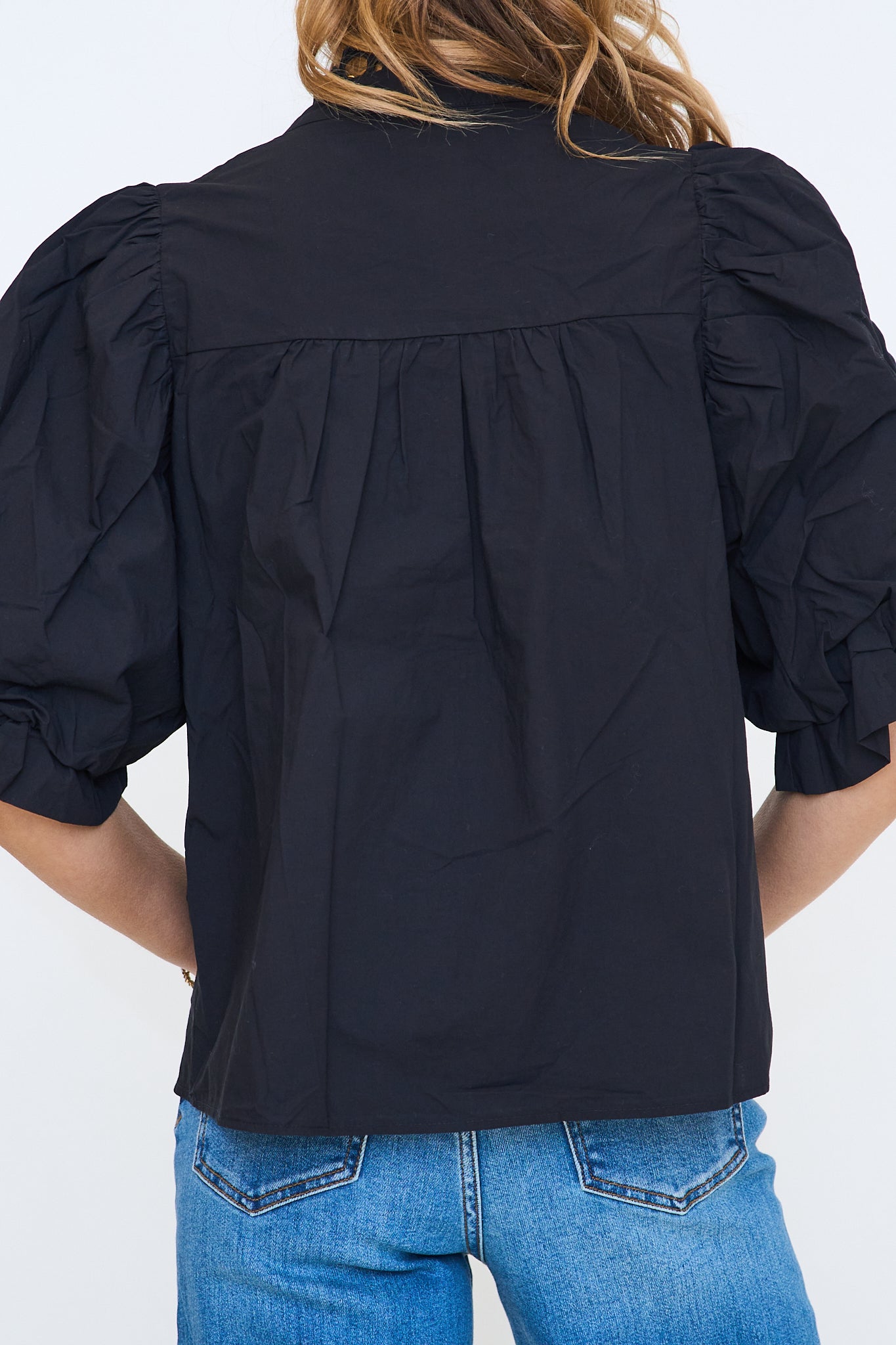 Trim Detail Button Down Blouse with 3/4 Length Gathered Balloon Sleeves